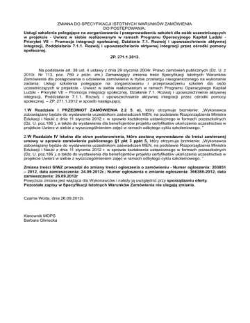 ZMIANA DO SPECYFIKACJI ISTOTNYCH WARUNKÓW ZAMÓWIENIA DO POSTĘPOWANIA: Usługi szkolenia polegające na zorganizowaniu i przeprowadzeniu szkoleń dla osób uczestniczących w projekcie - Uwierz w siebie realizowanym w ramach Programu Operacyjnego Kapitał Ludzki Priorytet VII – Promocja integracji społecznej, Działanie 7.1. Rozwój i upowszechnienie aktywnej integracji, Poddziałanie 7.1.1. Rozwój i upowszechnianie aktywnej integracji przez ośrodki pomocy społecznej. ZP. 271.1.2012. Na podstawie art. 38 ust. 4 ustawy z dnia 29 stycznia 2004r. Prawo zamówień publicznych (Dz. U. z 2010r. Nr 113, poz. 759 z późn. zm.) Zamawiający zmienia treść Specyfikacji Istotnych Warunków Zamówienia dla postępowania o udzielenie zamówienia w trybie przetargu nieograniczonego na wykonanie zadania: Usługi szkolenia polegające na zorganizowaniu i przeprowadzeniu szkoleń dla osób uczestniczących w projekcie - Uwierz w siebie realizowanym w ramach Programu Operacyjnego Kapitał Ludzki - Priorytet VII – Promocja integracji społecznej, Działanie 7.1. Rozwój i upowszechnienie aktywnej integracji, Poddziałanie 7.1.1. Rozwój i upowszechnianie aktywnej integracji przez ośrodki pomocy społecznej. – ZP. 271.1.2012 w sposób następujący: 1.W Rozdziale I PRZEDMIOT ZAMÓWIENIA 2.2 5. e), który otrzymuje brzmienie: „Wykonawca zobowiązany będzie do wystawienia uczestnikom zaświadczeń MEN, na podstawie Rozporządzenia Ministra Edukacji i Nauki z dnia 11 stycznia 2012 r. w sprawie kształcenia ustawicznego w formach pozaszkolnych (Dz. U. poz.186 ), a także do wystawienia dla beneficjentów projektu certyfikatów ukończenia uczestnictwa w projekcie Uwierz w siebie z wyszczególnieniem zajęć w ramach odbytego cyklu szkoleniowego. ” 2.W Rozdziale IV Istotne dla stron postanowienia, które zostaną wprowadzone do treści zawieranej umowy w sprawie zamówienia publicznego §1 pkt 3 ppkt 5, który otrzymuje brzmienie: „Wykonawca zobowiązany będzie do wystawienia uczestnikom zaświadczeń MEN, na podstawie Rozporządzenia Ministra Edukacji i Nauki z dnia 11 stycznia 2012 r. w sprawie kształcenia ustawicznego w formach pozaszkolnych (Dz. U. poz.186 ), a także do wystawienia dla beneficjentów projektu certyfikatów ukończenia uczestnictwa w projekcie Uwierz w siebie z wyszczególnieniem zajęć w ramach odbytego cyklu szkoleniowego. ” Zmiana treści SIWZ prowadzi do zmiany treści ogłoszenia o zamówieniu - Numer ogłoszenia: 203851 – 2012, data zamieszczenia: 24.09.2012r.; Numer ogłoszenia o zmianie ogłoszenia: 366388-2012, data zamieszczenia: 26.09.2012r Powyższa zmiana jest wiążąca dla Wykonawców i należy ją uwzględnić przy sporządzaniu oferty. Pozostałe zapisy w Specyfikacji Istotnych Warunków Zamówienia nie ulegają zmianie. Czarna Woda, dnia 26.09.2012r. Kierownik MOPS Barbara Gliniecka
