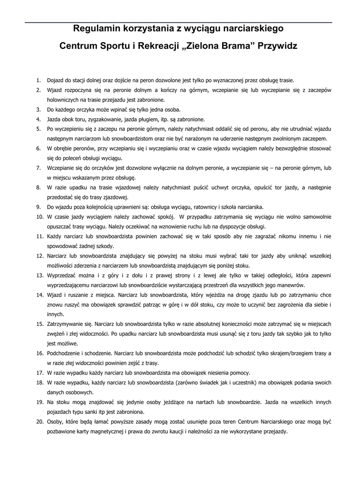 Regulamin korzystania z wyciągu narciarskiego Centrum Sportu i Rekreacji „Zielona Brama” Przywidz 1. Dojazd do stacji dolnej oraz dojście na peron dozwolone jest tylko po wyznaczonej przez obsługę trasie. 2. Wjazd rozpoczyna się na peronie dolnym a kończy na górnym, wczepianie się lub wyczepianie się z zaczepów holowniczych na trasie przejazdu jest zabronione. 3. Do każdego orczyka może wpinać się tylko jedna osoba. 4. Jazda obok toru, zygzakowanie, jazda pługiem, itp. są zabronione. 5. Po wyczepieniu się z zaczepu na peronie górnym, należy natychmiast oddalić się od peronu, aby nie utrudniać wjazdu następnym narciarzom lub snowboardzistom oraz nie być narażonym na uderzenie następnym zwolnionym zaczepem. 6. W obrębie peronów, przy wczepianiu się i wyczepianiu oraz w czasie wjazdu wyciągiem należy bezwzględnie stosować się do poleceń obsługi wyciągu. 7. Wczepianie się do orczyków jest dozwolone wyłącznie na dolnym peronie, a wyczepianie się – na peronie górnym, lub w miejscu wskazanym przez obsługę. 8. W razie upadku na trasie wjazdowej należy natychmiast puścić uchwyt orczyka, opuścić tor jazdy, a następnie przedostać się do trasy zjazdowej. 9. Do wjazdu poza kolejnością uprawnieni są: obsługa wyciągu, ratownicy i szkoła narciarska. 10. W czasie jazdy wyciągiem należy zachować spokój. W przypadku zatrzymania się wyciągu nie wolno samowolnie opuszczać trasy wyciągu. Należy oczekiwać na wznowienie ruchu lub na dyspozycje obsługi. 11. Każdy narciarz lub snowboardzista powinien zachować się w taki sposób aby nie zagrażać nikomu innemu i nie spowodować żadnej szkody. 12. Narciarz lub snowboardzista znajdujący się powyżej na stoku musi wybrać taki tor jazdy aby uniknąć wszelkiej możliwości zderzenia z narciarzem lub snowboardzistą znajdującym się poniżej stoku. 13. Wyprzedzać można i z góry i z dołu i z prawej strony i z lewej ale tylko w takiej odległości, która zapewni wyprzedzającemu narciarzowi lub snowboardziście wystarczającą przestrzeń dla wszystkich jego manewrów. 14. Wjazd i ruszanie z miejsca. Narciarz lub snowboardzista, który wjeżdża na drogę zjazdu lub po zatrzymaniu chce znowu ruszyć ma obowiązek sprawdzić patrząc w górę i w dół stoku, czy może to uczynić bez zagrożenia dla siebie i innych. 15. Zatrzymywanie się. Narciarz lub snowboardzista tylko w razie absolutnej konieczności może zatrzymać się w miejscach zwężeń i złej widoczności. Po upadku narciarz lub snowboardzista musi usunąć się z toru jazdy tak szybko jak to tylko jest możliwe. 16. Podchodzenie i schodzenie. Narciarz lub snowboardzista może podchodzić lub schodzić tylko skrajem/brzegiem trasy a w razie złej widoczności powinien zejść z trasy. 17. W razie wypadku każdy narciarz lub snowboardzista ma obowiązek niesienia pomocy. 18. W razie wypadku, każdy narciarz lub snowboardzista (zarówno świadek jak i uczestnik) ma obowiązek podania swoich danych osobowych. 19. Na stoku mogą znajdować się jedynie osoby jeżdżące na nartach lub snowboardzie. Jazda na wszelkich innych pojazdach typu sanki itp jest zabroniona. 20. Osoby, które będą łamać powyższe zasady mogą zostać usunięte poza teren Centrum Narciarskiego oraz mogą być pozbawione karty magnetycznej i prawa do zwrotu kaucji i należności za nie wykorzystane przejazdy.