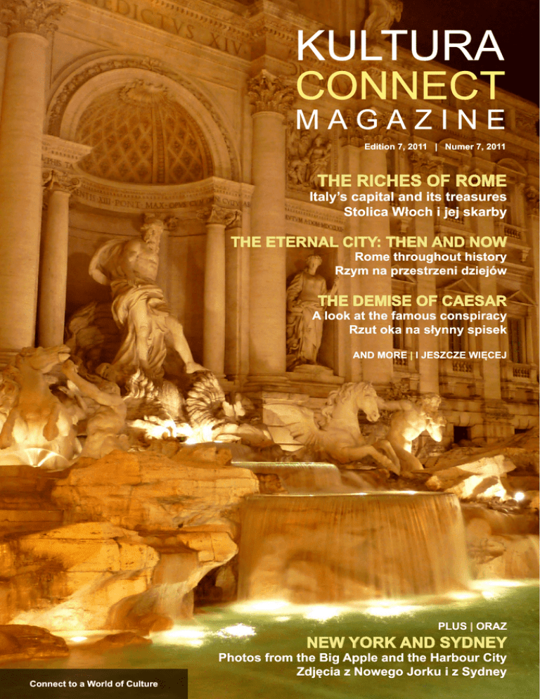KULTURA CONNECT MAGAZINE Edition 7, 2011 | Numer 7, 2011 THE RICHES OF ROME Italy’s capital and its treasures Stolica Włoch i jej skarby THE ETERNAL CITY: THEN AND NOW Rome throughout history Rzym na przestrzeni dziejów THE DEMISE OF CAESAR A look at the famous conspiracy Rzut oka na słynny spisek AND MORE | I JESZCZE WIĘCEJ PLUS | ORAZ NEW YORK AND SYDNEY Photos from the Big Apple and the Harbour City Zdjecia z Nowego Jorku i z Sydney Zdjęcia Connect to a World of Culture CONTENTS SPIS TREŚCI NEWS AND PERSPECTIVES WIADOMOŚCI I POGLĄDY 3 4 5 6 Calendar notes Notatki z kalendarza Speech notes Notatki z przemówień Helping a hungry world Pomoc dla głodnego świata (Tylko po angielsku) City of blinding lights Miasto pełne świateł ROME RZYM 15 6 10 10 13 15 18 22 24 Unravelling the Eternal City Odkrywanie Wiecznego Miasta Just desserts Same pyszności Classical stash Klasyczny skarbiec Poor reasons, fatal actions Słabe powody, śmiertelne akcje (Tylko po angielsku) A thing of beauty Rzecz piękna Where memories Rome Miasto wspomnień FEATURES REPORTAŻE 30 POETRY POEZJA 30 36 Castles on the Loire: Chambord Zamki nad Loarą: Chambord 38 34 Postcard from Trieste Pocztówka z Triestu (Only in Polish) WORLD VIEWS WIDOKI ZE ŚWIATA 35 36 38 Renommée in Paris Renommée w Paryżu Autumn’s annual visit Doroczna wizyta jesieni New York’s broth Rosół Nowojorski NEWS AND PERSPECTIVES Kultura Connect magazine is published by the Puls Polonii Cultural Foundation. The views expressed in this publication do not necessarily reflect the views of the Foundation. The magazine is a free, not-for-profit cultural work. Contribute Send your letters, articles and photos to [email protected] Editor Lukasz Swiatek Photographers Tomek Koprowski, Wojciech Ihnatowicz and Tomasz Swiatek Other Images Page 3: Czeslaw Milosz book cover, www.penguinbooksindia. com/upload/9780141186412.jpg; Amnesty International report, www. amnesty.org/en/library/asset/ AMR36/001/2011/en/57237fadf97b-45ce-8fdb-68cb457a304c/ amr360012011en.pdf; IBM logo, en.wikipedia.org/wiki/File:IBM_logo. svg; The Three Railway Engines book cover, childrensbookshop.com/ catalogue.php?cno=77405. Page 4: Russian Lubok, commons.wikimedia.org/wiki/ File:ChudoLesnoye.jpg; Image Number K4690-10, by Jack Dykinga, Agricultural Research Service, www. ars.usda.gov/is/graphics/photos/ k4690-10.htm; Image Number K8932-1, by Scott Bauer, Agricultural Research Service, www.ars.usda.gov/ is/graphics/photos/jul00/k8932-1. htm; Shahname image, commons. wikimedia.org/wiki/File:Big-Head_ Shahname.jpg. Page 5: Photo of John A. Kufuor, by Office of John A. Kufuor, www.worldfoodprize.org/en/ laureates/2011_laureates/; photo of Luiz Inacio Lula da Silva, by Ricardo Stuckert, www.worldfoodprize.org/ en/laureates/2011_laureates/; the World Food Prize Sculpture, photo by the World Food Prize Foundation, www.worldfoodprize.org/en/about_ the_prize/the_sculpture/. Pages 20-21: Julius Caesar by Nicolas Coustou, commons.wikimedia.org/ wiki/File:Julius_Caesar_Coustou_ Louvre_MR1798.jpg; Mort de César by Vincenzo Camuccini, en.wikipedia. org/wiki/File:Cesar-sa_mort.jpg. Pages 22-23: Sacra Culla, by Jastrow, it.wikipedia.org/wiki/File:Sacra_ culla_SM_Maggiore.jpg; Santa Scala, by MarkusMark, commons.wikimedia. org/wiki/File:211ScalaSanta.JPG; Tomb of Saint Paul, by Bocachete, commons.wikimedia.org/wiki/ File:San_Paolo3.jpg. The images on pages 3, 4 and 5 have been used for the purposes of reporting news. Cover Photo The Trevi Fountain, Rome, Italy Contact Comments or questions should be addressed to [email protected] Calendar Notes Major dates and anniversaries from around the world Ważne daty i rocznice z całego świata Poet of the world When the Polish poet Czesław Miłosz won the Nobel Prize in Literature in 1980, he was praised for voicing humankind’s “exposed condition in a world of severe conflicts”. This year marks the 100th anniversary of the birth of Miłosz, who died in 2004. Kiedy polski poeta Czesław Miłosz otrzymał Nagrodę Nobla w dziedzinie literatury w 1980 roku, zdobył uznanie za przedstawianie ludzkości „w stanie zagrożenia w świecie poważnych konfliktów”. W tym roku mija 100 rocznica urodzin Miłosza, który zmarł w 2004 roku. Still fighting at 50 The international nongovernment organisation Amnesty International, which turned 50 this month, fights for human rights around the world. Its logo was inspired by the Chinese proverb: “It is better to light a candle than to curse the darkness.” Międzynarodowa organizacja pozarządowa Amnesty International, która skończyła 50 lat w tym miesiącu, walczy o prawa człowieka na całym świecie. Jej logo zostało zainspirowane przez chińskie przysłowie: „Lepiej zapalić świeczkę niż przeklinać ciemności.” Centenary of invention The American corporation known as ‘Big Blue’ began its life in 1911 as the Computing Tabulating Recording Corporation. Thank goodness it changed its name to IBM (International Business Machines) in 1924. Among the IT firm’s inventions are floppy disks and ATMs. Amerykańska korporacja znana jako „Big Blue” rozpoczęła swój żywot w 1911r. jako Computing Tabulating Recording Corporation. Całe szczęście, że zmieniła swoją nazwę na IBM (International Business Machines) w 1924 roku. Wśród wynalazków tej firmy są dyskietki i bankomaty. Father of a locomotive As you might expect, Thomas the Tank Engine was the invention of a railway enthusiast: an Englishman by the name of Wilbert Vere Awdry. An Anglican priest, Awdry was born a century ago and died in 1997. His books were turned into a popular TV show in 1984. Jak można się domyślać, Parowóz Tomek był wymyślony przez entuzjastę kolei: Anglika o nazwisku Wilbert Vere Awdry. Ten anglikański pastor urodził się sto lat temu, a zmarł w 1997 roku. Jego książki zostały zaadaptowane na serial telewizyjny w 1984 roku. KULTURA CONNECT | 3 NEWS AND PERSPECTIVES Speech Notes