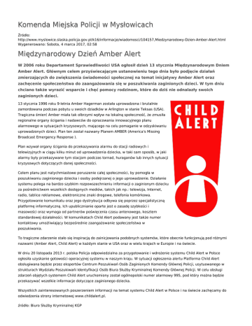 Komenda Miejska Policji w Mysłowicach Źródło: http://www.myslowice.slaska.policja.gov.pl/k16/informacje/wiadomosci/104157,Miedzynarodowy-Dzien-Amber-Alert.html Wygenerowano: Sobota, 4 marca 2017, 02:58 Międzynarodowy Dzień Amber Alert W 2006 roku Departament Sprawiedliwości USA ogłosił dzień 13 stycznia Międzynarodowym Dniem Amber Alert. Głównym celem przyświecającym ustanowieniu tego dnia było podjęcie działań zmierzających do zwiększenia świadomości społecznej na temat inicjatywy Amber Alert oraz zachęcenie społeczeństwa do zaangażowania się w poszukiwania zaginionych dzieci. W tym dniu chciano także wyrazić wsparcie i chęć pomocy rodzinom, które do dziś nie odnalazły swoich zaginionych dzieci. 13 stycznia 1996 roku 9-letnia Amber Hagerman została uprowadzona i brutalnie zamordowana podczas pobytu u swoich dziadków w Arlington w stanie Teksas (USA). Tragiczna śmierć Amber miała tak olbrzymi wpływ na lokalną społeczność, że zmusiła regionalne organy ścigania i nadawców do opracowania innowacyjnego planu alarmowego w sytuacjach kryzysowych, mającego na celu pomaganie w odzyskiwaniu uprowadzonych dzieci. Plan ten został nazwany Planem AMBER (America's Missing Broadcast Emergency Response ). Plan wzywał organy ścigania do przekazywania alarmu do stacji radiowych i telewizyjnych w ciągu kilku minut od uprowadzenia dziecka, w taki sam sposób, w jaki alarmy były przekazywane tym stacjom podczas tornad, huraganów lub innych sytuacji kryzysowych dotyczących danej społeczności. Celem planu jest natychmiastowe poruszenie całej społeczności, by pomogła w poszukiwaniu zaginionego dziecka i osoby podejrzanej o jego uprowadzenie. Działanie systemu polega na bardzo szybkim rozpowszechnieniu informacji o zaginionym dziecku za pośrednictwem wszelkich dostępnych mediów, takich jak np.: telewizja, Internet, radio, tablice reklamowe, elektroniczne znaki drogowe, telefonia komórkowa. Przygotowanie komunikatu oraz jego dystrybucja odbywa się poprzez specjalistyczną platformę informatyczną. Ich upublicznianie oparte jest o zasadę szybkości i masowości oraz wymaga od partnerów poświęcenia czasu antenowego, kosztem standardowej działalności. W komunikatach Child Alert podawany jest także numer kontaktowy umożliwiający bezpośrednie zaangażowanie społeczeństwa w poszukiwania. To tragiczne zdarzenie stało się inspiracją do zainicjowania podobnych systemów, które obecnie funkcjonują pod różnymi nazwami (Amber Alert, Child Alert) w każdym stanie w USA oraz w wielu krajach w Europie i na świecie. W dniu 20 listopada 2013 r. polska Policja odpowiedzialna za przygotowanie i wdrożenie systemu Child Alert w Polsce ogłosiła uzyskanie gotowości operacyjnej systemu w naszym kraju. W sytuacji ogłoszenia alertu Platforma Child Alert obsługiwana będzie przez ekspertów Centrum Poszukiwań Osób Zaginionych Komendy Głównej Policji, usytuowanego w strukturach Wydziału Poszukiwańi Identyfikacji Osób Biura Służby Kryminalnej Komendy Głównej Policji. W celu obsługi zdarzeń objętych systemem Child Alert uruchomiony został ogólnopolski numer alarmowy 995, pod który można będzie przekazywać wszelkie informacje dotyczące zaginionego dziecka. Wszystkich zainteresowanych poszerzeniem informacji na temat systemu Child Alert w Polsce i na świecie zachęcamy do odwiedzenia strony internetowej www.childalert.pl. źródło: Biuro Służby Kryminalnej KGP Ocena: 0/5 (0) Tweetnij