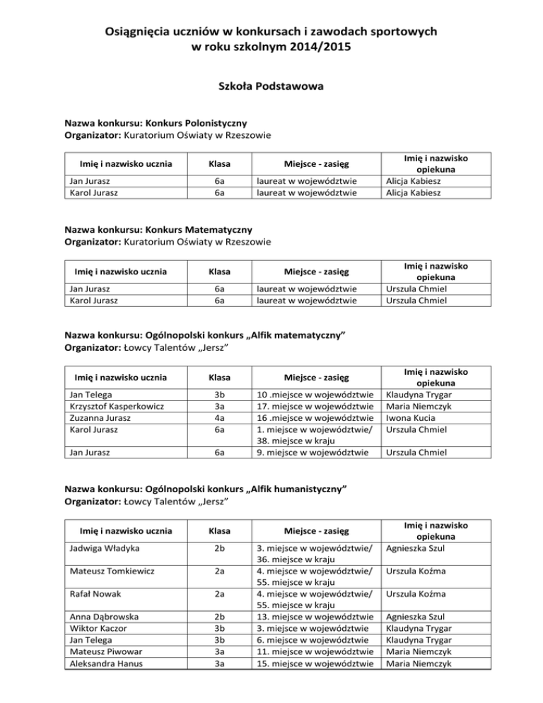 Osiągnięcia uczniów w konkursach i zawodach sportowych w roku szkolnym 2014/2015 Szkoła Podstawowa Nazwa konkursu: Konkurs Polonistyczny Organizator: Kuratorium Oświaty w Rzeszowie Imię i nazwisko ucznia Jan Jurasz Karol Jurasz Klasa 6a 6a Miejsce - zasięg laureat w województwie laureat w województwie Imię i nazwisko opiekuna Alicja Kabiesz Alicja Kabiesz Nazwa konkursu: Konkurs Matematyczny Organizator: Kuratorium Oświaty w Rzeszowie Imię i nazwisko ucznia Jan Jurasz Karol Jurasz Klasa 6a 6a Miejsce - zasięg laureat w województwie laureat w województwie Imię i nazwisko opiekuna Urszula Chmiel Urszula Chmiel Nazwa konkursu: Ogólnopolski konkurs „Alfik matematyczny” Organizator: Łowcy Talentów „Jersz” Imię i nazwisko ucznia Klasa Miejsce - zasięg Jan Telega Krzysztof Kasperkowicz Zuzanna Jurasz Karol Jurasz 3b 3a 4a 6a Jan Jurasz 6a 10 .miejsce w województwie 17. miejsce w województwie 16 .miejsce w województwie 1. miejsce w województwie/ 38. miejsce w kraju 9. miejsce w województwie Imię i nazwisko opiekuna Klaudyna Trygar Maria Niemczyk Iwona Kucia Urszula Chmiel Urszula Chmiel Nazwa konkursu: Ogólnopolski konkurs „Alfik humanistyczny” Organizator: Łowcy Talentów „Jersz” Imię i nazwisko ucznia Klasa Miejsce - zasięg Jadwiga Władyka 2b Mateusz Tomkiewicz 2a Rafał Nowak 2a Anna Dąbrowska Wiktor Kaczor Jan Telega Mateusz Piwowar Aleksandra Hanus 2b 3b 3b 3a 3a 3. miejsce w województwie/ 36. miejsce w kraju 4. miejsce w województwie/ 55. miejsce w kraju 4. miejsce w województwie/ 55. miejsce w kraju 13. miejsce w województwie 3. miejsce w województwie 6. miejsce w województwie 11. miejsce w województwie 15. miejsce w województwie Imię i nazwisko opiekuna Agnieszka Szul Urszula Koźma Urszula Koźma Agnieszka Szul Klaudyna Trygar Klaudyna Trygar Maria Niemczyk Maria Niemczyk Krzysztof Kasperkowicz Gabriela Smerecka Amelia Chmiel Zuzanna Jurasz Julia Szczepanik Emmanuelle Serres Karolina Niemczyk Julia Hanus Julia Dąbrowska Maria Przybyła Jan Jurasz 3a 3b 3b 4a 4a 4a 4a 5a 5a 5a 6a Karol Jurasz 6a 23. miejsce w województwie 25. miejsce w województwie 26. miejsce w województwie 7. miejsce w województwie 10. miejsce w województwie 19. miejsce w województwie 29. miejsce w województwie 22. miejsce w województwie 25. miejsce w województwie 30. miejsce w województwie 5. miejsce w województwie/ 48. miejsce w kraju 17. miejsce w województwie Maria Niemczyk Klaudyna Trygar Klaudyna Trygar Alicja Kabiesz Alicja Kabiesz Alicja Kabiesz Alicja Kabiesz Alicja Kabiesz Alicja Kabiesz Alicja Kabiesz Alicja Kabiesz Alicja Kabiesz Nazwa konkursu: Międzynarodowy Konkurs „Kangur Matematyczny” Organizator: Towarzystwo Upowszechniania Wiedzy i Nauk Matematycznych Imię i nazwisko ucznia Rafał Nowak Mateusz Tomkiewicz Krzysztof Kasperkowicz Izabela Siręga Mateusz Piwowar Zuzanna Jurasz Maria Przybyła Jan Jurasz Karol Jurasz Klasa 2a 2a 3a 3a 3a 4a 5a 6a 6a Miejsce - zasięg wyróżnienie/ kraj wyróżnienie/ kraj wyróżnienie/ kraj wyróżnienie/ kraj wyróżnienie/ kraj wyróżnienie/ kraj wyróżnienie/ kraj wynik bardzo dobry/ kraj wynik bardzo dobry/ kraj Imię i nazwisko opiekuna Urszula Koźma Urszula Koźma Maria Niemczyk Maria Niemczyk Maria Niemczyk Iwona Kucia Urszula Chmiel Urszula Chmiel Urszula Chmiel Nazwa konkursu: Ogólnopolski Konkurs Humanistyczny „Omnibus” Organizator: Łowcy Talentów Jersz Imię i nazwisko ucznia Klasa Miejsce - zasięg Anna Dąbrowska 2b Rafał Nowak 2a Mateusz Tomkiewicz Jadwiga Władyka Natasza Korobczenko Patryk Krukar Mikołaj Kuzak Michalina Kenar Magda Penar Milena Szaran Aleksandra Hanus 2a 2b 2a 2a 2b 2b 2b 2b 3a Jan Telega Gabriela Smerecka Stanisław Szczerba Mateusz Piwowar Wiktor Kaczor Krzysztof Kasperkowicz 3b 3b 3b 3a 3b 3a 1. miejsce w województwie/ 8. miejsce w kraju 2. miejsce w województwie/ 19. miejsce w kraju 3. miejsce w województwie 4. miejsce w województwie 5. miejsce w województwie 6. miejsce w województwie 6. miejsce w województwie 8. miejsce w województwie 8. miejsce w województwie 10. miejsce w województwie 1. miejsce w województwie/ 26. miejsce w kraju 2. miejsce w województwie 3. miejsce w województwie 3. miejsce w województwie 3. miejsce w województwie 7. miejsce w województwie 8. miejsce w województwie Imię i nazwisko opiekuna Agnieszka Szul Urszula Koźma Urszula Koźma Agnieszka Szul Urszula Koźma Urszula Koźma Agnieszka Szul Agnieszka Szul Agnieszka Szul Agnieszka Szul Maria Niemczyk Klaudyna Trygar Klaudyna Trygar Klaudyna Trygar Maria Niemczyk Klaudyna Trygar Maria Niemczyk Sylwia Kałwik Emilia Mazurek Dominika Kloczkowska Aleksander Korobczenko Julia Szczepanik Karolina Niemczyk Kacper Szczepanik Julia Hanus Julia Dąbrowska Kamila Małek Maria Przybyła Maria Różowicz Maja Bolanowska Wiktoria Zajdel Szymon Rygiel Anna Kuszel Julia Bolanowska Mateusz Markiewicz Kamila Frącek Mateusz Bolanowski Patryk Sokołowski 3b 3a 3b 3b 4a 4a 4a 5a 5a 5a 5a 5a 5a 5a 5a 6a 6a 6a 6a 6a 6a 9. miejsce w województwie 10. miejsce w województwie 12. miejsce w województwie 13. miejsce w województwie 5. miejsce w województwie 11. miejsce w województwie 15. miejsce w województwie 4. miejsce w województwie 10. miejsce w województwie 14. miejsce w województwie 14. miejsce w województwie 18. miejsce w województwie 20. miejsce w województwie 24. miejsce w województwie 28. miejsce w województwie 17. miejsce w województwie 22. miejsce w województwie 26. miejsce w województwie 27. miejsce w województwie 28. miejsce w województwie 29. miejsce w województwie Klaudyna Trygar Maria Niemczyk Klaudyna Trygar Klaudyna Trygar Alicja Kabiesz Alicja Kabiesz Alicja Kabiesz Alicja Kabiesz Alicja Kabiesz Alicja Kabiesz Alicja Kabiesz Alicja Kabiesz Alicja Kabiesz Alicja Kabiesz Alicja Kabiesz Alicja Kabiesz Alicja Kabiesz Alicja Kabiesz Alicja Kabiesz Alicja Kabiesz Alicja Kabiesz Nazwa konkursu: Ogólnopolski Konkurs Plastyczny „Zapobiegajmy pożarom