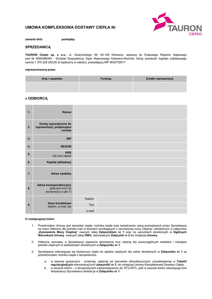 UMOWA KOMPLEKSOWA DOSTAWY CIEPŁA Nr pomiędzy zawarta dnia SPRZEDAWCĄ TAURON Ciepło sp. z o.o., ul. Grażyńskiego 49, 40-126 Katowice, wpisaną do Krajowego Rejestru Sądowego pod Nr 0000396345 - Wydział Gospodarczy Sądu Rejonowego Katowice-Wschód, której wysokość kapitału zakładowego wynosi 1 375 226 250,00 zł (wpłacony w całości), posiadającą NIP 9542732017 reprezentowaną przez: Imię i nazwisko Funkcja Źródło reprezentacji a ODBIORCĄ 1. Nazwa 2. Osoby upoważnione do reprezentacji, podpisujące umowę 3. NIP 4. REGON 5. KRS lub inny rejestr 6. Kapitał zakładowy 7. Adres siedziby 8. Adres korespondencyjny (jeśli jest inny niż wymieniony w pkt 7) 9. Dane kontaktowe telefon, e-mail, fax Telefon Fax e-mail O następującej treści: 1. Przedmiotem Umowy jest sprzedaż ciepła, nośnika ciepła oraz świadczenie usług przesyłowych przez Sprzedawcę na rzecz Odbiorcy dla potrzeb oraz w ilościach wynikających z zamówionej mocy cieplnej i określonych w załączniku „Zamówienie Mocy Cieplnej” zwanym dalej Załącznikiem nr 1 oraz na warunkach określonych w Ogólnych Warunkach Umowy zwanych dalej OWU, stanowiących Załącznik nr 2 do niniejszej Umowy. 2. Odbiorca zamawia, a Sprzedawca zapewnia zamówioną moc cieplną dla poszczególnych obiektów i rodzajów potrzeb cieplnych w wielkościach określonych w Załączniku nr 1. 3. Sprzedawca zobowiązuje się dostarczyć ciepło do węzłów cieplnych dla celów określonych w Załączniku nr 1 za pośrednictwem nośnika ciepła o temperaturze: a. b. w sezonie grzewczym - zmiennej, zależnej od warunków atmosferycznych, przedstawionej w Tabeli/l regulacyjnej/ych stanowiącej/cych załącznik/i nr 3. do niniejszej Umowy Kompleksowej Dostawy Ciepła, w sezonie letnim – o temperaturach zasilania/powrotu do 70oC/35oC, jeśli w sezonie letnim obowiązują inne temperatury Sprzedawca określa je w Załączniku nr 1. 4. Odbiorca zobowiązuje się do odbioru ciepła do celów określonych w Załączniku nr 1, w terminach i na warunkach określonych w Umowie. 5. Odbiorca zobowiązuje się do terminowego regulowania należności wynikających z Umowy zgodnie z postanowieniami Umowy oraz obowiązującymi przepisami. 6. Za miejsce dostarczania ciepła przyjmuje się Granicę eksploatacji, którą określono w Załączniku nr 1. 7. Wszelkie zmiany Umowy Kompleksowej Dostawy Ciepła wymagają formy pisemnej za wyjątkiem Taryf dla ciepła oraz przypadku zmiany bezwzględnie obowiązujących przepisów prawa. Zmiana treści OWU nie wymaga zachowania formy pisemnej i będzie dokonywana na zasadach określonych w OWU. 8. W sprawach nieunormowanych Umową mają zastosowanie przepisy Ustawy Prawo energetyczne, Kodeksu Cywilnego oraz innych powszechnie obowiązujących przepisów prawa. 9. Spory mogące wyniknąć ze stosunku objętego Umową Strony poddają pod rozstrzygnięcie Sądu Powszechnego właściwego dla siedziby Sprzedawcy lub Prezesa Urzędu Regulacji Energetyki zgodnie z właściwością. 10. Umowę Kompleksową Dostawy Ciepła sporządzono w 2 jednobrzmiących egzemplarzach, po jednym dla każdej ze Stron. 11. Umowa zawarta jest na czas nieokreślony i obowiązuje od dnia 12. Integralną część Umowy stanowią: a. b. c. d. e. Załącznik nr 1 – Zamówienie mocy cieplnej, Załącznik nr 2 – Ogólne Warunki Umowy, Załącznik/i nr 3 – Tabela/e regulacyjna/e określona/e w Załączniku nr 1, Załącznik nr 4 – Wyciąg z Taryf dla Ciepła Sprzedawcy oraz producentów i/lub dystrybutorów ciepła, obcych tj. przedsiębiorców produkujących i/lub przysyłających ciepło na rzecz Sprzedawcy dla potrzeb Kupującego, Załącznik nr 5 – Wzorzec wniosku o zmianę zamówionej mocy cieplnej. 13. Odbiorca oświadcza, iż podpisując Umowę Kompleksową Dostawy Ciepła zapoznał się i przyjmuje treść załączników wymienionych w punkcie 12. ODBIORCA SPRZEDAWCA TAURON Ciepło sp. z o.o., 40-126 Katowice, ul. Grażyńskiego 49 jako administrator danych w rozumieniu ustawy z dnia 29 sierpnia 1997r. o ochronie danych osobowych (tekst jednolity: Dz.U. 2002 Nr 101 poz.926, ze zm.) informuje, że udostępnione przez Państwa dane osobowe będą przetwarzane wyłącznie w celu realizacji niniejszej Umowy Kompleksowej Dostawy Ciepła wraz z załącznikami oraz prowadzenia niezbędnej w tym zakresie korespondencji. Administrator danych informuje ponadto, że na podstawie ww. ustawy mają Państwo prawo dostępu do treści swoich danych osobowych oraz prawo do ich poprawiania.
