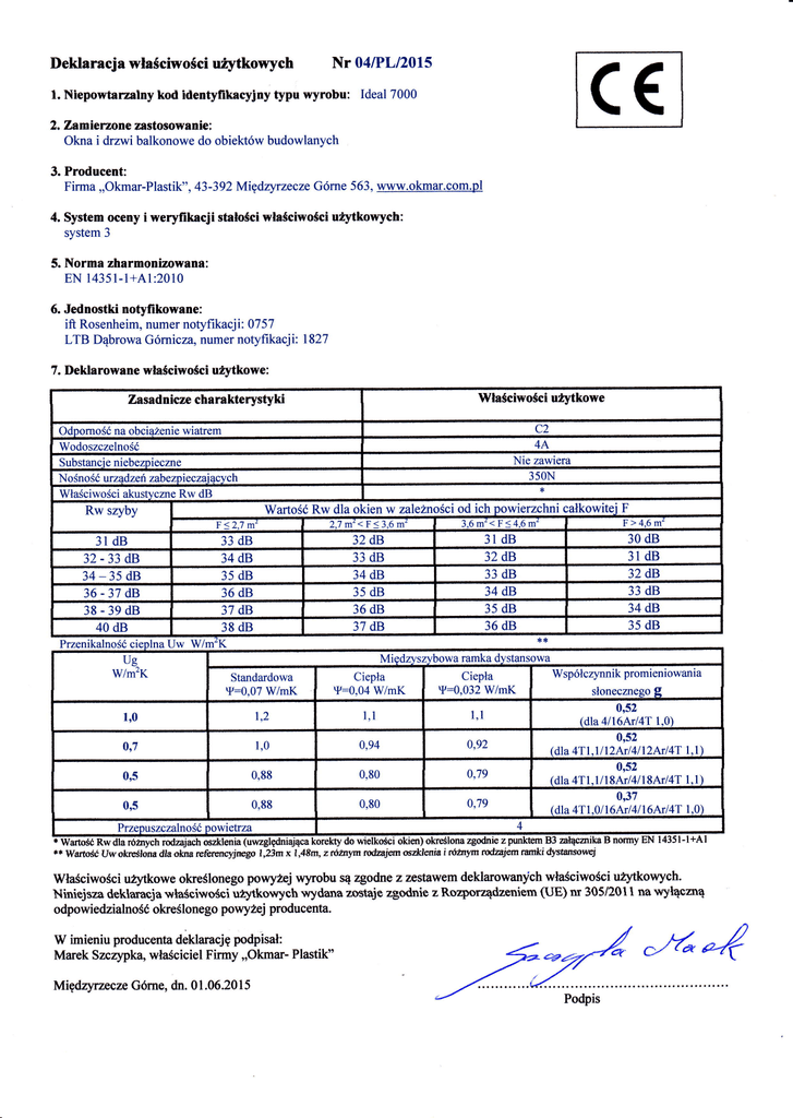 Nr04/PL/2015 Deklaracjawłaściwościuź.ytkowych 1. Ntepowtarzatny kort iilentyfikecyJny typu wyrobu: C€ Ideal 7000 2. Z,smielrz§ne zastosowanie : Okna i drzwi balkonowe do obiektów budowlanych 3. Producent: Firma,,Okmar-Plastik", 43 -392 Międryrzecze Górne 563, www.okmar.com.p1 4. §ystem oceny i ufikowych: weryfikacji stalości właściwości system 3 5. Norma zharmonimwana: EN 14351-1+A1:2010 6. Jednostki noĘdikowane: ift Roseńeim, numer notyfikacji: 0757 LTB DąbrowaGómicza, numer notyfikacji: 1827 uĄtkowe: 7. Deklarowane włrściwości WŃciwości uĄrtkowe Zasadnicze charakterystyki C2 4A odpomośćna obciażąlę wiatrem wodoszczelność substancie niebemiecme Nie zawiera 350N zń ęzpięczaiacy ch właściwościakustvczne Rw dB No śnośćur zadzeń * Rw szyby F <2.7 m' 3l dB 32-33 dB 34-35dB 36 - 3,7 dB 33 dB 32 dB 31 dB 30 dB 34 dB 35 dB 33 dB 32 dB 31 dB 34 dB 35 dB 33 dB 32 dB 33 dB 38_39dB 36 dB 37 dB 40 dB 38 dB przenikalność cieplna u wW Ug Wm2K WartośćRw dla okien w zależnośęiod ich powierzchni całkowitej F F>4óm' 3.6 m'< F < 4.ó m" 2,7 m"< <3 6m' 34 dB 35 dB 3ó dB 36 dB 37 dB !** Miedzvszvbowa ramka dystansowa standardowa Y:0,07 WmK Ciepła \Y:0,04 WmK 1,2 t.l 1.1 0,7 1,0 0,94 0,92 0,5 0,88 0,80 a,79 0,5 0"88 0,80 0,79 zeuttszczalność powięfr za Rw oszklenia Wspołczynnik promieniowania Ciepła Y:0.032 W/mK 1,0 p r 34 dB 35 dB słonecmeso E o,52 (dla4/16Ar/4T 1.0) 6|a 0,52 4T 1.1 l l2Arl 41 0,fl 12Arl 4T l.| (dla 4Tt, l/l8Ar/4 l l&1.r.l 4T 1,1 o37 l4 l t 6 Ar l 4T 1,0\ określona zgodrrie z punktem 83 załąqznika B normy EN l435t-l+Al (c,Ia 4T 1,0 l l 6 Ar 4 .rWarffiUwotręśtonadlaotrrarc&rencyjrrego 1,23mx1,48nr.zńforymrrdzz;jrl,rltcr*lenkiŃaymrodzajemnamkid],:starcowej Właściwościułtkowe określonegopolvyż€j wyrobu Ę zgodne z ze§taw€m deklarowanfch właściwościuĄńkowych. Niniejsza deklmacja włąściwościutytkowych wydana zoataje zgodnie z Rozporądzeniem (UE) nr 305/2011 na wyłączną odpowiedzialność określonegopowyżej producenta. W imieniu producenta deklarację podpisał: Mmek SzcąypĘ właścicielFirmy,,Okmar- Plastik" Międzyrnczs Górne, dn. 0 1.06.20 1 5 J4"-(