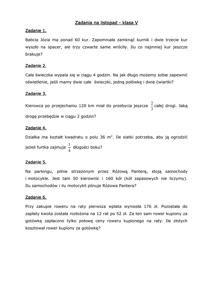 Zadania na listopad - klasa V Zadanie 1. Babcia Józia ma ponad 60 kur. Zapomniała zamknąć kurnik i dwie trzecie kur wyszło na spacer, ale trzy czwarte same wróciły. Ilu co najmniej kur jeszcze brakuje? Zadanie 2. Cała świeczka wypala się w ciągu 4 godzin. Na jak długo możemy sobie zapewnić oświetlenie, jeśli mamy dwie całe świeczki, jedną połówkę i dwie ćwiartki? Zadanie 3. Kierowca po przejechaniu 120 km miał do przebycia jeszcze 2 całej drogi. Jaką 3 drogę przebędzie w ciągu 2 godzin? Zadanie 4. Działka ma kształt kwadratu o polu 36 m2. Ile siatki potrzeba, aby ją ogrodzić jeżeli furtka zajmuje 1 długości boku? 4 Zadanie 5. Na parkingu, pilnie strzeżonym przez Różową Panterę, stoją samochody i motocykle. Jest tam 50 kierownic i 160 kół (kół zapasowych nie liczymy). Ilu samochodów i ilu motocykli pilnuje Różowa Pantera? Zadanie 6. Przy zakupie roweru na raty pierwsza wpłata wyniosła 176 zł. Pozostała do zapłaty kwota została rozłożona na 12 rat po 52 zł. Za ten sam rower kupiony za gotówkę zapłacono tylko połowę ceny roweru kupionego na raty. Ile złotych kosztował rower kupiony za gotówkę?