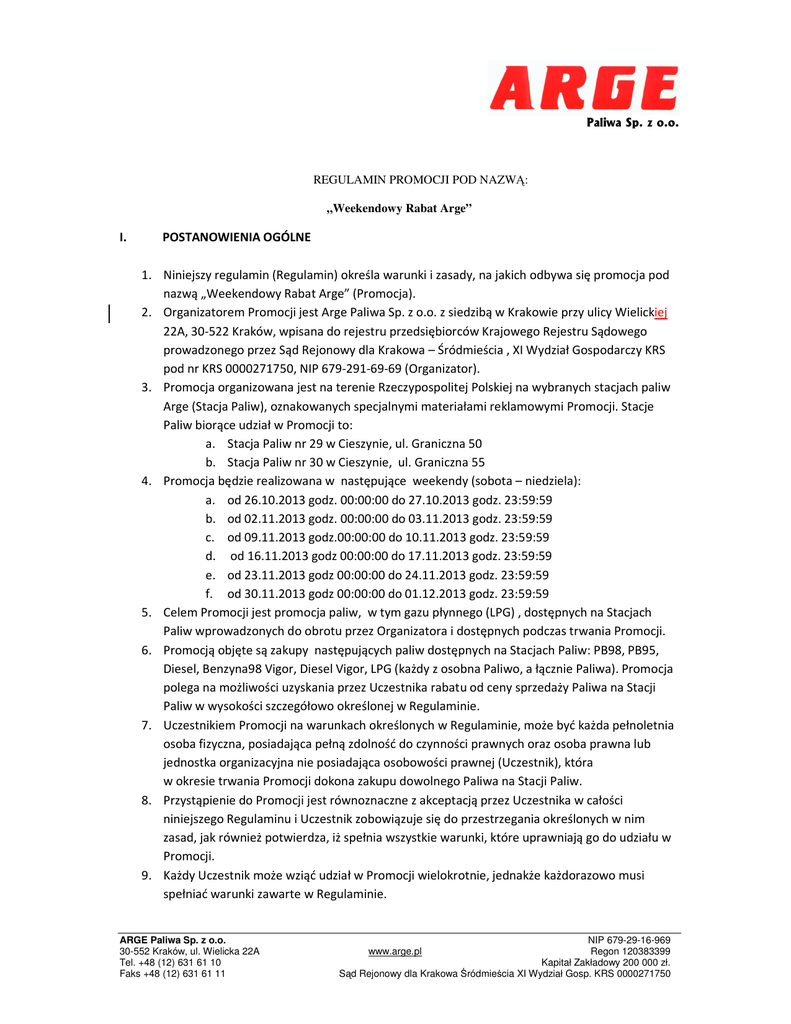 Paliwa Sp. z o.o. REGULAMIN PROMOCJI POD NAZWĄ: „Weekendowy Rabat Arge” I. POSTANOWIENIA OGÓLNE 1. Niniejszy regulamin (Regulamin) określa warunki i zasady, na jakich odbywa się promocja pod nazwą „Weekendowy Rabat Arge” (Promocja). 2. Organizatorem Promocji jest Arge Paliwa Sp. z o.o. z siedzibą w Krakowie przy ulicy Wielickiej 22A, 30-522 Kraków, wpisana do rejestru przedsiębiorców Krajowego Rejestru Sądowego prowadzonego przez Sąd Rejonowy dla Krakowa – Śródmieścia , XI Wydział Gospodarczy KRS pod nr KRS 0000271750, NIP 679-291-69-69 (Organizator). 3. Promocja organizowana jest na terenie Rzeczypospolitej Polskiej na wybranych stacjach paliw Arge (Stacja Paliw), oznakowanych specjalnymi materiałami reklamowymi Promocji. Stacje Paliw biorące udział w Promocji to: a. Stacja Paliw nr 29 w Cieszynie, ul. Graniczna 50 b. Stacja Paliw nr 30 w Cieszynie, ul. Graniczna 55 4. Promocja będzie realizowana w następujące weekendy (sobota – niedziela): a. od 26.10.2013 godz. 00:00:00 do 27.10.2013 godz. 23:59:59 b. od 02.11.2013 godz. 00:00:00 do 03.11.2013 godz. 23:59:59 c. od 09.11.2013 godz.00:00:00 do 10.11.2013 godz. 23:59:59 d. od 16.11.2013 godz 00:00:00 do 17.11.2013 godz. 23:59:59 e. od 23.11.2013 godz 00:00:00 do 24.11.2013 godz. 23:59:59 f. od 30.11.2013 godz 00:00:00 do 01.12.2013 godz. 23:59:59 5. Celem Promocji jest promocja paliw, w tym gazu płynnego (LPG) , dostępnych na Stacjach Paliw wprowadzonych do obrotu przez Organizatora i dostępnych podczas trwania Promocji. 6. Promocją objęte są zakupy następujących paliw dostępnych na Stacjach Paliw: PB98, PB95, Diesel, Benzyna98 Vigor, Diesel Vigor, LPG (każdy z osobna Paliwo, a łącznie Paliwa). Promocja polega na możliwości uzyskania przez Uczestnika rabatu od ceny sprzedaży Paliwa na Stacji Paliw w wysokości szczegółowo określonej w Regulaminie. 7. Uczestnikiem Promocji na warunkach określonych w Regulaminie, może być każda pełnoletnia osoba fizyczna, posiadająca pełną zdolność do czynności prawnych oraz osoba prawna lub jednostka organizacyjna nie posiadająca osobowości prawnej (Uczestnik), która w okresie trwania Promocji dokona zakupu dowolnego Paliwa na Stacji Paliw. 8. Przystąpienie do Promocji jest równoznaczne z akceptacją przez Uczestnika w całości niniejszego Regulaminu i Uczestnik zobowiązuje się do przestrzegania określonych w nim zasad, jak również potwierdza, iż spełnia wszystkie warunki, które uprawniają go do udziału w Promocji. 9. Każdy Uczestnik może wziąć udział w Promocji wielokrotnie, jednakże każdorazowo musi spełniać warunki zawarte w Regulaminie. ARGE Paliwa Sp. z o.o. 30-552 Kraków, ul. Wielicka 22A Tel. +48 (12) 631 61 10 Faks +48 (12) 631 61 11 NIP 679-29-16-969 Regon 120383399 Kapitał Zakładowy 200 000 zł. Sąd Rejonowy dla Krakowa Śródmieścia XI Wydział Gosp. KRS 0000271750 www.arge.pl II. WARUNKI PROMOCJI 1. W okresie trwania Promocji Uczestnik dokonujący zakupu dowolnego Paliwa za gotówkę jest uprawniony do uzyskania rabatu 13 groszy brutto za każdy litr zakupionego Paliwa. 2. Rabat przyznawany jest do całej transakcji zakupu Paliwa. 3. Z Promocji wyłączone są transakcje dokonane przy użyciu wszystkich kart kredytowych, debetowych, kart flotowych DKV, UTA, Berlio, E100, Port24, BZA, Kart Rabatowych Arge oraz klienci dokonujący zapłaty z odroczonym terminem płatności i przedpłatą. 4. W przypadku, gdy liczba litrów zakupionego z rabatem Paliwa będzie niepełna (nie będzie liczbą całkowitą), wysokość udzielonego rabatu odpowiadać będzie iloczynowi faktycznej liczby litrów Paliwa i kwoty rabatu. 5. Uczestnik Promocji nie może domagać się zamiany rabatu na towar i usługę, ani wypłaty jego równowartości w pieniądzach oraz nie przysługuje mu prawo cesji praw do rabatu na osoby trzecie. 6. Organizator nie wprowadza w Promocji minimum ani maksimum zatankowanego Paliwa. 7. Potwierdzeniem dokonania sprzedaży Paliwa/Paliw jest paragon fiskalny lub faktura do paragonu wystawiona na życzenie Uczestnika. 8. Rabaty udzielone na podstawie Promocji i inne rabaty nie sumują się. III. REKLAMACJE 1. Reklamacje mogą być zgłaszane przez Uczestników wyłącznie na piśmie, w ciągu 14 dni od daty transakcji dokonanej w ramach Promocji, której reklamacja dotyczy. Decyduje data wpływu reklamacji do Organizatora. 2. Rozpatrzeniu podlegają wyłącznie reklamacje zgłoszone listem poleconym na adres: Arge Paliwa Sp. z o.o. ul. Wielicka 22A, 30-522 Kraków (z dopiskiem : Promocja „Weekendowy Rabat Arge – Reklamacja”). Reklamacja powinna zawierać: imię i nazwisko Uczestnika, adres zamieszkania lub pobytu, datę i miejsce zdarzenia, którego dotyczy reklamacja, opis zdarzenia, dowód sprzedaży Paliwa w oryginale lub kserokopii, treść żądania oraz podpis Uczestnika. 3. Rozpatrywanie reklamacji trwa maksymalnie 14 dni liczonych od dnia wpłynięcia reklamacji do Organizatora. IV. POSTANOWIENIA KOŃCOWE 1. Organizator zastrzega sobie możliwość dokonywania w każdym czasie zmian w postanowieniach niniejszego Regulaminu, przy czym zmiana ta nie może w jakikolwiek sposób naruszyć praw już nabytych przez Uczestników Promocji. Zmiany Regulaminu zostaną ogłoszone na www.arge.pl oraz będą dostępne w siedzibie Organizatora w terminie co najmniej 3 dni kalendarzowych przed ich wejściem w życie. 2. Materiały reklamowo-promocyjne związane z Promocją mają jedynie charakter informacyjny. Wiążącą moc prawną mają wyłącznie postanowienia niniejszego Regulaminu. 3. Wszelkie spory i roszczenia związane z Promocją rozstrzygać będzie właściwy sąd powszechny. ARGE Paliwa Sp. z o.o. 30-552 Kraków, ul. Wielicka 22A Tel. +48 (12) 631 61 10 Faks +48 (12) 631 61 11 NIP 679-29-16-969 Regon 120383399 Kapitał Zakładowy 200 000 zł. Sąd Rejonowy dla Krakowa Śródmieścia XI Wydział Gosp. KRS 0000271750 www.arge.pl 4. Regulamin Promocji, będzie dostępny w czasie trwania Promo