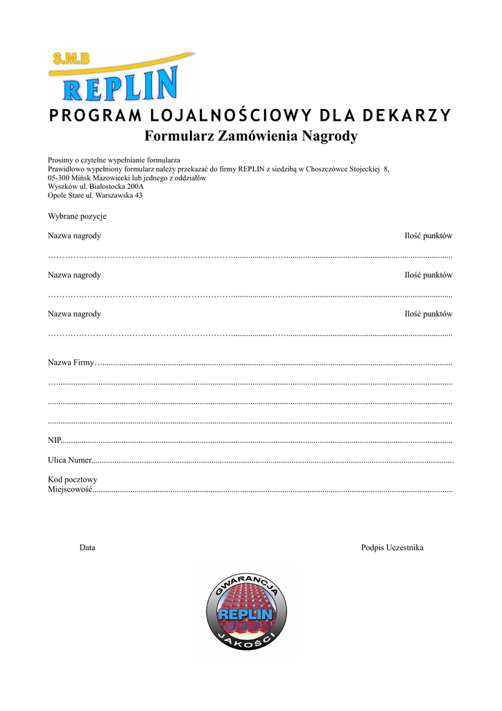 PRO G R A M LOJALNO Ś CIOW Y DL A DE K A R Z Y Formularz Zamówienia Nagrody Prosimy o czytelne wypełnianie formularza Prawidłowo wypełniony formularz należy przekazać do firmy REPLIN z siedzibą w Choszczówce Stojeckiej 8, 05-300 Mińsk Mazowiecki lub jednego z oddziałów Wyszków ul. Białostocka 200A Opole Stare ul. Warszawska 43 Wybrane pozycje Nazwa nagrody Ilość punktów ………………………………………………………….................……............................................................................... Nazwa nagrody Ilość punktów ………………………………………………………….................……............................................................................... Nazwa nagrody Ilość punktów ………………………………………………………….................……............................................................................... Nazwa Firmy…...................................................................................................................................................................... …............................................................................................................................................................................................ ................................................................................................................................................................................................ ................................................................................................................................................................................................ NIP.......................................................................................................................................................................................... Ulica Numer............................................................................................................................................................................ Kod pocztowy Miejscowość........................................................................................................................................................................... Data Podpis Uczestnika