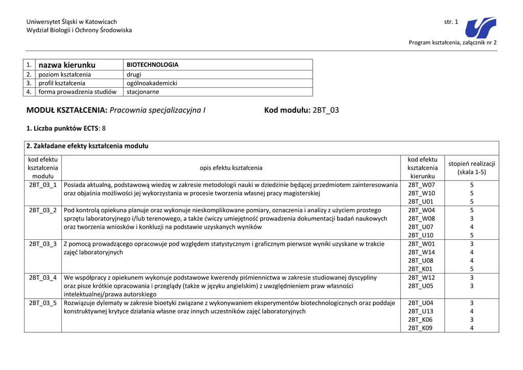 Uniwersytet Śląski w Katowicach Wydział Biologii i Ochrony Środowiska str. 1 Program kształcenia, załącznik nr 2 1. 2. 3. 4. nazwa kierunku poziom kształcenia profil kształcenia forma prowadzenia studiów BIOTECHNOLOGIA drugi ogólnoakademicki stacjonarne MODUŁ KSZTAŁCENIA: Pracownia specjalizacyjna I Kod modułu: 2BT_03 1. Liczba punktów ECTS: 8 2. Zakładane efekty kształcenia modułu kod efektu kształcenia opis efektu kształcenia modułu 2BT_03_1 Posiada aktualną, podstawową wiedzę w zakresie metodologii nauki w dziedzinie będącej przedmiotem zainteresowania oraz objaśnia możliwości jej wykorzystania w procesie tworzenia własnej pracy magisterskiej 2BT_03_2 Pod kontrolą opiekuna planuje oraz wykonuje nieskomplikowane pomiary, oznaczenia i analizy z użyciem prostego sprzętu laboratoryjnego i/lub terenowego, a także ćwiczy umiejętność prowadzenia dokumentacji badań naukowych oraz tworzenia wniosków i konkluzji na podstawie uzyskanych wyników 2BT_03_3 Z pomocą prowadzącego opracowuje pod względem statystycznym i graficznym pierwsze wyniki uzyskane w trakcie zajęć laboratoryjnych 2BT_03_4 We współpracy z opiekunem wykonuje podstawowe kwerendy piśmiennictwa w zakresie studiowanej dyscypliny oraz pisze krótkie opracowania i przeglądy (także w języku angielskim) z uwzględnieniem praw własności intelektualnej/prawa autorskiego Rozwiązuje dylematy w zakresie bioetyki związane z wykonywaniem eksperymentów biotechnologicznych oraz poddaje konstruktywnej krytyce działania własne oraz innych uczestników zajęć laboratoryjnych 2BT_03_5 kod efektu kształcenia kierunku 2BT_W07 2BT_W10 2BT_U01 2BT_W04 2BT_W08 2BT_U07 2BT_U10 2BT_W01 2BT_W14 2BT_U08 2BT_K01 2BT_W12 2BT_U05 2BT_U04 2BT_U13 2BT_K06 2BT_K09 stopień realizacji (skala 1-5) 5 5 5 5 3 4 5 3 4 4 5 3 3 3 4 3 4 Uniwersytet Śląski w Katowicach Wydział Biologii i Ochrony Środowiska str. 2 Program kształcenia, załącznik nr 2 2BT_03_6 Tłumaczy potrzebę przestrzegania zasad współpracy oraz harmonogramów i planów pracy w laboratorium; interpretuje założenia Dobrej Praktyki Laboratoryjnej, BHP i pierwszej pomocy przedmedycznej oraz wdraża się do odpowiedzialności za powierzoną bazę materiałowo-sprzętową podczas przygotowywania się do wykonania pracy magisterskiej 2BT_W13 2BT_U14 2BT_U16 2BT_K02 2BT_K04 2BT_K07 5 5 5 5 4 4 3. Opis modułu Opis Wymagania wstępne modułu Moduł zapoznaje studenta ze specyfiką i kierunkami badań prowadzonych w wybranej Katedrze lub Zakładzie. W czasie zajęć laboratoryjnych student wprowadzany jest stopniowo w poszczególne etapy procesu badawczego. Szczególną uwagę zwraca się na specyfikę metodologii badań w zakresie wybranej specjalizacji. Student uczy się różnych metod oraz ocenia ich skuteczność i wartość poznawczą. Uczy się walidacji tychże metod pod kątem ich czułości, dokładności, powtarzalności, czaso- i kosztochłonności. Pod nadzorem opiekuna ocenia możliwości wykorzystania danej metody do rozwiązania określonego problemu badawczego. Ćwiczy konstruowanie roboczych hipotez, a następnie projektuje możliwe scenariusze ich zweryfikowania. Jest wdrażany do samokontroli, planowania swoich działań w pracowni, dostosowywania się do harmonogramu prac w laboratorium, samodzielnego przygotowania bazy materiałowo-sprzętowej, systematycznego i starannego prowadzenia dziennika oznaczeń i całej dokumentacji prac prowadzonych w laboratorium. Wiedza z zakresu nauk przyrodniczych na poziomie umożliwiającym zrozumienie specyfiki badań danej jednostki oraz zasad, na których oparte są określone metody badawcze. Umiejętność pracy w laboratorium biotechnologicznym, m.in. obsługa prostego sprzętu laboratoryjnego i/lub urządzeń. Znajomość języka angielskiego w stopniu umożliwiającym zrozumienie tekstów naukowych. 4. Sposoby weryfikacji efektów kształcenia modułu kod nazwa (typ) sposobu weryfikacji 2BT_03_w_1 Ocena ciągła umiejętności praktycznych (aktywność na zajęciach) 2BT_03_w_2 Raporty 2BT_03_w_3 Zaliczenie końcowe/ opis szczegółowy Oceniane jest zaangażowanie studenta, jego solidność podczas wykonywania prac zleconych przez prowadzącego; rzetelność w sporządzaniu dokumentacji; kreatywność podejścia do problemów badawczych i sposobów ich rozwiązania Ocenie podlega poprawność oraz sposób przygotowania i przedstawienia częściowych raportów po wykonanych doświadczeniach; profesjonalność i solidność walidacji metod; kreatywne podejście do opracowania wyników i roboczych wniosków Oceniane są: kompletność, sposób zestawienia oraz prezentacji obserwacji efekt(-y) kształcenia modułu 2BT_03_1, 2BT_03_2, 2BT_03_3, 2BT_03_5, 2BT_03_6 2BT_03_1, 2BT_03_2, 2BT_03_3, 2BT_03_4 2BT_03_1, 2BT_03_3, 2BT_03_4 Uniwersytet Śląski w Katowicach Wydział Biologii i Ochrony Środowiska str. 3 Program kształcenia, załącznik nr 2 sprawozdanie końcowe i wyników zebranych podczas całego bloku laboratoriów; poprawność oraz trafność opisu wartości poznawczej poszczególnych metod i wyciąganych wniosków końcowych 5. Formy prowadzenia zajęć forma prowadzenia zajęć nazwa 2BT_03_fs_1 Laboratorium 2BT_03_fs_2 konsultacje opis (z uwzględnieniem metod dydaktycznych) - ćwiczenie metod stosowanych w danej jednostce organizacyjnej - walidacja poznanych metod - projektowanie, prowadzenie i analiza wyników prostych doświadczeń - dyskusja na temat etapów procesu badawczego - prowadzenie dokumentacji z przeprowadzonych ćwiczeń - rozmowa na temat zasad pracy w laboratorium, sposobu prowadzenia dokumentacji i sporządzania raportów - ćwiczenia w zakresie stawiania hipotez badawczych i projektowania sposobów ich weryfikacji - ćwiczenie umiejętności prowadzenia hodowli (opcjonalnie) - dyskusja na temat treści oraz sposobu przygotowania sprawozdań suma godzin: praca własna studenta liczba godzin 120 120 opis - systematyczne śledzenie literatury fachowej z za