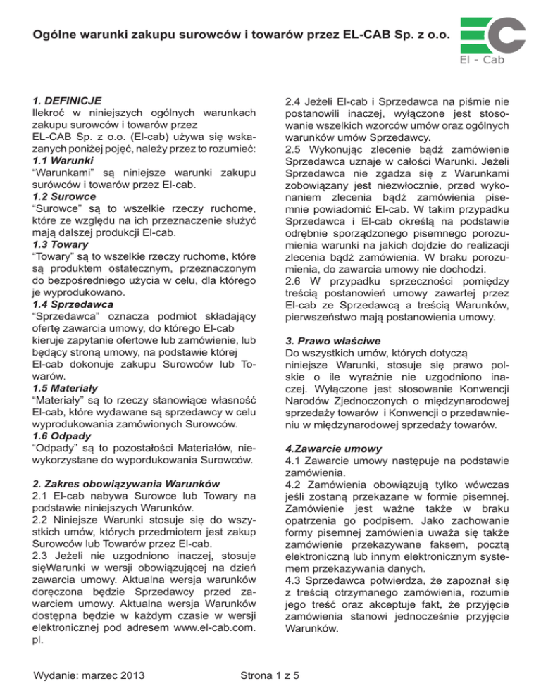 Ogólne warunki zakupu surowców i towarów przez EL-CAB Sp. z o.o. 1. DEFINICJE Ilekroć w niniejszych ogólnych warunkach zakupu surowców i towarów przez EL-CAB Sp. z o.o. (El-cab) używa się wskazanych poniżej pojęć, należy przez to rozumieć: 1.1 Warunki “Warunkami” są niniejsze warunki zakupu surówców i towarów przez El-cab. 1.2 Surowce “Surowce” są to wszelkie rzeczy ruchome, które ze względu na ich przeznaczenie służyć mają dalszej produkcji El-cab. 1.3 Towary “Towary” są to wszelkie rzeczy ruchome, które są produktem ostatecznym, przeznaczonym do bezpośredniego użycia w celu, dla którego je wyprodukowano. 1.4 Sprzedawca “Sprzedawca” oznacza podmiot składający ofertę zawarcia umowy, do którego El-cab kieruje zapytanie ofertowe lub zamówienie, lub będący stroną umowy, na podstawie której El-cab dokonuje zakupu Surowców lub Towarów. 1.5 Materiały “Materiały” są to rzeczy stanowiące własność El-cab, które wydawane są sprzedawcy w celu wyprodukowania zamówionych Surowców. 1.6 Odpady “Odpady” są to pozostałości Materiałów, niewykorzystane do wypordukowania Surowców. 2. Zakres obowiązywania Warunków 2.1 El-cab nabywa Surowce lub Towary na podstawie niniejszych Warunków. 2.2 Niniejsze Warunki stosuje się do wszystkich umów, których przedmiotem jest zakup Surowców lub Towarów przez El-cab. 2.3 Jeżeli nie uzgodniono inaczej, stosuje sięWarunki w wersji obowiązującej na dzień zawarcia umowy. Aktualna wersja warunków doręczona będzie Sprzedawcy przed zawarciem umowy. Aktualna wersja Warunków dostępna będzie w każdym czasie w wersji elektronicznej pod adresem www.el-cab.com. pl. Wydanie: marzec 2013 2.4 Jeżeli El-cab i Sprzedawca na piśmie nie postanowili inaczej, wyłączone jest stosowanie wszelkich wzorców umów oraz ogólnych warunków umów Sprzedawcy. 2.5 Wykonując zlecenie bądź zamówienie Sprzedawca uznaje w całości Warunki. Jeżeli Sprzedawca nie zgadza się z Warunkami zobowiązany jest niezwłocznie, przed wykonaniem zlecenia bądź zamówienia pisemnie powiadomić El-cab. W takim przypadku Sprzedawca i El-cab określą na podstawie odrębnie sporządzonego pisemnego porozumienia warunki na jakich dojdzie do realizacji zlecenia bądź zamówienia. W braku porozumienia, do zawarcia umowy nie dochodzi. 2.6 W przypadku sprzeczności pomiędzy treścią postanowień umowy zawartej przez El-cab ze Sprzedawcą a treścią Warunków, pierwszeństwo mają postanowienia umowy. 3. Prawo właściwe Do wszystkich umów, których dotyczą niniejsze Warunki, stosuje się prawo polskie o ile wyraźnie nie uzgodniono inaczej. Wyłączone jest stosowanie Konwencji Narodów Zjednoczonych o międzynarodowej sprzedaży towarów i Konwencji o przedawnieniu w międzynarodowej sprzedaży towarów. 4.Zawarcie umowy 4.1 Zawarcie umowy następuje na podstawie zamówienia. 4.2 Zamówienia obowiązują tylko wówczas jeśli zostaną przekazane w formie pisemnej. Zamówienie jest ważne także w braku opatrzenia go podpisem. Jako zachowanie formy pisemnej zamówienia uważa się także zamówienie przekazywane faksem, pocztą elektroniczną lub innym elektronicznym systemem przekazywania danych. 4.3 Sprzedawca potwierdza, że zapoznał się z treścią otrzymanego zamówienia, rozumie jego treść oraz akceptuje fakt, że przyjęcie zamówienia stanowi jednocześnie przyjęcie Warunków. Strona 1 z 5 Ogólne warunki zakupu surowców i towarów przez EL-CAB Sp. z o.o. Każde zamówienie winno być potwierdzone przez Sprzedawcę niezwłocznie po jego otrzymaniu, nie później niż w ciągu 3 dni roboczych od dnia otrzymania zamówienia.Nie wniesienie przez Sprzedawcę w tym terminie pisemnych zastrzeżeń oznacza przyjęcie zamówienia do realizacji bez jakichkolwiek uwag. 4.4 Umowa zostaje zawarta z momentem potwierdzenia przez Sprzedawcę otrzymania zamówienia. 5. Warunki wykonania umowy 5.1 Dostawa Surowców lub Towarów musi nastąpić w miejscu określonym w zamówieniu z dokumentem dostawy WZ lub z fakturą. Dokumenty dostawy musza zawierać datę, numer zamówienia, indeks El-cab oraz nazwę materiału. Dokumenty dostawy nie zawierające jakiejkolwiek z wyżej wymienionych informacji uznaje się za niekompletne. Płatność za fakturę z tytułu będzie opóźniona do czasu przedstawienia przez Sprzedawcę prawidłowego dokumentu dostawy. 5.2 W przypadku nieprzestrzegania przez Sprzedawcę uzgodnionego terminu dostawy lub w przypadku gdy dostawa jest niekompletna lub zawiera większą ilość niż zamówiona lub gdy nie jest zgodna z zamówieniem, El-cab zastrzega sobie prawo do odmowy jej przyjęcia. El-cab może odmówić przyjęcia dostawy jeśli z powodu niekompletności dokumentów dostawy niemożliwa jest identyfikacja dostawy. 5.3 Każda dostawa, której przyjęcia odmówiono, zostanie zwrócona Sprzedawcy na jego koszt i ryzyko, w ciągu 5 dni od daty oświadczenia o odmowie przyjęcia dostawy. Dostawy częściowe będą akceptowane po wcześniejszym dokładnym uzgodnieniu. 5.4 W przypadku nieterminowej realizacji, El-cab zastrzega sobie możliwość naliczenia i obciążenia Sprzedawcy karą umowną w wysokości 5% wasrtości dostawy netto za każdy dzień zwłoki. Wydanie: marzec 2013 W przypadku gdy kara umowna nie pokryje w całości szkody, jaką El-cab poniósł w związku z nieterminową dostawą, wówczas ma on prawo dochodzienia odszkodowania na zasadach ogólnych. 5.5 Każda dostawa wymaga awizacji 5.6 Sprzedawca zobowiązany jest do zapewnienia odpowiedniego, uzgodnionego przy zamówieniu z El-cab opakowania dla dostarczanych Surowców lub Towarów. Jeśli nie zostaną poczynione dodatkowe uzgodnienia, dostarczane Surowce lub Towary powinny być opakowane odpowiednio i zgodnie z zasadami przyjętymi w obrocie dla transportu tych rzeczy. Za uszkodzenia powstałe na skutek niedostatecznego opakowania odpowiedzialność ponosi Sprzedawca. 6. Przejście ryzyka 6.1 Przejście ryzyk związ