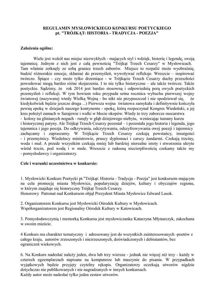REGULAMIN MYSŁOWICKIEGO KONKURSU POETYCKIEGO pt. "TRÓJKĄT: HISTORIA - TRADYCJA - POEZJA" Założenia ogólne: Wiele jest wokół nas miejsc niezwykłych - mających styl i wdzięk, historię i legendę, swoją tajemnicę. Jednym z nich jest z całą pewnością "Trójkąt Trzech Cesarzy" w Mysłowicach. Tam właśnie zetknęły ze sobą granice trzech zaborów. Miejsce to rozpalić może wyobraźnię, budzić różnorakie emocje, skłaniać do przemyśleń, wywoływać refleksje. Wreszcie – inspirować twórczo. Śpiące - czy może tylko drzemiące - w Trójkącie Trzech Cesarzy duchy przeszłości powodować mogą bardzo różne skojarzenia. I to nie tylko historyczne – ale także twórcze. Także poetyckie. Sądzimy, że rok 2014 jest bardzo stosowną i odpowiednią porą owych poetyckich przemyśleń i refleksji. W tym bowiem roku przypada setna rocznica wybuchu pierwszej wojny światowej (nazywanej wtedy Wielką Wojną - bo nikt nie przypuszczał i nie spodziewał się, że kiedykolwiek będzie jeszcze druga ...) Pierwsza wojna światowa zamykała i definitywnie kończyła pewną epokę w dziejach naszego kontynentu - epokę, którą rozpoczynał Kongres Wiedeński, a jej kres położył zamach w Sarajewie i walki w błocie okopów. Wtedy to trzy zaborcze mocarstwa - kolosy na glinianych nogach - runęły w głąb dziejowego niebytu, wzniecając tumany kurzu i historycznej patyny. Ale Trójkąt Trzech Cesarzy pozostał – i pozostała jego historia i legenda, jego tajemnica i jego poezja. Do odkrywania, odczytywania, odszyfrowywania owej poezji i tajemnicy zachęcamy i zapraszamy. W Trójkącie Trzech Cesarzy czekają powstańcy, insurgenci - i przemytnicy. Wiedeńscy ministrowie, pruscy dyplomaci i carscy żandarmi. Czekają trzciny, woda i muł. A przede wszystkim czekają mniej lub bardziej nierealne istoty i stworzenia ukryte wśród trzcin, pod wodą i w mule. Wreszcie z radosną niecierpliwością czekamy także my - pomysłodawcy i organizatorzy. Cele i warunki uczestnictwa w konkursie: 1. Mysłowicki Konkurs Poetycki pt."Trójkąt: Historia - Tradycja - Poezja" jest konkursem mającym na celu promocję miasta Mysłowice, popularyzację dziejów, kultury i obyczajów regionu, w którym znajduje się historyczny Trójkąt Trzech Cesarzy. Honorowy Patronat nad Konkursem objął Prezydent Miasta Mysłowice Edward Lasok. 2. Organizatorem Konkursu jest Mysłowicki Ośrodek Kultury w Mysłowicach. Współorganizatorem jest Regionalny Ośrodek Kultury w Katowicach. 3. Pomysłodawczynią i mentorką Konkursu jest mysłowiczanka Katarzyna Młynarczyk, zakochana w swoim mieście. 4 Konkurs ma charakter tematyczny i adresowany jest do wszystkich zainteresowanych -poetów z całego kraju, autorów zrzeszonych i niezrzeszonych, doświadczonych i debiutantów, bez ograniczeń wiekowych. 6. Na Konkurs nadesłać należy jeden, dwa lub trzy wiersze - jednak nie więcej niż trzy - każdy w czterech egzemplarzach napisane na komputerze lub maszynie do pisania. W przypadkach wyjątkowych będzie przyjęty czytelny rękopis. Organizatorzy oczekują utworów nigdzie dotychczas nie publikowanych i nie nagradzanych w innych konkursach. Każdy autor może nadesłać tylko jeden zestaw utworów. 7. Utwory powinny być opatrzone godłem. Utwory pozbawione godła nie będą oceniane przez Jury. Wewnątrz przesyłki należy umieścić drugą, mniejszą kopertę opatrzoną tym samym godłem, zawierającą dane autora: imię, nazwisko, adres, numer telefonu i adres elektroniczny. Nota biograficzna nie jest konieczna - jej załączenie Organizatorzy pozostawiają uznaniu i chęciom autora. Należy załączyć podpisane oświadczenie o treści: „Oświadczam, że jestem autorką/autorem wierszy nadesłanych na konkurs. Wiersze nie były wcześniej publikowane i nagradzane na innych konkursach.”. Autor, nadsyłając prace na Konkurs, zgadza się na przetwarzanie danych osobowych na potrzeby postępowania konkursowego oraz publikację wierszy w wydawnictwie pokonkursowym. Uczestnikom Konkursu przysługuje prawo dostępu do treści swoich danych jak również do ich późniejszego poprawienia. 8. Utwory należy nadsyłać na adres: Mysłowicki Ośrodek Kultury, ul. Grunwaldzka 7, 41-400 Mysłowice - w nieprzekraczalnym terminie do dnia 30 maja 2014r. Decyduje data stempla pocztowego. 9. Organizatorzy przewidują następujące nagrody: Grand Prix - Nagrodę Główną, dwie równorzędne nagrody drugiego stopnia oraz dwa równorzędne wyróżnienia. 10. Organizatorzy i Jurorzy przewidują i dopuszczają nagrody pozaregulaminowe przyznawane np. przez organizacje, stowarzyszenia, firmy, osoby prywatne lub Przewodniczącą Jury. 11. Organizatorzy przewidują publikację utworów nagrodzonych i wyróżnionych bez wypłacania honorariów autorskich, w formie antologii pokonkursowej - uzależniając jej wydanie od decyzji Jury. 12. Organizatorzy zaproponują autorom prezentację utworów nagrodzonych i wyróżnionych na spotkaniach autorskich w Mysłowicach. 13.. Nadesłanie utworów Organizatorzy traktują jako akceptację wszystkich warunków Konkursu. Wszelkie sporne sprawy rozstrzyga Organizator.
