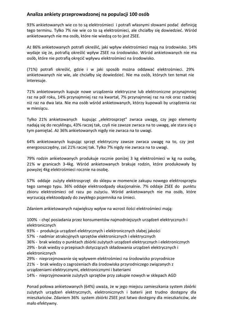 Analiza ankiety przeprowadzonej na populacji 100 osób 93% ankietowanych wie co to są elektrośmieci i potrafi własnymi słowami podać definicję tego terminu. Tylko 7% nie wie co to są elektrośmieci, ale chciałby się dowiedzieć. Wśród ankietowanych nie ma osób, które nie wiedzą co to jest ZSEE. Aż 86% ankietowanych potrafi określić, jaki wpływ elektrośmieci mają na środowisko. 14% wydaje się że, potrafią określić wpływ ZSEE na środowisko. Wśród ankietowanych nie ma osób, które nie potrafią okręcić wpływu elektrośmieci na środowisko. (71%) potrafi określić, gdzie i w jaki sposób można oddawać elektrośmieci. 29% ankietowanych nie wie, ale chciałby się dowiedzieć. Nie ma osób, których ten temat nie interesuje. 71% ankietowanych kupuje nowe urządzenia elektryczne lub elektroniczne przynajmniej raz na pół roku, 14% przynajmniej raz na kwartał, 7% przynajmniej raz na rok oraz rzadziej niż raz na dwa lata. Nie ma osób wśród ankietowanych, którzy kupowali by urządzenia raz w miesiącu. Tylko 21% ankietowanych kupując „elektrosprzęt” zwraca uwagę, czy jego elementy nadają się do recyklingu, 43% raczej tak, czyli nie zawsze zwraca na to uwagę, ale stara się o tym pamiętać. Aż 36% ankietowanych nigdy nie zwraca na to uwagi. 64% ankietowanych kupując sprzęt elektryczny zawsze zwraca uwagę na to, czy jest energooszczędny, zaś 21% raczej tak. Tylko 7% nigdy nie zwraca na to uwagi. 79% rodzin ankietowanych produkuje rocznie poniżej 3 kg elektrośmieci w kg na osobę, 21% w granicach 3-4kg. Wśród ankietowanych brakuje rodzin, które produkowały by powyżej 4kg elektrośmieci rocznie na osobę. 57% oddaje zużyty elektrosprzęt do sklepu w momencie zakupu nowego elektrosprzętu tego samego typu. 36% oddaje elektroodpady okazjonalnie. 7% oddaje ZSEE do punktu zbioru elektrośmieci od razu po zużyciu. Wśród ankietowanych nie ma osób, które wyrzucają elektoodpady do zwykłego pojemnika na śmieci. Zdaniem ankietowanych największy wpływ na wzrost ilości elektrośmieci mają: 100% - chęć posiadania przez konsumentów najmodniejszych urządzeń elektrycznych i elektronicznych 93% - produkcja urządzeń elektrycznych i elektronicznych słabej jakości 57% - nadmiar atrakcyjnych sprzętów elektronicznych i elektrycznych 36% - brak wiedzy o punktach zbiórki zużytych urządzeń elektrycznych i elektronicznych 29% - brak wiedzy o przepisach dotyczących składowania urządzeń elektrycznych i elektronicznych 29% - nieprzejmowanie się wpływem elektrośmieci na środowisko przyrodnicze 21% - brak wiedzy o zagrożeniach dla środowiska przyrodniczego związanych z urządzeniami elektrycznymi, elektronicznymi i bateriami 14% - nieprzyjmowanie zużytych sprzętów przy zakupie nowych w sklepach AGD Ponad połowa ankietowanych (64%) uważa, że w jego miejscu zamieszkania system zbiórki zużytych urządzeń elektrycznych, elektronicznych i baterii jest trudno dostępny dla mieszkańców. Zdaniem 36% system zbiórki ZSEE jest łatwo dostępny dla mieszkańców, ale mało efektywny.