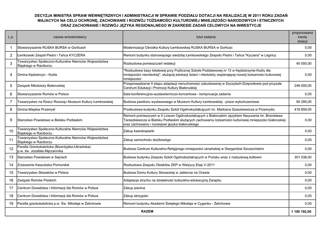 DECYZJA MINISTRA SPRAW WEWNĘTRZNYCH I ADMINISTRACJI W SPRAWIE PODZIAŁU DOTACJI NA REALIZACJĘ W 2011 ROKU ZADAŃ MAJACYCH NA CELU OCHRONĘ, ZACHOWANIE I ROZWÓJ TOŻSAMOŚCI KULTUROWEJ MNIEJSZOŚCI NARODOWYCH I ETNICZNYCH ORAZ ZACHOWANIE I ROZWÓJ JĘZYKA REGIONALNEGO W ZAKRESIE ZADAŃ CELOWYCH NA INWESTYCJE L.p. nazwa wnioskodawcy tytuł zadania proponowana kwota dotacji 1 Stowarzyszenie RUSKA BURSA w Gorlicach Modernizacja Ośrodka Kultury Łemkowskiej RUSKA BURSA w Gorlicac 0,00 2 Łemkowski Zespół Pieśni i Tańca KYCZERA Remont budynku stanowiącego siedzibę Łemkowskiego Zespołu Pieśni i Tańca "Kyczera" w Legnicy 0,00 3 Towarzystwo Społeczno-Kulturalne Niemców Województwa Śląskiego w Raciborzu Rozbudowa pomieszczeń redakcji 4 Gmina Kędzierzyn - Koźle 5 Związek Młodzieży Białoruskiej 6 Stowarzyszenie Romów w Polsce Sala konferencyjno-wystawienniczo-koncertowa - kontynuacja zadania 7 Towarzystwo na Rzecz Rozwoju Muzeum Kultury Łemkowskiej Budowa pawilonu wystawowego w Muzeum Kultury Łemkowskiej - prace wykończeniowe 8 Gmina Miejska Przemyśl Przebudowa budynku Zespołu Szkół Ogólnokształcących im. Markiana Szaszkiewicza w Przemyślu 9 Starostwo Powiatowe w Bielsku Podlaskim Remont pomieszczeń w II Liceum Ogólnokształcącym z Białoruskim Językiem Nauczania im. Bronisława Taraszkiewicza w Bielsku Podlaskim służących zachowaniu tożsamości kulturowej mniejszości białoruskiej oraz zachowaniu i rozwojowi języka białoruskiego 0,00 Zakup kserokopiarki 0,00 Zakup samochodu służbowego 0,00 Budowa Centrum Kulturalno-Religijnego mniejszości ukraińskiej w Stargardzie Szczecińskim 0,00 10 11 12 Towarzystwo Społeczno-Kulturalne Niemców Województwa Śląskiego w Raciborzu Towarzystwo Społeczno-Kulturalne Niemców Województwa Śląskiego w Raciborzu Parafia Greckokatolicka (Bizantyjsko-Ukraińska) p.w. św. Jozafata Męczennika "Rozbudowa bazy lokalowej przy Publicznej Szkole Podstawowej nr 13 w Kędzierzynie-Koźlu dla mniejszości niemieckiej", służącej edukacji dzieci i młodzieży wspierającej rozwój tożsamości kulturowej mniejszości Przeprowadzenie II etapu adaptacji nieruchomości zabudowanej w Szczytach-Dzięciołowie pod przyszłe Centrum Edukacji i Promocji Kultury Białoruskiej 40 000,00 0,00 246 000,00 0,00 94 295,00 418 859,00 13 Starostwo Powiatowe w Sejnach Budowa budynku Zespołu Szkół Ogólnokształcących w Puńsku wraz z rozbudową kotłowni 14 Zrzeszenie Kaszubsko-Pomorskie Rozbudowa Zespołu Obiektów ZKP w Wieżycy Etap V-2011 0,00 15 Towarzystwo Słowaków w Polsce Budowa Domu Kultury Słowackiej w Jabłonce na Orawie 0,00 16 Związek Romów Polskich Adaptacja strychu na działalność kulturalno-edukacyjną Związku 0,00 17 Centrum Doradztwa i Informacji dla Romów w Polsce Zakup pianina 0,00 18 Centrum Doradztwa i Informacji dla Romów w Polsce Zakup skrzypiec 0,00 19 Parafia greckokatolicka p.w. Św. Mikołaja w Żelichowie Remont budynku Akademii Świętego Mikołaja w Cyganku - Żelichowie 0,00 RAZEM 301 038,00 1 100 192,00