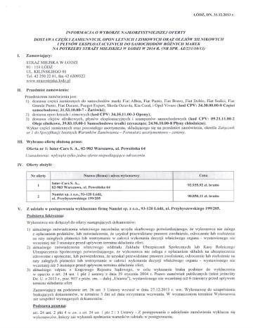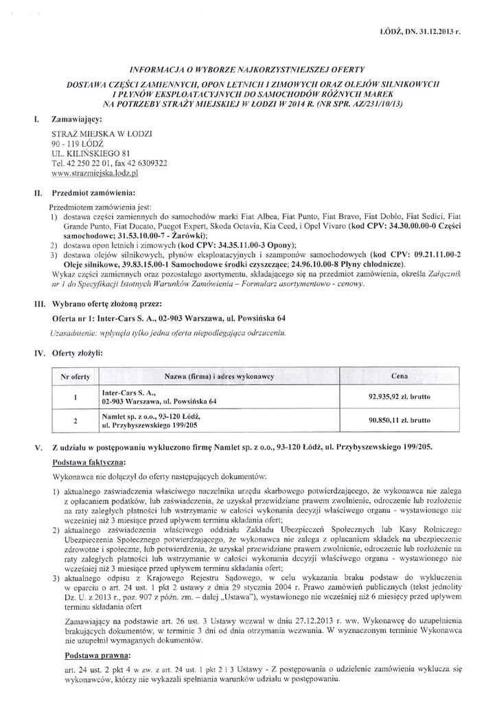 L6DZ,DN.31.12.2013 r. I N FORMACJA O II/YBORZE NAJKORZYSTNI EJSZEJ OF ERT Y DosrAWAcz4Sct ztwnuNvcH, opoN LETNTcH r zrMowvcH o&42 oLrtdw suNrcowycn t pzvNdwrxsptoATACyJNycHDo s.sl4ocnoodwn62uvcn utaox MIEJSKIEJ Az/231/10/13) NAPoTRzEBy STRAZy w LoDzI W2014R.(NRSPR. I, Zamawiajqcy: STRAZMIEJSKAW LODZI 90 - 119I-ODZ ut. rILnszugcost T el. 42 250 22 01, fax 42 6309322 www.strazmieiska.lodz.pl Przedmiotzam6wienia: Przedmiotemzam6wieniajest: 1) dostawa czgScizamiennych do samochod6wmarki Fiat Albea, Fiat Punto, Fiat Bravo, Fiat Doblo, Fiat Sedici, Fiat GrandePunto, Fiat Ducato, Puegot Expert, Skoda Octavia, Kia Ceed, i Opel Vivaro (kod CPV: 34.30.00.00-0Cz93ci - Za16wki); samochodowel31.53.10.00-7 Opony); 2) dostawaopon letnichi zimowych(kod CPV: 34.35.11.00-3 -1\ dostawa olej6w silnikowych, plyn6w eksploatacyjnych i szampon6w samochodowych (kod CPV: 09,21,11.00-2 24.96.10.00-8 Plyny chlodnicze). SamochodoweSrodki czyszcz4cet Oleje sifnikowe,39.83.15.00-1 psedmiot pozostalego na zam6wienia, okre(,laZalqcznik zamiennych oraz asortymentu, skladajqcego sig czg5ci Wykaz nr 1 do Specyfkacji Istotnych Warunk6wZqm6wienia- Formulqrz qsortymentowo- cenowy. I I I . Wybrano ofertg zloio\r4 przezi Oferta nr l: Inter-Cars S. A.,02-903 Warszawa,ul, Powsiriska64 Uzasqdnienie:wplyngla tyl koj edna oJbrtaniepodlegajqca odrzuceniu. IV. Oferty zloZyli: Nazwa(firma) i adreswykonawcy Nr oferty Cena I Inter-CarsS.A., 64 02-903Warszawa, ul. Powsifiska 92.935,92zl.brutto 2 Namletsp,z o.0.,93-l20 Lddt, 199/205 ul. Przybyszewskiego zl. brutto 90.850,1I Z fdzialu \y postepowaniuwykluczono firmg Namlet sp. z o.o,,93-120L6dL. ul, Przybyszewskiego199/205' PodstalYafaktyczna: Wykonawca nie dol4czyl do oferty nastgpujqcychdokument6w; l) aktualnegozaiwiadczenia wlaSciwego naczelnika urzgdu skarbowegopotwierdzaj4cego,ze wykonawca nie zalega z oplacaniempodatk6w, lub zaSwiadczenia,2e uzyskal przewidziane prawem zwolnienie, odroczenielub rozloZenie na raty zaleglych platnosci lub wstzymanie w calosci wykonania decyzji wlaSciwego organu - wystawionego nie wcze(niej niZ 3 miesiqceprzed uply'wemterminu skladaniaofert; 2) aktualnego za|wiadczenia wlaSciwego oddzialu Zakladu Wezpieczeh Spotecznych lub Kasy Rolniczego LrbezpieczeniaSpolecznegopotwierdzaj4cego,ze wykonawoa me zalega z oplacaniem skladek na ubezpieczenie zdrowotnei spoleczne,lub potwierdzenia,2e uzyskal przewidzianeprawem zwolnienie, odroczenielub rozloZeniena raty zaleglych platnoSci lub wstzymanie w calosci wykonania decyzji wlasciwego organu - wystawionego nie wcze6niejniz 3 miesi4ceprzed upll'wem terminu skladaniaofbrt; 3) aktualnego odpisu z Krajowego Rejestru S4dowego, w celu wykazania braku podstaw do wykluczenia w oparciu o art. 24 ust. I pld 2 ustarry z dni,a29 stycznia 2004 r. Prawo zam6wieri publicznych (tekst jednolity Dz. tJ. z 2013 r., poz. 907 z p6Z\. zm. - dalei ,,Ustawa"),wystawionegonie wczeSniejniZ 6 miesigcy przed upll'wem terminu skladaniaofert Zamawiaj4cy na podstawie art. 26 ust. 3 Ustawy wezwal w dnru 21.12.2013 r. ww. Wykonawcg do uzupelnienia brakui4cych dokunent6w, w terminie 3 dni od dnia otzymania wezwania. W wyznaczonym terminie Wykonawca nie uzupelnit wymaganych dokument6w. Podstawaprawna: art.24 ust. 2 pkt 4 w zw. zati.24 ust. l pkt 2 i 3 Ustawy - Z postgpowaniao udzielenie zam6wienia wyklucza sig wykonawc6w, kt6rzy nie wykazali spelnianiawarunk6w udzialu w postgpowaniu. VI. W postgpowaniunie odrzuconotadnej oftrty. VII. Termin, po kt6regouplywie umowamoZebyCzawartai Zgodfie z NI.94 ust. I pkt 2 Ustawy umowa w sprawieudzieleniazam6wipniapublicznegow przedmiotowymzakesie mo2ezostadzawartaw terminie nie k6tszym. ni2 5 dni od dnia przeslaniazawiadomieniao wyborze najkorzystniejszej ofeiy , je29Iizawiadonieniezostanieprzeslenew spos6bokeslotry w art. 27 ust. 2 Ustawy. Planowanyiormin zawarciaumowy: 7.01.2014r. i1 Xbmendent straty *Iibjqkiej w Lodzi i i i t ' * Dariusz Grzf,bowski i ;\ il