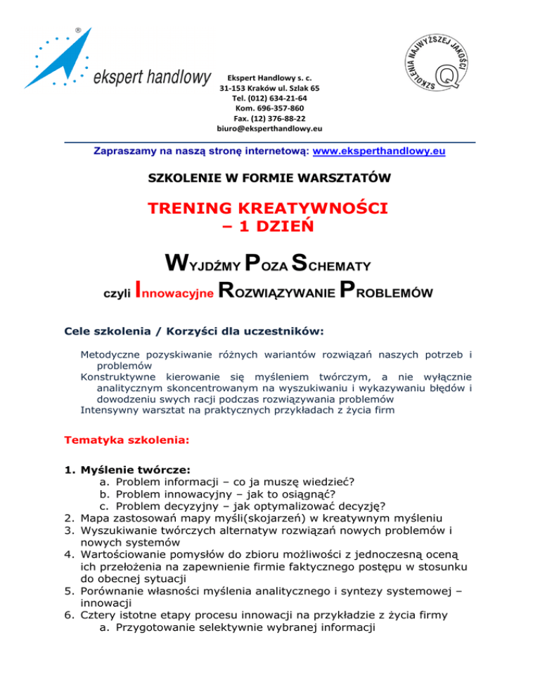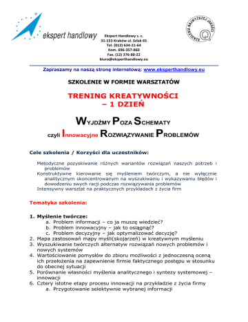 Ekspert Handlowy s. c. 31-153 Kraków ul. Szlak 65 Tel. (012) 634-21-64 Kom. 696-357-860 Fax. (12) 376-88-22 [email protected] Zapraszamy na naszą stronę internetową: www.eksperthandlowy.eu SZKOLENIE W FORMIE WARSZTATÓW TRENING KREATYWNOŚCI – 1 DZIEŃ WYJDŹMY POZA SCHEMATY czyli Innowacyjne ROZWIĄZYWANIE PROBLEMÓW Cele szkolenia / Korzyści dla uczestników: Metodyczne pozyskiwanie różnych wariantów rozwiązań naszych potrzeb i problemów Konstruktywne kierowanie się myśleniem twórczym, a nie wyłącznie analitycznym skoncentrowanym na wyszukiwaniu i wykazywaniu błędów i dowodzeniu swych racji podczas rozwiązywania problemów Intensywny warsztat na praktycznych przykładach z życia firm Tematyka szkolenia: 1. Myślenie twórcze: a. Problem informacji – co ja muszę wiedzieć? b. Problem innowacyjny – jak to osiągnąć? c. Problem decyzyjny – jak optymalizować decyzję? 2. Mapa zastosowań mapy myśli(skojarzeń) w kreatywnym myśleniu 3. Wyszukiwanie twórczych alternatyw rozwiązań nowych problemów i nowych systemów 4. Wartościowanie pomysłów do zbioru możliwości z jednoczesną oceną ich przełożenia na zapewnienie firmie faktycznego postępu w stosunku do obecnej sytuacji 5. Porównanie własności myślenia analitycznego i syntezy systemowej – innowacji 6. Cztery istotne etapy procesu innowacji na przykładzie z życia firmy a. Przygotowanie selektywnie wybranej informacji b. Inkubacja rozwiązania problemu c. Iluminacja i znalezienie rozwiązania problemu (tzw. efekt AHA!) d. Weryfikacja i sprawdzenie istotności rozwiązania e. Kryteria efektywnego oszacowania istotności rozwiązania 7. Metody twórczego myślenia: a. Indywidualne b. Twórczości grupowej 8. Zastosowanie strategii podczas tworzenia innowacji: a. Podważanie b. Negowanie c. Zniekształcanie d. Niekompetencja e. Asocjacje 9. Myślenie równoległe i metoda kreatywnego myślenia CIMDO DeBono 10. Brainstorming – burza mózgów 11. Synektyka 12. Schemat długiej i ciemnej nocy innowatora 13. 6 etapów rozwiązywania problemów 14. IDEAL – 5 kroków tworzenia nowego rozwiązania 15. Mindmapping w praktyce 16. Zalety i wady pracy zespołowej Forma szkolenia i styl trenerski: Szkolenie charakteryzuje się doborem zróżnicowanych metod dydaktyczno — treningowych w celu jak najlepszego przyswojenia wiedzy przez uczestników z przewagą ćwiczeń, pracy zespołowej w rotujących grupach, eksperymentów, metafor i casystudy. Zarówno treści merytoryczne, jak i metodyka szkolenia są każdorazowo dostosowywane do omawianych zagadnień i problemów. Osobowość trenera gwarantuje uczestnikom wysoką dynamikę szkolenia, interaktywny sposób przekazu wiedzy teoretycznej i praktycznej, żywą reakcję na zgłaszane problemy czy sugestie, charakter warsztatowy i twórczy. Trener buduje atmosferę otwartości i zaufania, bazuje na relacjach partnerskich, co pozwala optymalnie zaktywizować grupę do nauki, konstruktywnej samokrytyki połączonej z kreowaniem konkretnych rozwiązań (działań, technik, standardów). Połączenie doświadczenia trenerskiego i menedżerskiego pozwala trenerowi wysoce zmotywować uczestników szkolenia do aktywnego udziału, a przede wszystkim zainspirować do dalszego rozwoju własnego i na rzecz firmy PROWADZĄCY: UZNANY W KRAJU Trener Biznesu, Doradca Manager – Praktyk z doświadczeniem w realizacji szkoleń i projektów doradczych;; posiada wykształcenie biznesowe (AE w Krakowie – Handel Zagraniczny; Ecole Superieure de Commerce de Rouen – Bankowość i Finanse); zajmowała stanowiska menedżerskie w takich koncernach, jak Auchan Polska, Groupe Andre, PPG, głównie w obszarach zarządzania, sprzedaży i obsługi Klienta; w PPG stworzyła od podstaw nowoczesny i wysoce profesjonalny Dział Obsługi Klienta (telemarketing, zespół ds. reklamacji, zespół ds. szkoleń, zarządzanie programem lojalnościowym, Badania Satysfakcji Klientów i Pracowników i Mystery Shopping), którym zarządzała przez 7 lat. Szkoliła kierownictwo i siły sprzedaży strategicznych Klientów firmy oraz zbudowała wewnętrzny zespół trenerski na najwyższym poziomie; to za jej główną przyczyną firma w roku 2003 otrzymała prestiżową nagrodę nadaną przez Kapitułę Programu organizowanego przez Instytut Zarządzania – godło „Firma Przyjazna Klientowi”; inicjator i lider wielu projektów ogólnofirmowych i wdrożeń biznesowych silnie zorientowanych na rozwój zasobów ludzkich i kultury organizacji oraz doskonalenie jakości i poziomu obsługi Klienta; doświadczenie w obszarach zarządzania, sprzedaży, obsługi Klienta/call center, customer marketingu, komunikacji, budowaniu zespołów, edukacji, psychologii Klienta; członek Komitetu Organizacyjnego Projektu HORYZONT mającego na celu zmianę wizerunku i kultury organizacyjnej firmy zatrudniającej 1 400 pracowników o profilu sprzedażowym i produkcyjnym; licencjonowany i certyfikowany Praktyk Wywierania Wpływu i Perswazji oraz Sztuki NLP; prowadzi z pasją i energią szkolenia menedżerski w wielu branżach; Wybrane z wielu firmy przeszkolone: BOT Kopalnia Węgla Brunatnego Bełchatów, Bonus Eurotech Sp z o.o., CENTROFARB Konin, CHEMIA Gdańsk, Getin Bank, NESTLE WATERS POLSKA S.A. Raiffeizen Bank Polska S.A. Fabryka Farb i Lakierów Śnieżka S.A., Przedsiębiorstwo Farmaceutyczne Jelfa S.A. CENTROFARB Konin,Arcelor Mittal , SEMPE TRANS i wiele innych .