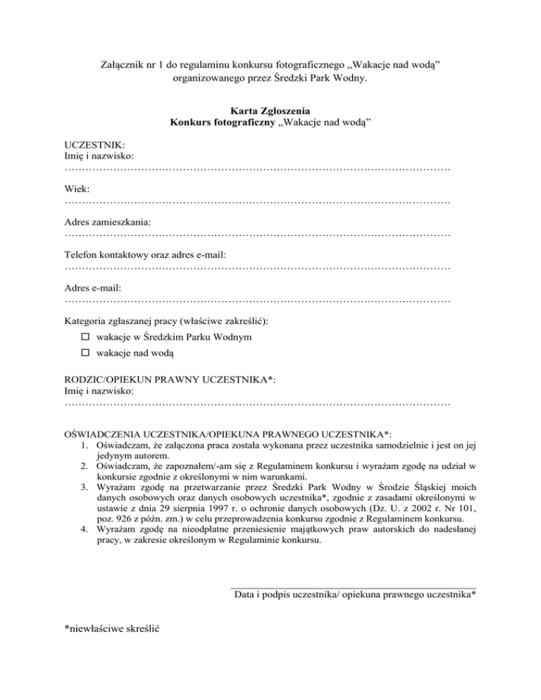 Załącznik nr 1 do regulaminu konkursu fotograficznego „Wakacje nad wodą” organizowanego przez Średzki Park Wodny. Karta Zgłoszenia Konkurs fotograficzny „Wakacje nad wodą” UCZESTNIK: Imię i nazwisko: ………………………………………………………………………………………………… Wiek: ………………………………………………………………………………………………… Adres zamieszkania: ………………………………………………………………………………………………… Telefon kontaktowy oraz adres e-mail: ………………………………………………………………………………………………… Adres e-mail: ………………………………………………………………………………………………… Kategoria zgłaszanej pracy (właściwe zakreślić): wakacje w Średzkim Parku Wodnym wakacje nad wodą RODZIC/OPIEKUN PRAWNY UCZESTNIKA*: Imię i nazwisko: ………………………………………………………………………………………………… OŚWIADCZENIA UCZESTNIKA/OPIEKUNA PRAWNEGO UCZESTNIKA*: 1. Oświadczam, że załączona praca została wykonana przez uczestnika samodzielnie i jest on jej jedynym autorem. 2. Oświadczam, że zapoznałem/-am się z Regulaminem konkursu i wyrażam zgodę na udział w konkursie zgodnie z określonymi w nim warunkami. 3. Wyrażam zgodę na przetwarzanie przez Średzki Park Wodny w Środzie Śląskiej moich danych osobowych oraz danych osobowych uczestnika*, zgodnie z zasadami określonymi w ustawie z dnia 29 sierpnia 1997 r. o ochronie danych osobowych (Dz. U. z 2002 r. Nr 101, poz. 926 z późn. zm.) w celu przeprowadzenia konkursu zgodnie z Regulaminem konkursu. 4. Wyrażam zgodę na nieodpłatne przeniesienie majątkowych praw autorskich do nadesłanej pracy, w zakresie określonym w Regulaminie konkursu. _______________________________________________ Data i podpis uczestnika/ opiekuna prawnego uczestnika* *niewłaściwe skreślić