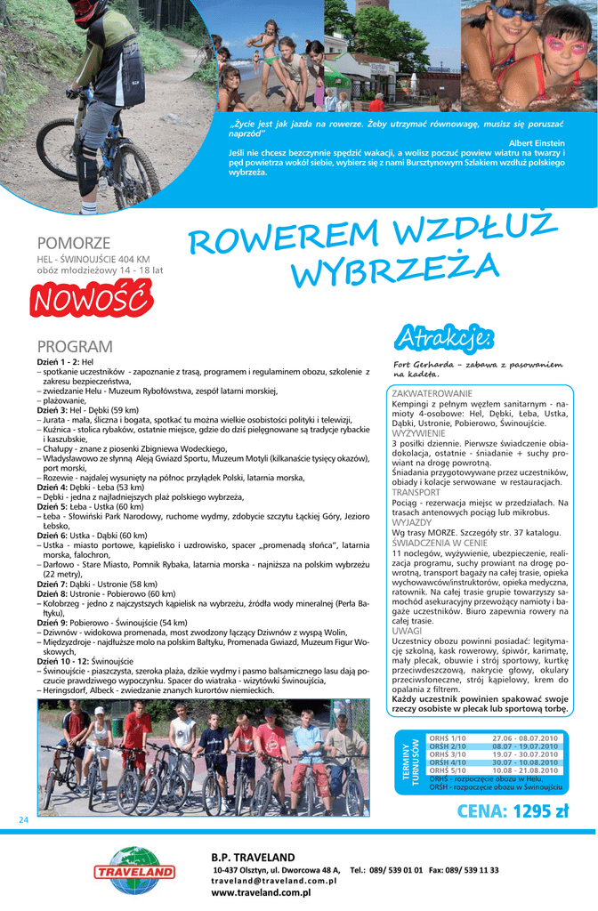 „Życie jest jak jazda na rowerze. Żeby utrzymać równowagę, musisz się poruszać naprzód” Albert Einstein Jeśli nie chcesz bezczynnie spędzić wakacji, a wolisz poczuć powiew wiatru na twarzy i pęd powietrza wokół siebie, wybierz się z nami Bursztynowym Szlakiem wzdłuż polskiego wybrzeża. Ż U Ł D Z W M E ROWER WYBRZEŻA Fort Gerharda - zabawa z pasowaniem na kadeta . Kempingi z pełnym węzłem sanitarnym - namioty 4-osobowe: Hel, Dębki, Łeba, Ustka, Dąbki, Ustronie, Pobierowo, Świnoujście. 3 posiłki dziennie. Pierwsze świadczenie obiadokolacja, ostatnie - śniadanie + suchy prowiant na drogę powrotną. Śniadania przygotowywane przez uczestników, obiady i kolacje serwowane w restauracjach. Pociąg - rezerwacja miejsc w przedziałach. Na trasach antenowych pociąg lub mikrobus. Wg trasy MORZE. Szczegóły str. 37 katalogu. 11 noclegów, wyżywienie, ubezpieczenie, realizacja programu, suchy prowiant na drogę powrotną, transport bagaży na całej trasie, opieka wychowawców/instruktorów, opieka medyczna, ratownik. Na całej trasie grupie towarzyszy samochód asekuracyjny przewożący namioty i bagaże uczestników. Biuro zapewnia rowery na całej trasie. Uczestnicy obozu powinni posiadać: legitymację szkolną, kask rowerowy, śpiwór, karimatę, mały plecak, obuwie i strój sportowy, kurtkę przeciwdeszczową, nakrycie głowy, okulary przeciwsłoneczne, strój kąpielowy, krem do opalania z filtrem. Każdy uczestnik powinien spakować swoje rzeczy osobiste w plecak lub sportową torbę. TERMINY TURNUSÓW Dzień 1 - 2: Hel – spotkanie uczestników - zapoznanie z trasą, programem i regulaminem obozu, szkolenie z zakresu bezpieczeństwa, – zwiedzanie Helu - Muzeum Rybołówstwa, zespół latarni morskiej, – plażowanie, Dzień 3: Hel - Dębki (59 km) – Jurata - mała, śliczna i bogata, spotkać tu można wielkie osobistości polityki i telewizji, – Kuźnica - stolica rybaków, ostatnie miejsce, gdzie do dziś pielęgnowane są tradycje rybackie i kaszubskie, – Chałupy - znane z piosenki Zbigniewa Wodeckiego, – Władysławowo ze słynną Aleją Gwiazd Sportu, Muzeum Motyli (kilkanaście tysięcy okazów), port morski, – Rozewie - najdalej wysunięty na północ przylądek Polski, latarnia morska, Dzień 4: Dębki - Łeba (53 km) – Dębki - jedna z najładniejszych plaż polskiego wybrzeża, Dzień 5: Łeba - Ustka (60 km) – Łeba - Słowiński Park Narodowy, ruchome wydmy, zdobycie szczytu Łąckiej Góry, Jezioro Łebsko, Dzień 6: Ustka - Dąbki (60 km) – Ustka - miasto portowe, kąpielisko i uzdrowisko, spacer „promenadą słońca”, latarnia morska, falochron, – Darłowo - Stare Miasto, Pomnik Rybaka, latarnia morska - najniższa na polskim wybrzeżu (22 metry), Dzień 7: Dąbki - Ustronie (58 km) Dzień 8: Ustronie - Pobierowo (60 km) – Kołobrzeg - jedno z najczystszych kąpielisk na wybrzeżu, źródła wody mineralnej (Perła Bałtyku), Dzień 9: Pobierowo - Świnoujście (54 km) – Dziwnów - widokowa promenada, most zwodzony łączący Dziwnów z wyspą Wolin, – Międzyzdroje - najdłuższe molo na polskim Bałtyku, Promenada Gwiazd, Muzeum Figur Woskowych, Dzień 10 - 12: Świnoujście – Świnoujście - piaszczysta, szeroka plaża, dzikie wydmy i pasmo balsamicznego lasu dają poczucie prawdziwego wypoczynku. Spacer do wiatraka - wizytówki Świnoujścia, – Heringsdorf, Albeck - zwiedzanie znanych kurortów niemieckich. 24 ORHŚ - rozpoczęcie obozu w Helu, ORŚH - rozpoczęcie obozu w Świnoujściu 1295 zł