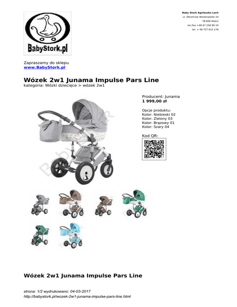 Baby Stork Agnieszka Lach ul. Obrońców Westerplatte 24 78-600 Wałcz tel./fax +48 67 258 90 24 tel. + 48 727 615 176 Zapraszamy do sklepu www.BabyStork.pl Wózek 2w1 Junama Impulse Pars Line kategoria: Wózki dziecięce > wózek 2w1 Producent: Junama 1 999,00 zł Opcje produktu: Kolor: Niebieski 02 Kolor: Zielony 03 Kolor: Brązowy 01 Kolor: Szary 04 Kod QR: Wózek 2w1 Junama Impulse Pars Line strona: 1/2 wydrukowano: 04-03-2017 http://babystork.pl/wozek-2w1-junama-impulse-pars-line.html Wózek uniwersalny Junama Impulse Pars Line to wózek wielofunkcyjny 2w1. Jest to najbardziej popularne rozwiązanie, na które decyduje się większość rodziców. W skład wchodzi gondola, spacerówka oraz stelaż. Dzięki takiemu rozwiązaniu mamy 2w1. Dodatkowo możemy dokupić fotelik samochodowy, który może być montowany na stelażu wózka przy pomocy specjalnego adaptera. Otrzymujemy wtedy zestaw 3w1. W zestawie: - gondola - spacerówka -stelaż z pompowanymi kołami -torba z przewijakiem - zamykany kosz na zakupy - pokrowiec okrycie w gondoli i spacerówce - moskitiera - folia przeciwdeszczowa - uchwyt na kubek Opcje dodatkowe: - fotelik samochodowy - parasolka - rękawiczki - mufki - śpiwór uniwersalny - adaptery do fotelików Wymiary i waga wózka strona: 2/2 wydrukowano: 04-03-2017 http://babystork.pl/wozek-2w1-junama-impulse-pars-line.html