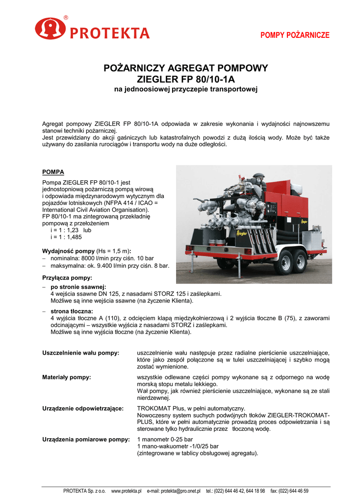 POMPY POśARNICZE POŻARNICZY AGREGAT POMPOWY ZIEGLER FP 80/10-1A na jednoosiowej przyczepie transportowej Agregat pompowy ZIEGLER FP 80/10-1A odpowiada w zakresie wykonania i wydajności najnowszemu stanowi techniki pożarniczej. Jest przewidziany do akcji gaśniczych lub katastrofalnych powodzi z dużą ilością wody. Może być także używany do zasilania rurociągów i transportu wody na duże odległości. POMPA Pompa ZIEGLER FP 80/10-1 jest jednostopniową pożarniczą pompą wirową i odpowiada międzynarodowym wytycznym dla pojazdów lotniskowych (NFPA 414 / ICAO = International Civil Aviation Organisation). FP 80/10-1 ma zintegrowaną przekładnię pompową z przełożeniem i = 1 : 1,23 lub i = 1 : 1,485 Wydajność pompy (Hs = 1,5 m): − nominalna: 8000 l/min przy ciśn. 10 bar − maksymalna: ok. 9.400 l/min przy ciśn. 8 bar. Przyłącza pompy: − po stronie ssawnej: 4 wejścia ssawne DN 125, z nasadami STORZ 125 i zaślepkami. Możliwe są inne wejścia ssawne (na życzenie Klienta). − strona tłoczna: 4 wyjścia tłoczne A (110), z odcięciem klapą międzykołnierzową i 2 wyjścia tłoczne B (75), z zaworami odcinającymi – wszystkie wyjścia z nasadami STORZ i zaślepkami. Możliwe są inne wyjścia tłoczne (na życzenie Klienta). Uszczelnienie wału pompy: uszczelnienie wału następuje przez radialne pierścienie uszczelniające, które jako zespół połączone są w tulei uszczelniającej i szybko mogą zostać wymienione. Materiały pompy: wszystkie odlewane części pompy wykonane są z odpornego na wodę morską stopu metalu lekkiego. Wał pompy, jak również pierścienie uszczelniające, wykonane są ze stali nierdzewnej. Urządzenie odpowietrzające: TROKOMAT Plus, w pełni automatyczny. Nowoczesny system suchych podwójnych tłoków ZIEGLER-TROKOMATPLUS, które w pełni automatycznie prowadzą proces odpowietrzania i są sterowane tylko hydraulicznie przez tłoczoną wodę. Urządzenia pomiarowe pompy: 1 manometr 0-25 bar 1 mano-wakuometr -1/0/25 bar (zintegrowane w tablicy obsługowej agregatu). PROTEKTA Sp. z o.o. www.protekta.pl e-mail: [email protected] tel.: (022) 644 46 42, 644 18 98 fax: (022) 644 46 59 POMPY POśARNICZE SILNIK Silnik Diesel MAN typ D 2876 LE 103 6-cylindrowy silnik jednorzędowy z turbodoładowaniem i chłodzeniem powietrzem doładowującym. Bezpośredni wtrysk Diesel. Wszystkie funkcje silnika sterowane elektronicznie poprzez regulację EDC. Pojemność skokowa: Moc: wg DIN ISO 3046 część 1: moc użytkowa: Max. moment obrotowy: Rodzaj rozruchu: Instalacja elektryczna: Rodzaj chłodzenia: Zbiornik paliwa: Poziom spalin: Oprzyrządowanie: 12 800 cm 3 338 KW (453 KM) przy 2000 1/min 320 KW (429 KM) przy 2000 1/min 2100 Nm przy 900/1300 1/min elektryczny, napięcie użytkowe 24 V generator prądu trójfazowego 28 V, 55 A chłodzenie cyrkulacyjne wodne z chłodzeniem powietrzem doładowującym ok. 170 l (dla 2 godz. pracy agregatu przy pełnym obciążeniu) wg EUROMOT 2 włącznik zapłonu – startu, obrotomierz, wskaźnik ciśnienia oleju, wskaźnik temperatury wody, wskaźnik poziomu paliwa, licznik roboczogodzin, przycisk liczby obrotów silnika +/-, przycisk silnik/stop, oświetlenie oprzyrządowania. Przeniesienie energii między silnikiem i pompą następuje bezpośrednio przez obrotowe sprzęgło elastyczne, które nie jest sterowane. Kompletny agregat posadowiony na stabilnej ramie podstawowej jest zamontowany na przyczepie transportowej o dopuszczalnym ciężarze całkowitym 4.500 kg. Agregat zaopatrzony jest w osłonę (obudowę). URZĄDZENIA DOZUJĄCE ŚRODEK PIANOTWÓRCZY TYP ZIEGLER EAD 80 Zasysacz pianowy przy pompie wraz z elektroniczno – automatycznym urządzeniem dozującym. Urządzenie ZPV EAD 80 składa się z magnetyczno – indukcyjnego przepływomierza na przewodzie tłocznym autopompy, kolejnego magnetyczno – indukcyjnego przepływomierza oraz sterowanego elektrycznie urządzenia dozującego na przewodzie ssawnym, między zbiornikiem środka pianotwórczego a zasysaczem przy pompie. Środek pianotwórczy zasysany jest przez zasysacz przy pompie i dostarczany do wejścia ssawnego autopompy. Sterowanie SPS ocenia sygnały przychodzące z przepływomierza i steruje urządzeniem dozującym odpowiednio do zadanej wielkości domieszki. Zakres przepływu wody: Zakres przepływu środka pianotwórczego: Wielkość domieszki: PROTEKTA Sp. z o.o. www.protekta.pl 100 – 8000 l/min. 1 – 700 l/min. 1 % – 8 %. e-mail: [email protected] tel.: (022) 644 46 42, 644 18 98 fax: (022) 644 46 59