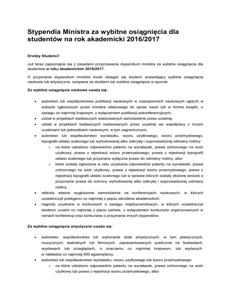 Stypendia Ministra za wybitne osiągnięcia dla studentów na rok akademicki 2016/2017 Drodzy Studenci! Już teraz zapoznajcie się z zasadami przyznawania stypendium ministra za wybitne osiągnięcia dla studentów w roku akademickim 2016/2017. O przyznanie stypendium ministra może ubiegać się student, posiadający wybitne osiągnięcia naukowe lub artystyczne, związane ze studiami lub wybitne osiągnięcia w sporcie. Za wybitne osiągnięcia naukowe uważa się: autorstwo lub współautorstwo publikacji naukowych w czasopismach naukowych ujętych w wykazie ogłoszonym przez ministra właściwego do spraw nauki lub w formie książki, o zasięgu co najmniej krajowym, z wyłączeniem publikacji pokonferencyjnych, udział w projektach badawczych realizowanych samodzielnie przez uczelnię, udział w projektach badawczych realizowanych przez uczelnię we współpracy z innymi uczelniami lub jednostkami naukowymi, w tym zagranicznymi, autorstwo lub współautorstwo wynalazku, wzoru użytkowego, wzoru przemysłowego, topografii układu scalonego lub wyhodowanej albo odkrytej i wyprowadzonej odmiany rośliny: o na które udzielono odpowiednio patentu na wynalazek, prawa ochronnego na wzór użytkowy, prawa z rejestracji wzoru przemysłowego, prawa z rejestracji topografii układu scalonego lub przyznano wyłączne prawo do odmiany rośliny, albo o które zostały zgłoszone w celu uzyskania odpowiednio patentu na wynalazek, prawa ochronnego na wzór użytkowy, prawa z rejestracji wzoru przemysłowego, prawa z rejestracji topografii układu scalonego lub w sprawie których zostały złożone wnioski o przyznanie prawa do ochrony wyhodowanej albo odkrytej i wyprowadzonej odmiany rośliny, referaty własne wygłoszone samodzielnie na konferencjach naukowych, w których uczestniczyli prelegenci co najmniej z pięciu ośrodków akademickich, nagrody uzyskane w konkursach o zasięgu międzynarodowym, w których uczestniczyli studenci uczelni co najmniej z pięciu państw, z wyłączeniem konkursów organizowanych w ramach konferencji oraz konkursów o przyznanie innych stypendiów. Za wybitne osiągnięcia artystyczne uważa się: autorstwo, współautorstwo lub wykonanie dzieł artystycznych, w tym plastycznych, muzycznych, teatralnych lub filmowych, zaprezentowanych publicznie na festiwalach, wystawach lub przeglądach, o znaczeniu co najmniej krajowym, lub wydanych w nakładzie co najmniej 500 egzemplarzy, autorstwo lub współautorstwo wynalazku, wzoru użytkowego lub wzoru przemysłowego: o na które udzielono odpowiednio patentu na wynalazek, prawa ochronnego na wzór użytkowy lub prawa z rejestracji wzoru przemysłowego, albo o które zostały zgłoszone w celu uzyskania odpowiednio patentu na wynalazek, prawa ochronnego na wzór użytkowy lub prawa z rejestracji wzoru przemysłowego, nagrody uzyskane w konkursach artystycznych o znaczeniu międzynarodowym, w których brali udział uczestnicy co najmniej z pięciu państw. Za wybitne osiągnięcia w sporcie uważa się: zajęcie w klasyfikacji indywidualnej albo drużynowej w sportach olimpijskich lub paraolimpijskich, w których działają polskie związki sportowe, co najmniej: o dziesiątego miejsca w igrzyskach olimpijskich, o ósmego miejsca w mistrzostwach świata, o piątego miejsca w młodzieżowych mistrzostwach świata lub mistrzostwach Europy, o trzeciego miejsca w młodzieżowych mistrzostwach Europy, o ww. miejsc w zawodach organizowanych dla osób niepełnosprawnych; zajęcie w klasyfikacji indywidualnej albo drużynowej w sportach, w których działają polskie związki sportowe, co najmniej trzeciego miejsca w: o uniwersjadzie, o akademickich mistrzostwach świata, o akademickich mistrzostwach Europy, o Europejskich Igrzyskach Studentów. Uwaga! O przyznanie stypendium ministra student może ubiegać się nie wcześniej niż po zaliczeniu pierwszego roku studiów. Wyjątek przewidziano dla studenta pierwszego roku studiów drugiego stopnia rozpoczętych w terminie roku od ukończenia studiów pierwszego stopnia. Stypendium na dany rok akademicki może być przyznane studentowi, który zaliczył rok studiów w poprzednim roku akademickim i uzyskał wpis na kolejny rok studiów przewidziany w planie studiów albo został przyjęty na studia drugiego stopnia. Spełnienie ww. warunku zaliczenia roku studiów w poprzednim roku akademickim nie jest wymagane, jeżeli przyczyną niezaliczenia był urlop od zajęć w uczelni udzielony w związku ze stanem jego zdrowia lub z narodzinami dziecka. Studentowi, który po ukończeniu jednego kierunku studiów kontynuuje naukę na drugim kierunku studiów, stypendium nie przysługuje, chyba że kontynuuje on studia po ukończeniu studiów pierwszego stopnia w celu uzyskania tytułu zawodowego magistra lub równorzędnego, jednakże nie dłużej niż przez okres trzech lat. Student może przedstawić swoją kandydaturę do stypendium na każdym z kierunków, na którym studiuje, z tym że może otrzymać tylko jedno stypendium na wskazanym przez siebie kierunku. Kandydatura powinna zawierać wyłącznie osiągnięcia związane z danymi studiami, zatem nie należy przedstawiać osiągnięć związanych z odbywanymi równocześnie innymi studiami albo realizacją innych zainteresowań lub hobby, jak również osiągnięć związanych z pracą zawodową. Przedstawiając swoją kandydaturę do przyznania stypendium, student składa dokumenty potwierdzające uzyskanie wybitnych osiągnięć (wniosek) oraz oświadczenie o wyrażeniu zgody na zamieszczenie jego imienia i nazwiska – w przypadku przyznania stypendium – na stronie internetowej uczelni oraz urzędu obsługującego ministra, który przyznał stypendium. Dodatkowe informacje oraz dokumenty do pobrania znajdują się na stronie internetowej MNiSW: http://www.nauka.gov.pl/komunikaty/informacja-na-temat-stypendiow-ministra-za-wybitne-osiagnieciadla-studentow-na-rok-akademicki-2016-2017.html Kwestie przyznawania stypendiów ministra z