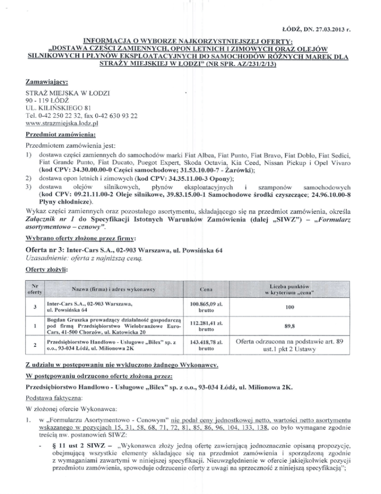 Oferta nr 3: Inter-Cars S.A., 02-903Warszawa,ul, Powsir(ska64