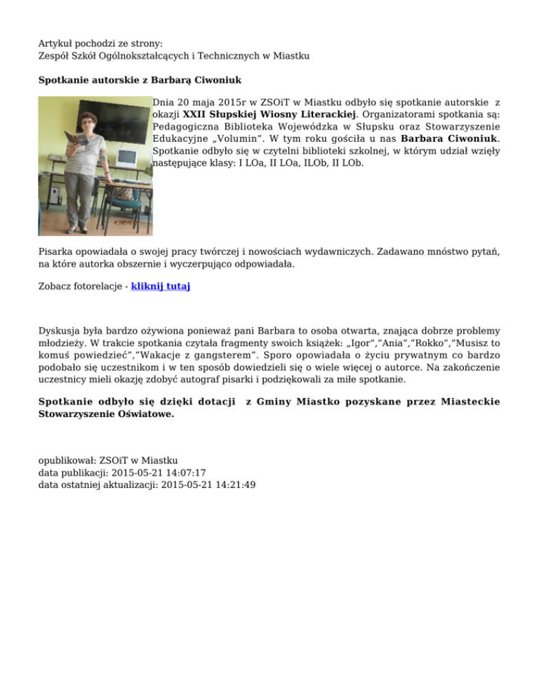 Artykuł pochodzi ze strony: Zespół Szkół Ogólnokształcących i Technicznych w Miastku Spotkanie autorskie z Barbarą Ciwoniuk Dnia 20 maja 2015r w ZSOiT w Miastku odbyło się spotkanie autorskie z okazji XXII Słupskiej Wiosny Literackiej. Organizatorami spotkania są: Pedagogiczna Biblioteka Wojewódzka w Słupsku oraz Stowarzyszenie Edukacyjne „Volumin”. W tym roku gościła u nas Barbara Ciwoniuk. Spotkanie odbyło się w czytelni biblioteki szkolnej, w którym udział wzięły następujące klasy: I LOa, II LOa, ILOb, II LOb. Pisarka opowiadała o swojej pracy twórczej i nowościach wydawniczych. Zadawano mnóstwo pytań, na które autorka obszernie i wyczerpująco odpowiadała. Zobacz fotorelacje - kliknij tutaj Dyskusja była bardzo ożywiona ponieważ pani Barbara to osoba otwarta, znająca dobrze problemy młodzieży. W trakcie spotkania czytała fragmenty swoich książek: „Igor”,”Ania”,”Rokko”,”Musisz to komuś powiedzieć”,”Wakacje z gangsterem”. Sporo opowiadała o życiu prywatnym co bardzo podobało się uczestnikom i w ten sposób dowiedzieli się o wiele więcej o autorce. Na zakończenie uczestnicy mieli okazję zdobyć autograf pisarki i podziękowali za miłe spotkanie. Spotkanie odbyło się dzięki dotacji Stowarzyszenie Oświatowe. z Gminy Miastko pozyskane przez Miasteckie opublikował: ZSOiT w Miastku data publikacji: 2015-05-21 14:07:17 data ostatniej aktualizacji: 2015-05-21 14:21:49