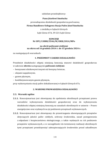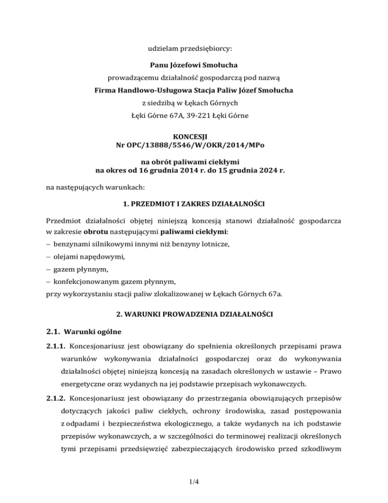 udzielam przedsiębiorcy: Panu Józefowi Smołucha prowadzącemu działalność gospodarczą pod nazwą Firma Handlowo-Usługowa Stacja Paliw Józef Smołucha z siedzibą w Łękach Górnych Łęki Górne 67A, 39-221 Łęki Górne KONCESJI Nr OPC/13888/5546/W/OKR/2014/MPo na obrót paliwami ciekłymi na okres od 16 grudnia 2014 r. do 15 grudnia 2024 r. na następujących warunkach: 1. PRZEDMIOT I ZAKRES DZIAŁALNOŚCI Przedmiot działalności objętej niniejszą koncesją stanowi działalność gospodarcza w zakresie obrotu następującymi paliwami ciekłymi: benzynami silnikowymi innymi niż benzyny lotnicze, olejami napędowymi, gazem płynnym, konfekcjonowanym gazem płynnym, przy wykorzystaniu stacji paliw zlokalizowanej w Łękach Górnych 67a. 2. WARUNKI PROWADZENIA DZIAŁALNOŚCI 2.1. Warunki ogólne 2.1.1. Koncesjonariusz jest obowiązany do spełnienia określonych przepisami prawa warunków wykonywania działalności gospodarczej oraz do wykonywania działalności objętej niniejszą koncesją na zasadach określonych w ustawie – Prawo energetyczne oraz wydanych na jej podstawie przepisach wykonawczych. 2.1.2. Koncesjonariusz jest obowiązany do przestrzegania obowiązujących przepisów dotyczących jakości paliw ciekłych, ochrony środowiska, zasad postępowania z odpadami i bezpieczeństwa ekologicznego, a także wydanych na ich podstawie przepisów wykonawczych, a w szczególności do terminowej realizacji określonych tymi przepisami przedsięwzięć zabezpieczających środowisko przed szkodliwym 1/4 oddziaływaniem działalności wykonywanej na podstawie niniejszej koncesji oraz do posiadania wymaganych zezwoleń i uzgodnień. 2.1.3. Koncesjonariusz jest obowiązany do przestrzegania przepisów ustawy z dnia 18 lipca 2001 r. Prawo wodne (Dz. U. z 2012 r. Nr 145 z późn. zm.), a w szczególności do posiadania pozwoleń wodnoprawnych, gdy są one wymagane. 2.1.4. Koncesjonariusz jest obowiązany do wykonywania działalności w sposób nie stanowiący zagrożenia dla życia lub zdrowia ludzkiego oraz nie narażający na powstanie szkód materialnych. 2.1.5. Koncesjonariusz nie będzie zawierać umów kupna – sprzedaży paliw ciekłych z przedsiębiorstwami energetycznymi, które nie posiadają stosownej koncesji w przypadkach, gdy koncesja taka jest wymagana przepisami ustawy – Prawo energetyczne. 2.2. Szczególne warunki wykonywania działalności objętej koncesją ze względu na właściwą obsługę odbiorców 2.2.1. Koncesjonariusz jest obowiązany do utrzymywania stanu technicznego oraz wyposażenia obiektów, instalacji i urządzeń zapewniających wysoką efektywność i najlepszą jakość wykonywanej działalności objętej niniejszą koncesją, z uwzględnieniem racjonalnego poziomu kosztów, przy zachowaniu obowiązujących przepisów określających wymogi techniczne, w tym metrologiczne, jakościowe i ochrony środowiska oraz do przestrzegania przepisów o bezpieczeństwie i higienie pracy, w tym w szczególności w zakresie bezpieczeństwa pożarowego oraz bezpieczeństwa ludzi i mienia. 2.2.2. W przypadku powierzania, na podstawie zawieranych umów, transportu paliw ciekłych będących przedmiotem obrotu, innym podmiotom, wykorzystującym do tego celu odpowiednią infrastrukturę techniczną, Koncesjonariusz zobowiązany jest do każdorazowego ustalenia, czy środki transportu, którymi dokonywany będzie przewóz paliw, spełniają wszelkie wymogi określone przepisami prawa, w szczególności wymogi metrologiczne oraz potwierdzone dokumentami wystawionymi przez upoważnioną jednostkę, wymogi dotyczące przewozu drogowego towarów niebezpiecznych, w tym wynikające z regulacji w zakresie międzynarodowego przewozu drogowego towarów niebezpiecznych (ADR). 2/4 2.2.3. Koncesjonariusz jest obowiązany do zapewnienia, aby czynności w zakresie samodzielnej eksploatacji instalacji i urządzeń wykonywały wyłącznie osoby legitymujące się posiadaniem wymaganych w tym zakresie kwalifikacji. 2.2.4. Koncesjonariuszowi nie wolno czynić przedmiotem obrotu paliw ciekłych, których parametry jakościowe są niezgodne z parametrami określonymi obowiązującymi przepisami i wynikającymi z zawartych umów. 2.2.5. Koncesjonariusz jest obowiązany do posiadania ważnego dokumentu określającego parametry fizyko – chemiczne danej partii paliwa będącego przedmiotem obrotu, wydanego każdorazowo przez bezpośredniego sprzedawcę tego paliwa, a także do wydania na jego podstawie każdemu przedsiębiorcy prowadzącemu obrót paliwami ciekłymi, a innemu odbiorcy na jego żądanie, oświadczenia we własnym imieniu o zgodności parametrów jakości dostarczonego paliwa z parametrami jakości wynikającymi z obowiązujących w tym zakresie przepisów i z zawartej z odbiorcą umowy. W przypadku importu lub przesunięcia wewnątrzwspólnotowego Koncesjonariusz jest paliw ciekłych obowiązany do określonych niniejszą przeprowadzania kontroli koncesją, jakości wprowadzanych do obrotu paliw celem sprawdzenia dotrzymywania przez te paliwa parametrów jakościowych wynikających z krajowych norm jakościowych określonych w obowiązujących przepisach oraz przekazania wyników badań odbiorcy. 2.2.6. Koncesjonariusz jest zobowiązany do utrzymywania oraz zagwarantowania możliwości pozyskania środków finansowych lub majątku pozwalającego na zaspokojenie roszczeń osób trzecich mogących powstać wskutek niewłaściwego prowadzenia działalności objętej koncesją lub szkód w środowisku. 2.3. Warunki zaprzestania działalności po wygaśnięciu koncesji lub jej cofnięciu 2.3.1. W przypadku, gdy działalność objęta niniejszą koncesją wywiera wpływ na środowisko, Koncesjonariusz jest obowiązany, w trakcie prowadzenia działalności koncesjonowanej oraz po jej zaprzestaniu, do likwidacji skutków tej działalności. 2.4. Sprawozdawczość i udzielanie informacji 2.4.1. Koncesjonariusz jest obowiązany zawiadomić Prezesa URE o istotnych zmiana