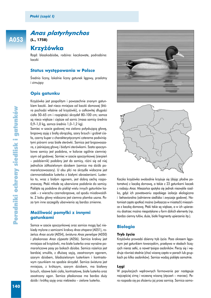 Ptaki (cz´Êç I) Anas platyrhynchos A053 (L., 1758) Krzy˝ówka Rzàd: blaszkodziobe, rodzina: kaczkowate, podrodzina: kaczki Status wyst´powania w Polsce Ârednio liczny, lokalnie liczny gatunek l´gowy, przelotny i zimujàcy Poradniki ochrony siedlisk i gatunków Opis gatunku 140 Krzy˝ówka jest pospolitym i powszechnie znanym gatunkiem kaczki. Jest nieco mniejsza od kaczki domowej (która pochodzi w∏aÊnie od krzy˝ówki), o ca∏kowitej d∏ugoÊci cia∏a 50–65 cm i rozpi´toÊci skrzyde∏ 80–100 cm; samce sà nieco wi´ksze i ci´˝sze od samic (masa samicy Êrednio 0,9–1,0 kg, samca Êrednio 1,0–1,2 kg). Samiec w szacie godowej ma zielono po∏yskujàcà g∏ow´, bràzowà szyj´ z bia∏à obràczkà, szary brzuch i grzbiet cia∏a, czarny kuper z charakterystycznymi czterema podwini´tymi piórami oraz bia∏e sterówki. Samica jest bràzowoszara, z jaÊniejszà g∏owà i bia∏ymi sterówkami. Szata spoczynkowa samicy jest podobna, w kolorze ogólnie ciemniejszym od godowej. Samiec w szacie spoczynkowej (sierpieƒ – paêdziernik) podobny jest do samicy, ró˝ni si´ od niej jednolicie ˝ó∏tozielonym dziobem (samica ma dziób pomaraƒczowoszary). U obu p∏ci na skrzydle widoczne jest ciemnoniebieskie lusterko z bia∏ymi obrze˝eniami. Lusterko to, wraz z bia∏ym ogonem, jest dobrà cechà rozpoznawczà. Ptaki m∏ode sà ubarwione podobnie do samicy. Piskl´ta sà podobne do pisklàt wielu innych gatunków kaczek – z wierzchu czarnobràzowe, od spodu miodowo˝ó∏te. Z boku g∏owy widoczna jest ciemna plamka uszna. Poza tym inne szczegó∏y ubarwienia sà bardzo zmienne. Mo˝liwoÊç pomy∏ki z innymi gatunkami Samce w szacie spoczynkowej oraz samice mogà byç niekiedy mylone z samicami krakwy Anas strepera (A051), ro˝eƒca Anas acuta (A054), Êwistuna Anas penelope (A050) i p∏askonosa Anas clypeata (A056). Samica krakwy jest mniejsza od krzy˝ówki, ma bia∏e lusterko oraz wyraêne pomaraƒczowe pasy po bokach dzioba. Samica ro˝eƒca jest bardziej smuk∏a, z d∏u˝szà szyjà, zaostrzonym ogonem, szarym dziobem, bladozielonym lusterkiem i kontrastowym rysunkiem na spodzie skrzyde∏. Samica Êwistuna jest mniejsza, z krótszym, szarym dziobem, ma bia∏awy brzuch, rdzawe boki cia∏a, kontrastowe, bia∏e lusterko oraz zaostrzony ogon. Samica p∏askonosa ma bardzo du˝y dziób i krótkà szyj´ oraz niebiesko – zielone lusterko. krzy˝ówka Kaczka krzy˝ówka swobodnie krzy˝uje si´ (dajàc p∏odne potomstwo) z kaczkà domowà, a tak˝e z 23 gatunkami kaczek z rodzaju Anas. Mieszaƒce spotyka si´ jednak niezwykle rzadko, gdy˝ ich powstawaniu zapobiega izolacja ekologiczna i behawioralna (odmienne siedliska i zwyczaje godowe). Natomiast cz´sto spotkaç mo˝na (zw∏aszcza w miastach) mieszaƒce z kaczkà domowà. Ptaki takie sà wi´ksze, a w ich upierzeniu dostrzec mo˝na niespotykane u form dzikich elementy (np. bardzo ciemny tu∏ów, du˝e, bia∏e fragmenty upierzenia itp.). Biologia Tryb ˝ycia Krzy˝ówka prowadzi dzienny tryb ˝ycia. Poza okresem l´gowym jest gatunkiem towarzyskim, przebywa w stadach liczàcych nieraz setki, a nawet tysiàce osobników. Pierzy si´ i w´druje równie˝ stadnie (choç wiosnà cz´sto w parach lub grupkach po kilka osobników). Samice wodzà piskl´ta samotnie. L´gi W populacjach w´drownych formowanie par nast´puje najcz´Êciej zimà i wczesnà wiosnà (styczeƒ – marzec). Para rozpada si´ po z∏o˝eniu jaj przez samic´. Samica samo- Anas platyrhynchos (Krzy˝ówka) Krzy˝ówka osiàga dojrza∏oÊç p∏ciowà i przyst´puje do l´gów ju˝ w drugim roku ˝ycia. M∏ode, niedoÊwiadczone ptaki gnie˝d˝à si´ jednak póêno, sk∏adajà ma∏à liczb´ jaj i cz´sto tracà l´gi. Zag´szczenie populacji l´gowej jest bardzo zmienne w zale˝noÊci od siedliska. Najwy˝sze zag´szczenia, wynoszàce ponad 4 p./10 ha, zosta∏y stwierdzone na drobnych zbiornikach wodnych (oczka Êródpolne, starorzecza, torfianki). Na stawach rybnych Êrednie zag´szczenie wynosi 3,5 p./10 ha, na jeziorach 2,2 p./10 ha, jednak w przeliczeniu na powierzchni´ roÊlinnoÊci wynurzonej ponad 30 p./10 ha. W parkach miejskich 1,8 p./10 ha, natomiast ogólnie w miastach 0,9p./10 ha. Na terenach otwartych (∏àki, szuwary) Êrednie zag´szczenie wynosi 1,6 p./10 ha. Dane odnoszàce si´ do wi´kszych powierzchni uzyskano dla dolin rzecznych i krajobrazu rolniczego na nizinach (zag´szczenia odpowiednio 0,9 i 0,08 p./10 ha). Po zakoƒczeniu reprodukcji krzy˝ówki rozpoczynajà pierzenie. Zmieniajà wszystkie pióra w krótkim czasie, równie˝ lotki i sterówki, co wià˝e si´ z utratà zdolnoÊci do lotu. Trwa to oko∏o miesiàca i jest krytycznym momentem ich cyklu ˝yciowego. U samców pierzenie przypada na okres od koƒca maja do lipca. Gromadzà si´ one w tym czasie w du˝e stada, szukajàc miejsc zasobnych w pokarm i jednoczeÊnie zapewniajàcych schronienie przed drapie˝nikami (np. zakrzaczone i trudno dost´pne wysepki). Samice, które utraci∏y l´gi, pierzà si´ wspólnie z samcami, pozosta∏e zaÊ w trakcie wodzenia m∏odych. W´drówki Krzy˝ówka jest gatunkiem w´drownym, ale cz´Êç ptaków jest osiad∏a. Przy sprzyjajàcych warunkach pogodowych i pokarmowych mo˝e zimowaç w kraju. W´drówka jesienna rozpoczyna si´ pod koniec sierpnia i trwa do grudnia. Najwy˝szà liczebnoÊç przelotnych krzy˝ówek notuje si´ z regu∏y na prze∏omie paêdziernika i listopada. Póênà wiosnà i latem, przed rozpocz´ciem zasadniczej w´drówki na zimowiska, krzy˝ówki podejmujà krótkie w´drówki na pierzowiska. W´drówka wiosenna trwa od koƒca stycznia do koƒca kwietnia. Wiosnà ptaki w´drujà w ma∏ych grupkach lub parami. W czasie w´drówek krzy˝ówki spotykane sà na du˝ych, p∏ytkich zbiornikach wodnych, stawach, rzekach oraz p∏ytkich zatokach morskich. Zimowanie Ptaki gnie˝d˝àce si´ w pó∏nocnej cz´Êci Polski zimujà w Europie Zachodniej (od Danii a˝ po pó∏noc