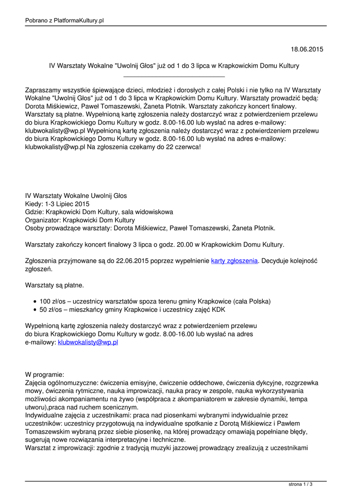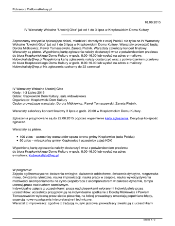 Pobrano z PlatformaKultury.pl 18.06.2015 IV Warsztaty Wokalne "Uwolnij Głos" już od 1 do 3 lipca w Krapkowickim Domu Kultury ____________________________ Zapraszamy wszystkie śpiewające dzieci, młodzież i dorosłych z całej Polski i nie tylko na IV Warsztaty Wokalne "Uwolnij Głos" już od 1 do 3 lipca w Krapkowickim Domu Kultury. Warsztaty prowadzić będą: Dorota Miśkiewicz, Paweł Tomaszewski, Żaneta Plotnik. Warsztaty zakończy koncert finałowy. Warsztaty są płatne. Wypełnioną kartę zgłoszenia należy dostarczyć wraz z potwierdzeniem przelewu do biura Krapkowickiego Domu Kultury w godz. 8.00-16.00 lub wysłać na adres e-mailowy: [email protected] Wypełnioną kartę zgłoszenia należy dostarczyć wraz z potwierdzeniem przelewu do biura Krapkowickiego Domu Kultury w godz. 8.00-16.00 lub wysłać na adres e-mailowy: [email protected] Na zgłoszenia czekamy do 22 czerwca! IV Warsztaty Wokalne Uwolnij Głos Kiedy: 1-3 Lipiec 2015 Gdzie: Krapkowicki Dom Kultury, sala widowiskowa Organizator: Krapkowicki Dom Kultury Osoby prowadzące warsztaty: Dorota Miśkiewicz, Paweł Tomaszewski, Żaneta Plotnik. Warsztaty zakończy koncert finałowy 3 lipca o godz. 20.00 w Krapkowickim Domu Kultury. Zgłoszenia przyjmowane są do 22.06.2015 poprzez wypełnienie karty zgłoszenia. Decyduje kolejność zgłoszeń. Warsztaty są płatne. 100 zł/os – uczestnicy warsztatów spoza terenu gminy Krapkowice (cała Polska) 50 zł/os – mieszkańcy gminy Krapkowice i uczestnicy zajęć KDK Wypełnioną kartę zgłoszenia należy dostarczyć wraz z potwierdzeniem przelewu do biura Krapkowickiego Domu Kultury w godz. 8.00-16.00 lub wysłać na adres e-mailowy: [email protected] W programie: Zajęcia ogólnomuzyczne: ćwiczenia emisyjne, ćwiczenie oddechowe, ćwiczenia dykcyjne, rozgrzewka mowy, ćwiczenia rytmiczne, nauka improwizacji, nauka pracy w zespole, nauka wykorzystywania możliwości akompaniamentu na żywo (współpraca z akompaniatorem w zakresie dynamiki, tempa utworu),praca nad ruchem scenicznym. Indywidualne zajęcia z uczestnikami: praca nad piosenkami wybranymi indywidualnie przez uczestników: uczestnicy przygotowują na indywidualne spotkanie z Dorotą Miśkiewicz i Pawłem Tomaszewskim wybraną przez siebie piosenkę, na której prowadzący omawiają popełniane błędy, sugerują nowe rozwiązania interpretacyjne i techniczne. Warsztat z improwizacji: zgodnie z tradycją muzyki jazzowej prowadzący zrealizują z uczestnikami strona 1 / 3 Pobrano z PlatformaKultury.pl zajęcia z improwizacji na przykładzie utworu bluesowego. Przygotowanie utworu do wspólnego wykonania podczas koncertu finałowego. Więcej o projekcie na stronie Krapkowickiego Domu Kultury lub pod numerami tel. 77 44 60 312, 517 050 288. Prowadzący: DOROTA MIŚKIEWICZ to jedna z najciekawszych polskich wokalistek, współpracująca z największymi tuzami jazzu (Włodzimierzem Nahornym, Tomaszem Stańko, Andrzejem Jagodzińskim, Włodkiem Pawlikiem), koncertująca także z własnym zespołem. Muzykę ma wdrukowaną w geny. Jej ojciec, Henryk Miśkiewicz to znany saksofonista jazzowy, jej brat Michał jest perkusistą u Tomasza Stańki. Dorota rozpoczęła swoją muzyczną drogę jako uczennica w klasie skrzypiec, ale bardzo szybko zrozumiała, że jedyny instrument, jakiego potrzebuje, to jej własne struny głosowe. Ilość projektów, kolaboracji, sesji, koncertów, w jakie angażowała się przez lata swojej obecności na sceniejest niezliczona. Równie nieprzebrana jest ilość gatunków muzycznych, przez które podróżowała. Zakotwiczona w jazzie, wypływała jednak na szerokie wody eksperymentów – zarówno na te bardziej egzotyczne, jak i bliższe polskim brzegom. Współpracowała z Cesarią Evorą, Anną Maria Jopek, Nigelem Kennedym, Janem Ptaszynem Wróblewskim, legendą polskiego jazzu Włodzimierzem Nahornym. Regularnie nagrywa solowe albumy – „Dorota Miśkiewicz Goes to Heaven – Zatrzymaj się” (2002), „Pod rzęsami” (2005), „Caminho” (2008), „Ale” (2012) oraz nagrany z zespołem Kwadrofonik „Lutosławski, Tuwim. Piosenki nie tylko dla dzieci” (2013). www.dorotamiskiewicz.com Paweł Tomaszewski – wybitny polski pianista, kompozytor, aranżer, muzyk sesyjny.Absolwent i Wykładowca na Wydziale Jazzu i Muzyki Rozrywkowej AM w Katowicach. JeLider zespołu Tomaszewski Trio, w którym gra razem z Andrzejem Święsem (kontrabas) i Pawłem Dobrowolskim (perkusja). Jeden z najmłodszych polskich improwizatorów. Występował z wieloma gwiazdami muzyki jazzowej i popularnej, np. niezwykłą kompozytorką i dyrygentką Marią Schneider, Nigelem Kennedym, Larrym Coryellem, Z-Starem, Judy Bady, Michałem Urbaniak, Jarosławem Śmietaną, Piotrem Wojtasikiem, Moniką Brodką, Zbigniewem Wodeckim.W 2009 roku za album kwartetu Grzegorza Nagórskiego z udziałem Tomaszewskiego, Dedication, otrzymał Fryderyka w kategorii Najlepszy Debiut Roku. Nagrody: 2006: Grand Prix i nagroda specjalna Radia Kraków, Międzynarodowy Konkurs Młodych Zespołów Jazzowych „Jazz Juniors”, Kraków, 2006: Grand Prix, Lotos Jazz Festival – Bielska Zadymka Jazzowa, Bielsko-Biała, 2005: 1. nagroda, at the International Jazz Standards Festival, Siedlce, 2004 i 2003: Nagroda indywidualna, Festiwal „Jazz nad Odrą” Festival, Wrocław. www.paweltomaszewski.com Żaneta Plotnik – animator kultury, wokalistka, pedagog edukacji kreatywnej i medialnej, wielokrotna laureatka Festiwali Piosenki, m. in. wystąpiła podczas Krajowego Festiwalu Polskiej Piosenki w Opolu DEBIUTY 2010, reprezentantka Polski w Paryżu w Global Singing Talent Search Avon Voices 2011.Nagrodzona za najlepszy debiut podczas KFPP 2010 w plebiscycie słuchaczy Radia Opole.W 2014 roku za działalność artystyczną otrzymała Nagrodę Marszałka Województwa Opolskiego dla animatorów i twórców kultury Opolizensi Arte Laureato 2014. Założycielka i prowadząca Klubu Wokalisty wspierający młode talenty. Współpraca m.in.