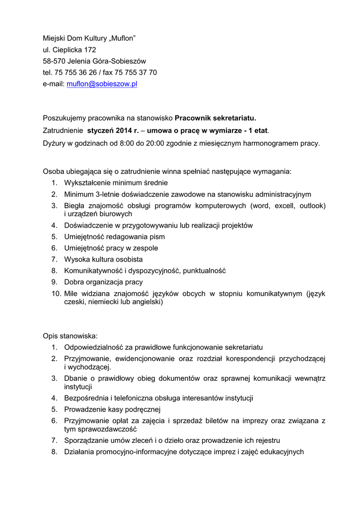 Miejski Dom Kultury „Muflon” ul. Cieplicka 172 58-570 Jelenia Góra-Sobieszów tel. 75 755 36 26 / fax 75 755 37 70 e-mail: [email protected] Poszukujemy pracownika na stanowisko Pracownik sekretariatu. Zatrudnienie styczeń 2014 r. – umowa o pracę w wymiarze - 1 etat. Dyżury w godzinach od 8:00 do 20:00 zgodnie z miesięcznym harmonogramem pracy. Osoba ubiegająca się o zatrudnienie winna spełniać następujące wymagania: 1. Wykształcenie minimum średnie 2. Minimum 3-letnie doświadczenie zawodowe na stanowisku administracyjnym 3. Biegła znajomość obsługi programów komputerowych (word, excell, outlook) i urządzeń biurowych 4. Doświadczenie w przygotowywaniu lub realizacji projektów 5. Umiejętność redagowania pism 6. Umiejętność pracy w zespole 7. Wysoka kultura osobista 8. Komunikatywność i dyspozycyjność, punktualność 9. Dobra organizacja pracy 10. Mile widziana znajomość języków obcych w stopniu komunikatywnym (język czeski, niemiecki lub angielski) Opis stanowiska: 1. Odpowiedzialność za prawidłowe funkcjonowanie sekretariatu 2. Przyjmowanie, ewidencjonowanie oraz rozdział korespondencji przychodzącej i wychodzącej. 3. Dbanie o prawidłowy obieg dokumentów oraz sprawnej komunikacji wewnątrz instytucji 4. Bezpośrednia i telefoniczna obsługa interesantów instytucji 5. Prowadzenie kasy podręcznej 6. Przyjmowanie opłat za zajęcia i sprzedaż biletów na imprezy oraz związana z tym sprawozdawczość 7. Sporządzanie umów zleceń i o dzieło oraz prowadzenie ich rejestru 8. Działania promocyjno-informacyjne dotyczące imprez i zajęć edukacyjnych 9. Przygotowywanie grafiku wynajmowanych pomieszczeń oraz harmonogramu zajęć edukacyjnych. 10. Prowadzenie dokumentacji związanej z zamówieniami. Oferta powinna zawierać: 1. Życiorys z opisem przebiegu zatrudnienia (CV) 2. List motywacyjny 3. Kopie dokumentów potwierdzających doświadczenie zawodowe 4. Kopie dokumentów potwierdzających wykształcenie. Zapraszamy do składania ofert (faksem, e-mailem, osobiście) do dnia 18.12.2013 r. Wymagane dokumenty : list motywacyjny, szczegółowe CV powinny być opatrzone klauzulą: „Wyrażam zgodę na przetwarzanie moich danych osobowych zawartych w ofercie pracy dla potrzeb niezbędnych do realizacji procesu rekrutacji zgodnie z ustawą z dnia 29.08.1997 o ochronie danych osobowych (Dz. U. z 2002 r. Nr 101, poz. 926 ze zmianami ) oraz ustawą z dnia 21.11.2008 r. o pracownikach samorządowych (Dz. U. z 2008 r. Nr 223, poz. 1458 ze zm.) oraz własnoręcznym podpisem.