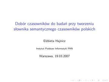 Dobór czasowników do badań przy tworzeniu słownika semantycznego czasowników polskich Elżbieta Hajnicz Instytut Podstaw Informatyki PAN Warszawa, 19.03.2007 Plan referatu I Co to są alternacje; I Typy alternacji — literatura anglojęzyczna; I Kategoria strony w języku polskim; Typy alternacji — literatura polska: I I I alternacja — zmiana pojedynczych wymagań składniowych, transformacja — zmiana strony; I Porównanie podejść; I Źródła danych do doboru czasowników; I Reguły ilościowe doboru czasowników; I Podział wybranych czasowników względem zjawisk syntaktycznych, jakim podlegają; I Nadreprezentacje; I Własności podkorpusu. Alternacje Alternacja jest to regularna wariantywność w syntaktycznym uzewnętrznieniu argumentów czasownikowych. Zasada jest taka, że dwa zdania tworzą alternację, jeśli ich znaczenie jest identyczne (bądź przynajmniej zbliżone) lub też znaczenie jednego jest uszczegółowieniem znaczenia drugiego (zawieranie). W pierwszym przypadku obie alternacje muszą mieć tę samą liczbę argumentów. Alternacje — literatura anglojęzyczna I (1) alternacja datywna (ang. dative): Jan posłał książkę Piotrowi / do Piotra. Jan dał książkę Piotrowi / *do Piotra. Jan dał książkę do introligatora / (−)introligatorowi. Jan dał książkę do introligatora / introligatorowi do oprawy. Alternacje — literatura anglojęzyczna I (1) alternacja datywna (ang. dative): Jan posłał książkę Piotrowi / do Piotra. Jan dał książkę Piotrowi / *do Piotra. Jan dał książkę do introligatora / (−)introligatorowi. Jan dał książkę do introligatora / introligatorowi do oprawy. I Problem: Fabryka wysłała szafę klientowi / do klienta. Fabryka wysłała szafę do magazynu / *magazynowi. Urząd skarbowy wysłał ponaglenie firmie / do firmy Piotra. Urząd skarbowy wysłał ponaglenie do pracy / *pracy (do domu / *domowi) Piotra. (Urząd skarbowy wysłał ponaglenie Piotrowi do firmy/pracy/domu.) Alternacje — literatura anglojęzyczna I (2) alternacja benefaktywna (ang. benefactive): Piotr zostawił/przekazał wiadomość Annie / dla Anny. Maria kupiła/wybrała zabawki dziecku / dla dziecka. Mikołaj rozdał prezenty dzieciom / między dzieci. Alternacje — literatura anglojęzyczna I (2) alternacja benefaktywna (ang. benefactive): Piotr zostawił/przekazał wiadomość Annie / dla Anny. Maria kupiła/wybrała zabawki dziecku / dla dziecka. Mikołaj rozdał prezenty dzieciom / między dzieci. I Problem: Jan posłał książkę dla Piotra (przez jego siostrę). Jan posłał książkę Piotrowi dla Marii. Alternacje — literatura anglojęzyczna I (3) alternacja lokatywna (ang. locative): Piotr (za)ładował ziemniaki na wóz / do worka. Piotr (za)ładował wóz/worek ziemniakami. Jan zapisał uwagi do zeszytu / w zeszycie. Jan zapisał zeszyt uwagami. Grzyb śmierdzi w baraku. Barak / W baraku śmierdzi grzybem / od grzyba. I Wątpliwe: Wybuch zatrząsł domem. Dom zatrząsł się od wybuchu. ?W domu zatrzęsło się od wybuchu. Bluszcz porasta/porósł altanę. Altana porasta/porosła bluszczem. Alternacje — literatura anglojęzyczna I (4) Za przypadek alternacji lokatywnej uważa się także poniższe konstrukcje: Piotr posprzątał/sprzątnął (bałagan) (w pokoju). Piotr posprzątał/sprzątnął pokój (z bałaganu). Maria wytarła (kurz) (z półki / na półce). Maria wytarła półkę (z kurzu). Anna uporządkowała (narzędzia) (w magazynie ). Anna uporządkowała magazyn *z narzędzi. Alternacje — literatura anglojęzyczna I (4) Za przypadek alternacji lokatywnej uważa się także poniższe konstrukcje: Piotr posprzątał/sprzątnął (bałagan) (w pokoju). Piotr posprzątał/sprzątnął pokój (z bałaganu). Maria wytarła (kurz) (z półki / na półce). Maria wytarła półkę (z kurzu). Anna uporządkowała (narzędzia) (w magazynie ). Anna uporządkowała magazyn *z narzędzi. I Problem: Jan Jan Jan Jan Jan Jan zaniósł/przyniósł psa do weterynarza. *zaniósł/przyniósł psa od weterynarza. zaniósł/przyniósł psa weterynarzowi. (= do) zabrał/*odebrał psa do weterynarza. zabrał/odebrał psa od weterynarza. zabrał/odebrał psa weterynarzowi. (≈ od) Alternacje — literatura anglojęzyczna (5) Alternacje rzadziej pojawiające się w języku polskim: I alternacja konatywna (ang. conative): Jan uderzył drzwi. Jan uderzył w drzwi. Jan uderzył się o drzwi. Alternacje — literatura anglojęzyczna (5) Alternacje rzadziej pojawiające się w języku polskim: I alternacja konatywna (ang. conative): Jan uderzył drzwi. Jan uderzył w drzwi. Jan uderzył się o drzwi. I alternacja co/o co (ang. with/against): Jan uderzył ręką/kijem płot. Jan uderzył ręką/kijem w płot. Jan uderzył ręką/kijem o płot. Jan uderzył się ręką/*kijem o płot. *Jan uderzył kij o płot. Alternacje — literatura anglojęzyczna Alternacje uszczegółowiające I alternacja kauzatywna (ang. causative): Piotr zbił szybę (piłką). Piłka zbiła szybę. Gwałtowny podmuch wiatru zbił szybę. Szyba zbiła się. Kelner stłukł całą tacę szklanek. Cała taca szklanek stłukła się (kelnerowi). Ciotka upiekła ciasto (w piekarniku). Ciasto upiekło się (ciotce) (w piekarniku). (6) Alternacje — literatura anglojęzyczna (6) Alternacje uszczegółowiające I alternacja kauzatywna (ang. causative): Piotr zbił szybę (piłką). Piłka zbiła szybę. Gwałtowny podmuch wiatru zbił szybę. Szyba zbiła się. Kelner stłukł całą tacę szklanek. Cała taca szklanek stłukła się (kelnerowi). Ciotka upiekła ciasto (w piekarniku). Ciasto upiekło się (ciotce) (w piekarniku). I Problem: Kucharz stopił masło (w garnku / na ogniu / ?ogniem). Ogień/*Garnek stopił masło. Masło stopiło się. Alternacje — literatura anglojęzyczna I (7) alternacja kauzatywna z odbiorcą akcji: Jeździec popędził/pognał konia (przez las). Koń popędził/pognał (przez las). Piotr powlókł Marię do kina. Maria powlok