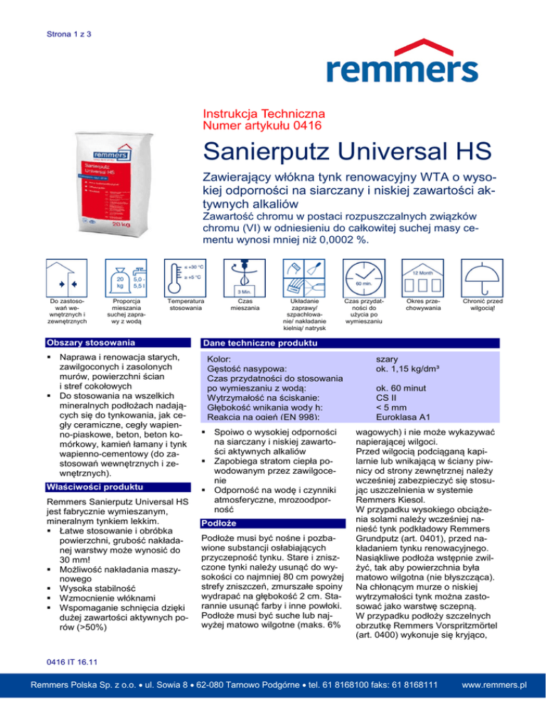 Strona 1 z 3 Instrukcja Techniczna Numer artykułu 0416 Sanierputz Universal HS Zawierający włókna tynk renowacyjny WTA o wysokiej odporności na siarczany i niskiej zawartości aktywnych alkaliów Zawartość chromu w postaci rozpuszczalnych związków chromu (VI) w odniesieniu do całkowitej suchej masy cementu wynosi mniej niż 0,0002 %. Do zastosowań wewnętrznych i zewnętrznych Proporcja mieszania suchej zaprawy z wodą Temperatura stosowania Obszary stosowania Naprawa i renowacja starych, zawilgoconych i zasolonych murów, powierzchni ścian i stref cokołowych Do stosowania na wszelkich mineralnych podłożach nadających się do tynkowania, jak cegły ceramiczne, cegły wapienno-piaskowe, beton, beton komórkowy, kamień łamany i tynk wapienno-cementowy (do zastosowań wewnętrznych i zewnętrznych). Właściwości produktu Remmers Sanierputz Universal HS jest fabrycznie wymieszanym, mineralnym tynkiem lekkim. Łatwe stosowanie i obróbka powierzchni, grubość nakładanej warstwy może wynosić do 30 mm! Możliwość nakładania maszynowego Wysoka stabilność Wzmocnienie włóknami Wspomaganie schnięcia dzięki dużej zawartości aktywnych porów (>50%) Czas mieszania Układanie zaprawy/ szpachlowanie/ nakładanie kielnią/ natrysk Czas przydatności do użycia po wymieszaniu Okres przechowywania Chronić przed wilgocią! Dane techniczne produktu Kolor: Gęstość nasypowa: Czas przydatności do stosowania po wymieszaniu z wodą: Wytrzymałość na ściskanie: Głębokość wnikania wody h: Reakcja na ogień (EN 998): Spoiwo o wysokiej odporności na siarczany i niskiej zawartości aktywnych alkaliów Zapobiega stratom ciepła powodowanym przez zawilgocenie Odporność na wodę i czynniki atmosferyczne, mrozoodporność Podłoże Podłoże musi być nośne i pozbawione substancji osłabiających przyczepność tynku. Stare i zniszczone tynki należy usunąć do wysokości co najmniej 80 cm powyżej strefy zniszczeń, zmurszałe spoiny wydrapać na głębokość 2 cm. Starannie usunąć farby i inne powłoki. Podłoże musi być suche lub najwyżej matowo wilgotne (maks. 6% szary ok. 1,15 kg/dm³ ok. 60 minut CS II < 5 mm Euroklasa A1 wagowych) i nie może wykazywać napierającej wilgoci. Przed wilgocią podciąganą kapilarnie lub wnikającą w ściany piwnicy od strony zewnętrznej należy wcześniej zabezpieczyć się stosując uszczelnienia w systemie Remmers Kiesol. W przypadku wysokiego obciążenia solami należy wcześniej nanieść tynk podkładowy Remmers Grundputz (art. 0401), przed nakładaniem tynku renowacyjnego. Nasiąkliwe podłoża wstępnie zwilżyć, tak aby powierzchnia była matowo wilgotna (nie błyszcząca). Na chłonącym murze o niskiej wytrzymałości tynk można zastosować jako warstwę sczepną. W przypadku podłoży szczelnych obrzutkę Remmers Vorspritzmörtel (art. 0400) wykonuje się kryjąco, 0416 IT 16.11 Remmers Polska Sp. z o.o. • ul. Sowia 8 • 62-080 Tarnowo Podgórne • tel. 61 8168100 faks: 61 8168111 www.remmers.pl Strona 2 z 3 na pozostałych - brodawkowo. Na podłożach pokrytych mineralnymi szlamami uszczelniającymi (np. Sulfatexschlämme, art. 0430) obrzutkę Remmers Vorspritzmörtel nakłada się kryjąco na ostatnią, jeszcze świeżą warstwę szlamu. Przyczepność obrzutki można poprawić przez dodanie preparatu Remmers Haftfest (art. 0220). Po stwardnieniu obrzutki (24-48 godzin) można nakładać tynk. Sposób stosowania Wlać najpierw 5,0 - 5,5 l wody do czystego pojemnika na zaprawę i wsypać 20 kg Sanierputz Universal HS, po czym wymieszać za pomocą odpowiedniej mieszarki (np. mieszarki przeciwbieżnej BEBA) przez ok. 3 minuty, aż do uzyskania właściwej jednorodnej konsystencji. Dla agregatów tynkarskich obowiązują odpowiednie ilości wody zarobowej, uzależnione od zastosowanego ślimaka podającego. Sanierputz Universal HS nakłada się pojedynczymi warstwami o grubości 2 do 3 cm. Przy czym najpierw nanosi się tynk jako warstwę kontaktową, pozostawia na krótki czas aby zaprawa lekko związała i uzupełnia do przewidzianej grubości tynku. W przypadku bardzo nierównego i spękanego podłoża, należy nakładać tynk w dwóch warstwach aby uniknąć dużych różnic w grubości warstwy co grozi powstawaniem rys i odspojeniem. Pierwszej warstwie należy nadać szorstkość w celu zapewnienia dobrej przyczepności drugiej warstwy, np. grzebieniem tynkarskim. Nakładanie drugiej warstwy następuje po wystarczającym stwardnieniu pierwszej warstwy, najwcześniej na drugi dzień. Jeżeli jednak pozostaje do dyspozycji jedynie krótki czas, można pracować w jednym cyklu, a mianowicie nakładać dwie warstwy "mokre na mokre" (mokre na wilgotne). Pomiędzy warstwami należy wtedy ułożyć tkaninę zbrojącą iQ-Tex 6,5/100 (art. 0236). Także w przypadku krytycznych podłoży zalecamy wbudowanie tkaniny zbrojącej na głębokości równej jednej trzeciej grubości tynku. Świeżo nałożoną zaprawę tynkarską Sanierputz Universal HS ściąga się w jedną stronę zwilżoną łatą ząbkowaną a w drugą łatą aluminiową, pozostawiając szorstką powierzchnię. Po zmatowieniu powierzchni, można ją ostrożnie wykończyć pacą pokrytą miękką gąbką, po dalszym stwardnieniu wykańcza się ostatecznie powierzchnię tą samą pacą. Jeżeli wymagane jest uzyskanie bardzo gładkiej, drobnoziarnistej faktury, po wystarczającym stwardnieniu przeciera się powierzchnię tynku kratowym zdzierakiem, nakładanie tynku drobnoziarnistego Remmers Feinputz (art. nr 0408) może nastąpić najwcześniej po 3 dniach. Dekoracyjne, fakturowane warstwy wierzchnie można wykonać z zaprawy Remmers Dekorputz L (art. 0515). Spełnia wymagania WTA. Wskazówki Stężałej zaprawy nie wolno ponownie zarabiać dodając wody lub świeżej zaprawy. Nie stosować przy temperaturach powietrza, podłoża i materiału poniżej +5°C i przekraczających 30°C. Podane parametry produktu określono w warunkach laboratoryjnych