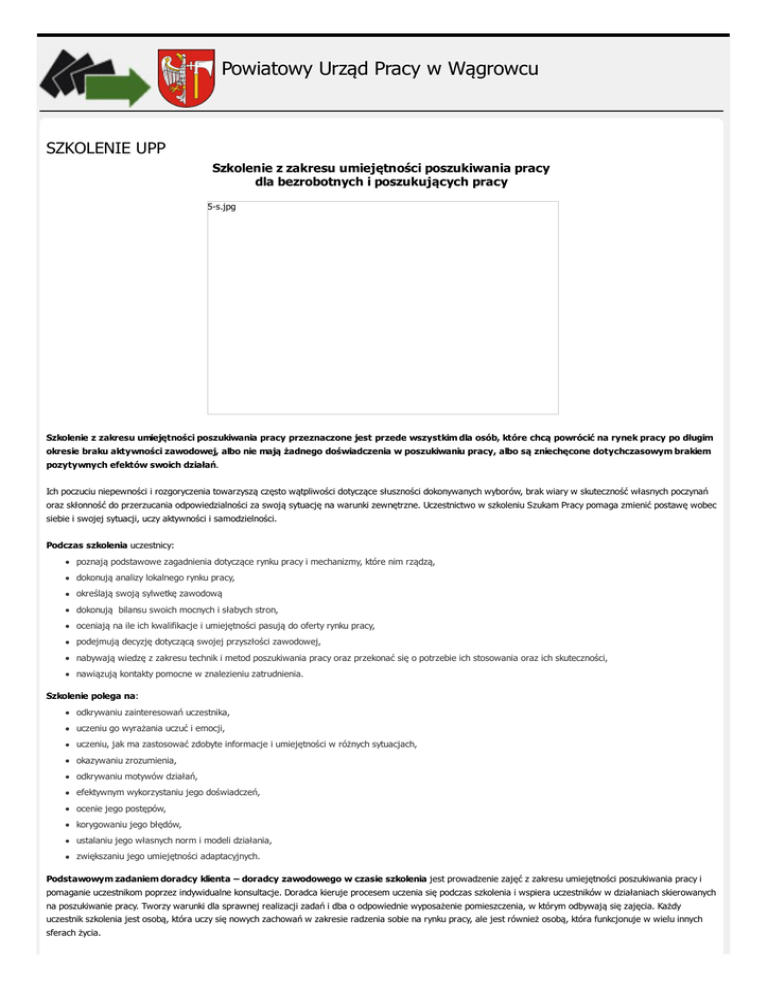 Powiatowy Urząd Pracy w Wągrowcu SZKOLENIE UPP Szkolenie z zakresu umiejętności poszukiwania pracy dla bezrobotnych i poszukujących pracy 5-s.jpg Szkolenie z zakresu umiejętności poszukiwania pracy przeznaczone jest przede wszystkim dla osób, które chcą powrócić na rynek pracy po długim okresie braku aktywności zawodowej, albo nie mają żadnego doświadczenia w poszukiwaniu pracy, albo są zniechęcone dotychczasowym brakiem pozytywnych efektów swoich działań. Ich poczuciu niepewności i rozgoryczenia towarzyszą często wątpliwości dotyczące słuszności dokonywanych wyborów, brak wiary w skuteczność własnych poczynań oraz skłonność do przerzucania odpowiedzialności za swoją sytuację na warunki zewnętrzne. Uczestnictwo w szkoleniu Szukam Pracy pomaga zmienić postawę wobec siebie i swojej sytuacji, uczy aktywności i samodzielności. Podczas szkolenia uczestnicy: poznają podstawowe zagadnienia dotyczące rynku pracy i mechanizmy, które nim rządzą, dokonują analizy lokalnego rynku pracy, określają swoją sylwetkę zawodową dokonują bilansu swoich mocnych i słabych stron, oceniają na ile ich kwalifikacje i umiejętności pasują do oferty rynku pracy, podejmują decyzję dotyczącą swojej przyszłości zawodowej, nabywają wiedzę z zakresu technik i metod poszukiwania pracy oraz przekonać się o potrzebie ich stosowania oraz ich skuteczności, nawiązują kontakty pomocne w znalezieniu zatrudnienia. Szkolenie polega na: odkrywaniu zainteresowań uczestnika, uczeniu go wyrażania uczuć i emocji, uczeniu, jak ma zastosować zdobyte informacje i umiejętności w różnych sytuacjach, okazywaniu zrozumienia, odkrywaniu motywów działań, efektywnym wykorzystaniu jego doświadczeń, ocenie jego postępów, korygowaniu jego błędów, ustalaniu jego własnych norm i modeli działania, zwiększaniu jego umiejętności adaptacyjnych. Podstawowym zadaniem doradcy klienta – doradcy zawodowego w czasie szkolenia jest prowadzenie zajęć z zakresu umiejętności poszukiwania pracy i pomaganie uczestnikom poprzez indywidualne konsultacje. Doradca kieruje procesem uczenia się podczas szkolenia i wspiera uczestników w działaniach skierowanych na poszukiwanie pracy. Tworzy warunki dla sprawnej realizacji zadań i dba o odpowiednie wyposażenie pomieszczenia, w którym odbywają się zajęcia. Każdy uczestnik szkolenia jest osobą, która uczy się nowych zachowań w zakresie radzenia sobie na rynku pracy, ale jest również osobą, która funkcjonuje w wielu innych sferach życia. Celem szkolenia Szukam Pracy jest więc zmiana sposobu myślenia każdego z uczestników zarówno o swojej sytuacji zawodowej jak i o swoim funkcjonowaniu pod kątem innych aspektów życia. Powiatowy Urząd Pracy w Wągrowcu zaprasza do korzystania ze szkolenia z zakresu umiejętności poszukiwania pracy dla bezrobotnych i poszukujących pracy ! Jeśli chcesz uczestniczyć w takim szkoleniu zasygnalizuj to swemu doradcy klienta ! Tagi