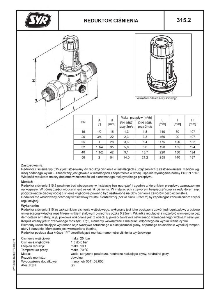 315.2 REDUKTOR CIŚNIENIA W skaźnik ciśnienia wyjściowego DN A ["] d [mm] 15 1/2 20 25 Maks. przepływ [m3/h] L [mm] I [mm] H [mm] 140 80 107 PN 1567 przy 2m/s DIN 1988 przy 3m/s 15 1,3 1,8 3/4 22 2,3 3,3 160 90 107 1 28 3,6 5,4 175 100 132 32 1 1/4 35 5,8 8,6 190 105 194 40 1 1/2 42 9,1 13,7 220 130 194 50 2 54 14,0 21,2 255 140 187 Zastosowanie: Reduktor ciśnienia typ 315.2 jest stosowany do redukcji ciśnienia w instalacjach i urządzeniach z zastosowaniem mediów wg. niżej podanego wykazu. Stosowany jest głównie w instalacjach zaopatrzenia w wodę i spełnia wymagania normy PN EN 1567. Wielkość reduktora należy dobierać w zależności od planowanego maksymalnego przepływu. Montaż: Reduktor ciśnienia 315.2 powinien być wbudowany w instalację bez naprężeń i zgodnie z kierunkiem przepływu zaznaczonym na korpusie. W górnrj części widoczny jest wskaźnik ciśnienia. W instalacjach z zaworem bezpieczeństwa za reduktorem (np. podgrzewacze ciepłej wody) ciśnienie wyjściowe powinno być nastawione na 80% ciśnienia zaworów bezpieczeństwa. Reduktor ma wbudowany ochronny filtr siatkowy ze stali nierdzewnej (oczka siatki 0.25mm) by zapobiegać zabrudzeniom części regulacyjnej. SYR/012k12/H USTY/KARTA Wykonanie: Reduktor ciśnienia 315 ze wskaźnikiem ciśnienia wyjściowego, wykonany jest jako odciążony zawór jednogniazdowy z osiowo umieszczoną wkładką wraz filtrem - sitkiem stalowym o średnicy oczka 0,25mm. Wkładka regulacyjna może być wymieniona bez demontażu armatury, a jej pokrywa wykonana jest z wysokiej jakości tworzywa sztucznego wzmacnianego włóknem szlanym. Korpus odlany jest z czerwonego mosiądzu Rg5, elementy wewnętrzne z materiału odpornego na wypłukiwanie cynku. Elementy uszczelniające wykonane są z tworzywa sztucznego o elastyczności gumy, odpornego na działanie wysokiej temper atury i starzenie. Membrana jest wzmacniana tkaniną. Reduktor posiada dwa króćce 1/4" umożliwiające montaż manometru ciśnienia wyjściowego. Ciśnienie wejściowe: Ciśnienie wyjściowe: Stopień redukcji: Temperatura pracy: Media: Pozycja montażu: Wyposażenie dodatkowe: Atest PZH: maks. 25 bar 1,5 do 6 bar maks. 10:1 maks. 70 °C woda, sprężone powietrze, neutralne nieklejące płyny, neutralne gazy dowolna manometr 0011.08.000 tak Numery katalogowe śrubunków*: (* składa się z 1szt. śrubunku, 1szt. tuleja gwintowana, 1szt. uszczelki) DN15 DN20 DN25 DN32 DN40 DN50 0812.15.900 0812.20.900 0812.25.900 0812.32.900 0812.40.900 0812.50.900