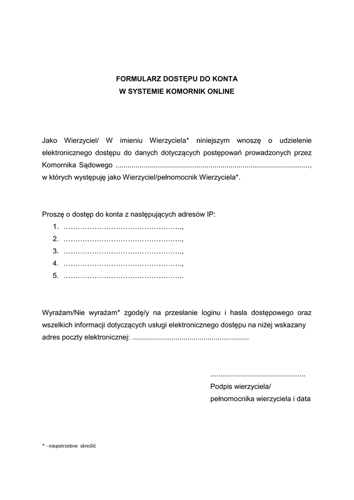 FORMULARZ DOSTĘPU DO KONTA W SYSTEMIE KOMORNIK ONLINE Jako Wierzyciel/ W imieniu Wierzyciela* niniejszym wnoszę o udzielenie elektronicznego dostępu do danych dotyczących postępowań prowadzonych przez Komornika Sądowego .................................................................................................., w których występuję jako Wierzyciel/pełnomocnik Wierzyciela*. Proszę o dostęp do konta z następujących adresów IP: 1. ………………………………………….., 2. ………………………………………….., 3. ………………………………………….., 4. ………………………………………….., 5. …………………………………………... Wyrażam/Nie wyrażam* zgodę/y na przesłanie loginu i hasła dostępowego oraz wszelkich informacji dotyczących usługi elektronicznego dostępu na niżej wskazany adres poczty elektronicznej: ........................................................... ................................................ Podpis wierzyciela/ pełnomocnika wierzyciela i data * - niepotrzebne skreślić
