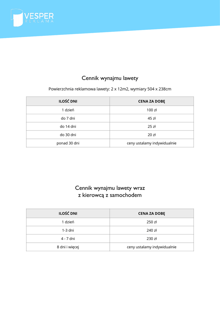 Cennik wynajmu lawety Powierzchnia reklamowa lawety: 2 x 12m2, wymiary 504 x 238cm ILOŚĆ DNI CENA ZA DOBĘ 1 dzień 100 zł do 7 dni 45 zł do 14 dni 25 zł do 30 dni 20 zł ponad 30 dni ceny ustalamy indywidualnie Cennik wynajmu lawety wraz z kierowcą z samochodem ILOŚĆ DNI CENA ZA DOBĘ 1 dzień 250 zł 1-3 dni 240 zł 4 - 7 dni 230 zł 8 dni i więcej ceny ustalamy indywidualnie Usługi dodatkowe Wynajem głośnika 20 zł / doba Przygotowanie spotu audio 250 zł Wydruk bannera 220 zł / 12 m2 Przygotowanie lawety do kampanii (montaż bannera 2 strony) 60 zł Transport lawety Na terenie miasta Gliwice 50 zł Poza miasto Gliwice 1,50 zł/km Wszystkie ceny są cenami netto. 791-552-191 VESPER REKLAMA Łukasz Gacek HALA WIDOWISKOWO-SPORTOWA "Górnych Wałów" Ul. Górnych Wałów 29 44-100 Gliwice [email protected] www.reklamavesper.pl