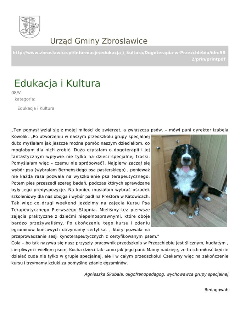 Urząd Gminy Zbrosławice http://www.zbroslawice.pl/Informacje/edukacja_i_kultura/Dogoterapia-w-Przezchlebiu/idn:58 2/prin/printpdf Edukacja i Kultura 08/V kategoria: Edukacja i Kultura „Ten pomysł wziął się z mojej miłości do zwierząt, a zwłaszcza psów. – mówi pani dyrektor Izabela Kowolik. „Po utworzeniu w naszym przedszkolu grupy specjalnej dużo myślałam jak jeszcze można pomóc naszym dzieciakom, co mogłabym dla nich zrobić. Dużo czytałam o dogoterapii i jej fantastycznym wpływie nie tylko na dzieci specjalnej troski. Pomyślałam więc – czemu nie spróbować?. Najpierw zaczął się wybór psa (wybrałam Berneńskiego psa pasterskiego) , ponieważ nie każda rasa pozwala na wyszkolenie psa terapeutycznego. Potem pies przeszedł szereg badań, podczas których sprawdzane były jego predyspozycje. Na koniec musiałam wybrać ośrodek szkoleniowy dla nas obojga i wybór padł na Prestora w Katowicach. Tak więc co drugi weekend jeździmy na zajęcia Kursu Psa Terapeutycznego Pierwszego Stopnia. Mieliśmy też pierwsze zajęcia praktyczne z dziećmi niepełnosprawnymi, które oboje bardzo przeżywaliśmy. Po ukończeniu tego kursu i zdaniu egzaminów końcowych otrzymamy certyfikat , który pozwala na przeprowadzanie sesji kynoterapeutycznych z certyfikowanym psem." Cola – bo tak nazywa się nasz przyszły pracownik przedszkola w Przezchlebiu jest ślicznym, kudłatym , cierpliwym i wielkim psem. Kocha dzieci tak samo jak jego pani. Mamy nadzieję, że ta ich miłość będzie działać cuda nie tylko w grupie specjalnej, ale i w całym przedszkolu! Czekamy więc na zakończenie kursu i trzymamy kciuki za pomyślne zdanie egzaminów. Agnieszka Skubała, oligofrenopedagog, wychowawca grupy specjalnej Redagował: