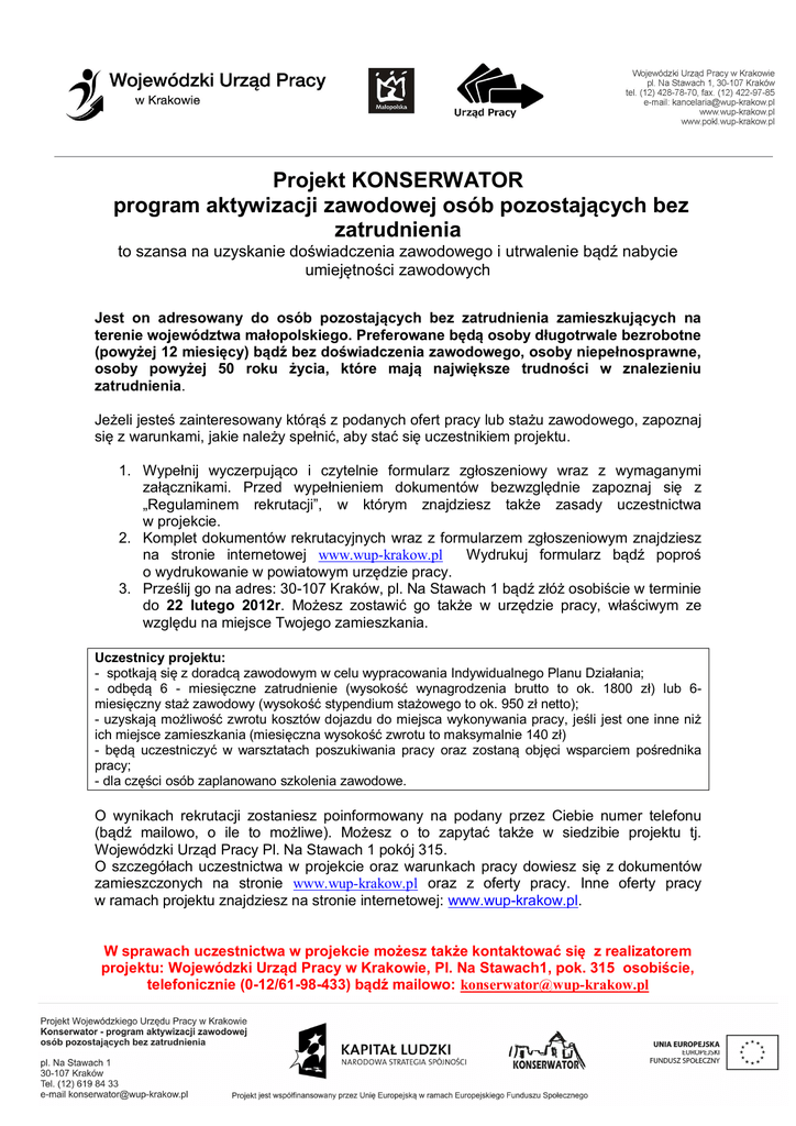Projekt KONSERWATOR program aktywizacji zawodowej osób pozostających bez zatrudnienia to szansa na uzyskanie doświadczenia zawodowego i utrwalenie bądź nabycie umiejętności zawodowych Jest on adresowany do osób pozostających bez zatrudnienia zamieszkujących na terenie województwa małopolskiego. Preferowane będą osoby długotrwale bezrobotne (powyżej 12 miesięcy) bądź bez doświadczenia zawodowego, osoby niepełnosprawne, osoby powyżej 50 roku życia, które mają największe trudności w znalezieniu zatrudnienia. Jeżeli jesteś zainteresowany którąś z podanych ofert pracy lub stażu zawodowego, zapoznaj się z warunkami, jakie należy spełnić, aby stać się uczestnikiem projektu. 1. Wypełnij wyczerpująco i czytelnie formularz zgłoszeniowy wraz z wymaganymi załącznikami. Przed wypełnieniem dokumentów bezwzględnie zapoznaj się z „Regulaminem rekrutacji”, w którym znajdziesz także zasady uczestnictwa w projekcie. 2. Komplet dokumentów rekrutacyjnych wraz z formularzem zgłoszeniowym znajdziesz na stronie internetowej www.wup-krakow.pl Wydrukuj formularz bądź poproś o wydrukowanie w powiatowym urzędzie pracy. 3. Prześlij go na adres: 30-107 Kraków, pl. Na Stawach 1 bądź złóż osobiście w terminie do 22 lutego 2012r. Możesz zostawić go także w urzędzie pracy, właściwym ze względu na miejsce Twojego zamieszkania. Uczestnicy projektu: - spotkają się z doradcą zawodowym w celu wypracowania Indywidualnego Planu Działania; - odbędą 6 - miesięczne zatrudnienie (wysokość wynagrodzenia brutto to ok. 1800 zł) lub 6miesięczny staż zawodowy (wysokość stypendium stażowego to ok. 950 zł netto); - uzyskają możliwość zwrotu kosztów dojazdu do miejsca wykonywania pracy, jeśli jest one inne niż ich miejsce zamieszkania (miesięczna wysokość zwrotu to maksymalnie 140 zł) - będą uczestniczyć w warsztatach poszukiwania pracy oraz zostaną objęci wsparciem pośrednika pracy; - dla części osób zaplanowano szkolenia zawodowe. O wynikach rekrutacji zostaniesz poinformowany na podany przez Ciebie numer telefonu (bądź mailowo, o ile to możliwe). Możesz o to zapytać także w siedzibie projektu tj. Wojewódzki Urząd Pracy Pl. Na Stawach 1 pokój 315. O szczegółach uczestnictwa w projekcie oraz warunkach pracy dowiesz się z dokumentów zamieszczonych na stronie www.wup-krakow.pl oraz z oferty pracy. Inne oferty pracy w ramach projektu znajdziesz na stronie internetowej: www.wup-krakow.pl. W sprawach uczestnictwa w projekcie możesz także kontaktować się z realizatorem projektu: Wojewódzki Urząd Pracy w Krakowie, Pl. Na Stawach1, pok. 315 osobiście, telefonicznie (0-12/61-98-433) bądź mailowo: [email protected]