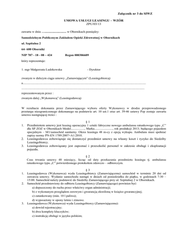 Załącznik nr 3 do SIWZ UMOWA USŁUGI LEASINGU – WZÓR ZPU/03/13 zawarta w dniu …........................... w Obornikach pomiędzy: Samodzielnym Publicznym Zakładem Opieki Zdrowotnej w Obornikach ul. Szpitalna 2 64- 600 Oborniki NIP 787 - 18 - 08 – 424 Regon 000306609 który reprezentuje: 1. mgr Małgorzata Ludzkowska - Dyrektor zwanym w dalszym ciągu umowy „Zamawiającym” (Leasingobiorcą) a........................................................................................................................................................... ........................................................................................................................................................... reprezentowanym przez : zwanym dalej „Wykonawcą” (Leasingodawcą) W rezultacie dokonania przez Zamawiającego wyboru oferty Wykonawcy w drodze przeprowadzonego przetargu nieograniczonego dokonanego na podstawie art. 10 ust.1 oraz art. 39-46 ustawy Pzp zostaje zawarta umowa następującej treści : §1 1. Przedmiotem umowy jest leasing operacyjny 1 sztuki fabryczne nowego ambulansu ratunkowego typu „C” dla SP ZOZ w Obornikach Model................., Marka......................., rok produkcji 2013; będącego pojazdem specjalnym – M1/samochód sanitarny. Okres leasingu 48 m-cy z opcją wykupu. Ambulans musi spełniać zapisy normy PN-EN 1789:2007+A1:2010. 2. Leasingodawca zobowiązuje się dostarczyć przedmiot umowy na własny koszt i ryzyko do Siedziby Leasingobiorcy. 3. Leasingodawca zobowiązany jest zapoznać i przeszkolić personel w zakresie obsługi i eksploatacji pojazdu. §2 Czas trwania umowy 48 miesięcy, licząc od daty przekazania przedmiotu leasingu tj. ambulansu ratunkowego typu „C” potwierdzonego protokołem zdawczo – odbiorczym. §3 1. Leasingodawca (Wykonawca) wyda Leasingobiorcy (Zamawiającemu) samochód w terminie 20 dni od zawarcia umowy. Wydanie samochodu nastąpi w dniach od poniedziałku do piątku, w godzinach 7:30 – 15:00. Samochód naleŜy podstawić do Siedziby Zamawiającego przy ul. Szpitalnej 2 w Obornikach. 2. Samochód przedstawiony do odbioru Leasingobiorcy (Zamawiającego) powinien być: a) dopuszczony do ruchu przez właściwy organ administracji; b) z wykonanym przeglądem zerowym i gwarancją określoną w ksiąŜce gwarancyjnej; c) zatankowany (min. 10 l paliwa); d) wyposaŜony w opony letnie i zimowe. 3. Leasingodawca (Wykonawca) wyda Leasingobiorcy (Zamawiającemu): a) dowód rejestracyjny; b) dwa komplety kluczyków; c) instrukcję obsługi w języku polskim; d) dokument gwarancji wystawiony przez producenta samochodu. Leasingodawca (Wykonawca) poinformuje Leasingobiorcę (Zamawiającego) o terminie dostawy w formie telefonicznej co najmniej 2 dni przed dostawą. 5. W przypadku, gdy pojazd ma jakiekolwiek wady lub jest niezgodny z warunkami niniejszej umowy, z ofertą Leasingodawcy (Wykonawcy), lub gdy brak jest jednego z dokumentów, o których mowa w ust. 3, Leasingobiorca (Zamawiający) odmówi odbioru pojazdu oraz wyznaczy Leasingodawcy termin na usunięcie wad lub braków w terminie, nie dłuŜszym niŜ 7 dni. Po bezskutecznym upływie tego terminu Leasingobiorca ma prawo odstąpić od umowy w całości. 4. §4 1. Leasingodawca udziela gwarancji na pojazd zgodnie z warunkami określony w załączniku nr 2 do SIWZ. 2. Naprawy gwarancyjne dokonywane będą u Leasingobiorcy lub w serwisie wskazanym przez Leasingodawcę w przypadku niemoŜności naprawy u Leasingobiorcy. 3. Reakcja serwisu od powiadomienia faksem przez Leasingodawcę wynosi nie więcej niŜ 48 h. 4. W przypadku awarii pojazdu będącego na gwarancji i braku moŜliwości jego naprawy w ciągu 2 dni roboczych od dnia przekazania pojazdu, Leasingodawca zobowiązany jest do podstawienia pojazdu zastępczego na okres naprawy o podobnych parametrach. 5. Leasingodawcy przysługuje dochodzenie praw z tytułu rękojmi w zakresie przedmiotu umowy. §5 1. Leasingobiorca zobowiązuje się: a) korzystać z samochodu w sposób zgodny z jego przeznaczeniem, b) utrzymywać samochód w stanie przydatnym do umówionego uŜytku przez cały okres obowiązywania umowy oraz dokonywania wszelkich napraw koniecznych do zachowania pojazdu w stanie nie pogorszonym, c) ponosić wszelkie koszty i opłaty związane z uŜytkowaniem pojazdu, w tym opłaty rejestracyjne, koszty serwisu, ubezpieczenie pojazdu, d) nie dokonywać przebudowy pojazdu, e) informować Leasingodawcę o ujawnionych w pojeździe wadach. §6 Po zakończeniu umowy Leasingobiorcy przysługuje prawo nabycia przedmiotu leasingu za cenę w złoŜonej ofercie tj. wartości końcowej w terminie 20 dni od wygaśnięcia umowy leasingu, pod warunkiem uiszczenia wszystkich opłat i naleŜności wynikających z umowy. §7 Osobą wyznaczoną do koordynacji niniejszej umowy: a) dla Leasingobiorcy: ….............................. tel. …................................ b) Leasingodawcy: …................................... tel. …............................... §8 1. Zamawiający zapłaci Wykonawcy z tytułu naleŜytej realizacji przedmiotu niniejszej umowy, wynagrodzenie w wysokości: …......................................... zł brutto (słownie: …..........................................), w tym: - podatek VAT w wysokości ….......................................... zł, - kwota netto w wysokości …....................................... zł. WyŜej opisane wynagrodzenie zostanie zapłacone w wysokości określonej w złoŜonej ofercie w sposób szczegółowo określony w umowie leasingowej z uwzględnieniem następujących składników: a) pierwsza rata leasingowa tj. wpłata początkowa – płatność przed podpisaniem protokołu zdawczo – odbiorczego przedmiotu leasingu, b) 46 równych miesięcznych rat leasingowych + 1 rata (ostatnia) wyrównawcza* lub 47 równych miesięcznych rat leasingowych* – płatność do 20 dnia danego miesiąca na podstawie prawidłowo wystawionej faktury VAT, c) wartoś