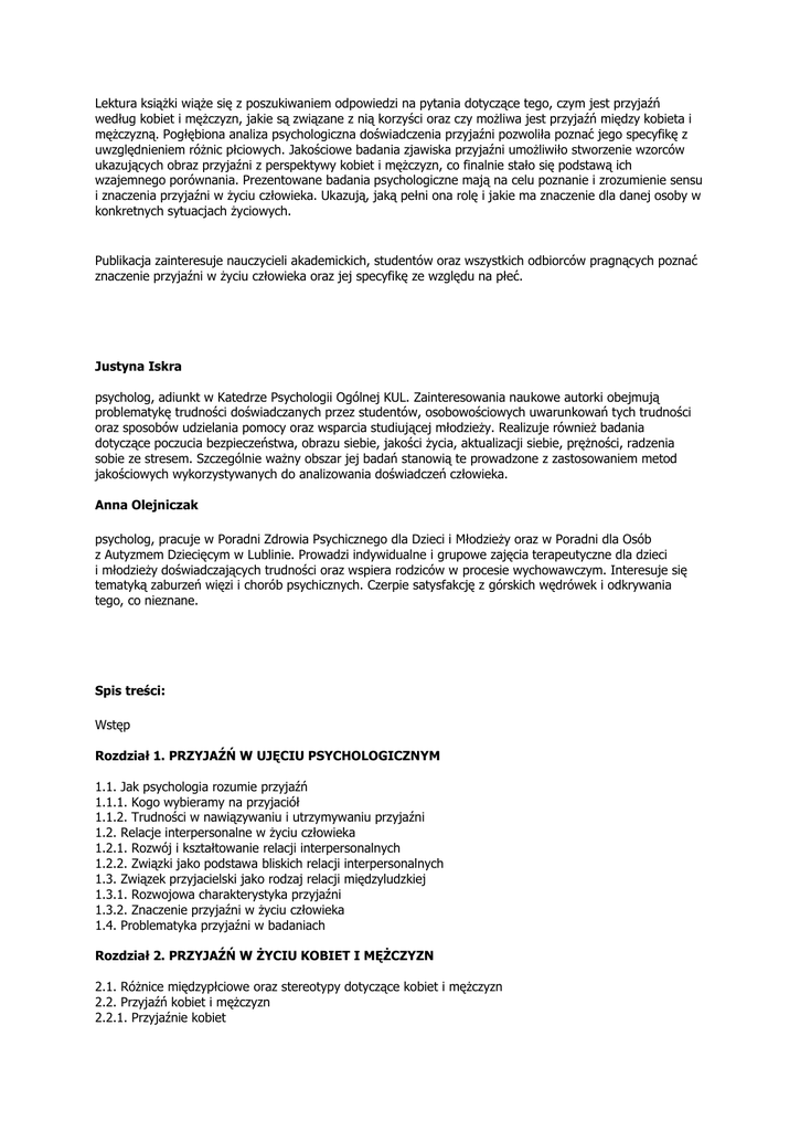 Lektura książki wiąże się z poszukiwaniem odpowiedzi na pytania dotyczące tego, czym jest przyjaźń według kobiet i mężczyzn, jakie są związane z nią korzyści oraz czy możliwa jest przyjaźń między kobieta i mężczyzną. Pogłębiona analiza psychologiczna doświadczenia przyjaźni pozwoliła poznać jego specyfikę z uwzględnieniem różnic płciowych. Jakościowe badania zjawiska przyjaźni umożliwiło stworzenie wzorców ukazujących obraz przyjaźni z perspektywy kobiet i mężczyzn, co finalnie stało się podstawą ich wzajemnego porównania. Prezentowane badania psychologiczne mają na celu poznanie i zrozumienie sensu i znaczenia przyjaźni w życiu człowieka. Ukazują, jaką pełni ona rolę i jakie ma znaczenie dla danej osoby w konkretnych sytuacjach życiowych. Publikacja zainteresuje nauczycieli akademickich, studentów oraz wszystkich odbiorców pragnących poznać znaczenie przyjaźni w życiu człowieka oraz jej specyfikę ze względu na płeć. Justyna Iskra psycholog, adiunkt w Katedrze Psychologii Ogólnej KUL. Zainteresowania naukowe autorki obejmują problematykę trudności doświadczanych przez studentów, osobowościowych uwarunkowań tych trudności oraz sposobów udzielania pomocy oraz wsparcia studiującej młodzieży. Realizuje również badania dotyczące poczucia bezpieczeństwa, obrazu siebie, jakości życia, aktualizacji siebie, prężności, radzenia sobie ze stresem. Szczególnie ważny obszar jej badań stanowią te prowadzone z zastosowaniem metod jakościowych wykorzystywanych do analizowania doświadczeń człowieka. Anna Olejniczak psycholog, pracuje w Poradni Zdrowia Psychicznego dla Dzieci i Młodzieży oraz w Poradni dla Osób z Autyzmem Dziecięcym w Lublinie. Prowadzi indywidualne i grupowe zajęcia terapeutyczne dla dzieci i młodzieży doświadczających trudności oraz wspiera rodziców w procesie wychowawczym. Interesuje się tematyką zaburzeń więzi i chorób psychicznych. Czerpie satysfakcję z górskich wędrówek i odkrywania tego, co nieznane. Spis treści: Wstęp Rozdział 1. PRZYJAŹŃ W UJĘCIU PSYCHOLOGICZNYM 1.1. Jak psychologia rozumie przyjaźń 1.1.1. Kogo wybieramy na przyjaciół 1.1.2. Trudności w nawiązywaniu i utrzymywaniu przyjaźni 1.2. Relacje interpersonalne w życiu człowieka 1.2.1. Rozwój i kształtowanie relacji interpersonalnych 1.2.2. Związki jako podstawa bliskich relacji interpersonalnych 1.3. Związek przyjacielski jako rodzaj relacji międzyludzkiej 1.3.1. Rozwojowa charakterystyka przyjaźni 1.3.2. Znaczenie przyjaźni w życiu człowieka 1.4. Problematyka przyjaźni w badaniach Rozdział 2. PRZYJAŹŃ W ŻYCIU KOBIET I MĘŻCZYZN 2.1. Różnice międzypłciowe oraz stereotypy dotyczące kobiet i mężczyzn 2.2. Przyjaźń kobiet i mężczyzn 2.2.1. Przyjaźnie kobiet 2.2.2. Przyjaźnie mężczyzn 2.2.3. Przyjaźnie damsko-męskie Rozdział 3. PROGRAM BADAŃ 3.1. Problem badawczy, czyli co i dlaczego badamy 3.2. Metody badań, czyli jakie stosujemy narzędzia 3.2.1. Ankieta o Przyjaźni Anny Olejniczak 3.2.2. Jakościowa Analiza Personalistyczna Zenona Uchnasta 3.3. Charakterystyka grupy i procedura badań, czyli kogo badamy i w jaki sposób Rozdział 4. ANALIZA I INTERPRETACJA WYNIKÓW BADAŃ 4.1. 4.2. 4.3. 4.4. 4.5. 4.6. Specyfika zjawiska przyjaźni w ocenie kobiet i mężczyzn Doświadczenia przyjaźni charakterystyczne dla kobiet Uogólniona struktura doświadczenia przyjaźni kobiet Doświadczenia przyjaźni charakterystyczne dla mężczyzn Uogólniona struktura doświadczenia przyjaźni mężczyzn Dyskusja wyników Zakończenie Aneks Bibliografia Summary