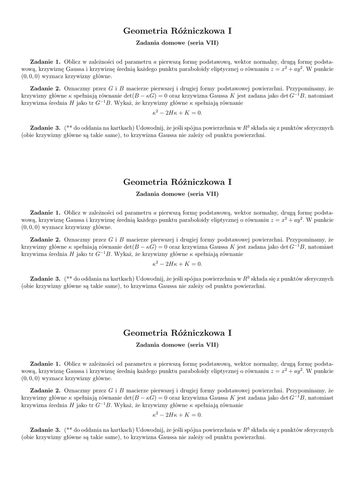 Geometria Różniczkowa I Zadania domowe (seria VII) Zadanie 1. Oblicz w zależności od parametru a pierwszą formę podstawową, wektor normalny, drugą formę podstawową, krzywiznę Gaussa i krzywiznę średnią każdego punktu paraboloidy eliptycznej o równaniu z = x2 + ay 2 . W punkcie (0, 0, 0) wyznacz krzywizny główne. Zadanie 2. Oznaczmy przez G i B macierze pierwszej i drugiej formy podstawowej powierzchni. Przypominamy, że krzywizny główne κ spełniają równanie det(B − κG) = 0 oraz krzywizna Gaussa K jest zadana jako det G−1 B, natomiast krzywizna średnia H jako tr G−1 B. Wykaż, że krzywizny główne κ spełniają równanie κ2 − 2Hκ + K = 0. Zadanie 3. (** do oddania na kartkach) Udowodnij, że jeśli spójna powierzchnia w R3 składa się z punktów sferycznych (obie krzywizny główne są takie same), to krzywizna Gaussa nie zależy od punktu powierzchni. Geometria Różniczkowa I Zadania domowe (seria VII) Zadanie 1. Oblicz w zależności od parametru a pierwszą formę podstawową, wektor normalny, drugą formę podstawową, krzywiznę Gaussa i krzywiznę średnią każdego punktu paraboloidy eliptycznej o równaniu z = x2 + ay 2 . W punkcie (0, 0, 0) wyznacz krzywizny główne. Zadanie 2. Oznaczmy przez G i B macierze pierwszej i drugiej formy podstawowej powierzchni. Przypominamy, że krzywizny główne κ spełniają równanie det(B − κG) = 0 oraz krzywizna Gaussa K jest zadana jako det G−1 B, natomiast krzywizna średnia H jako tr G−1 B. Wykaż, że krzywizny główne κ spełniają równanie κ2 − 2Hκ + K = 0. Zadanie 3. (** do oddania na kartkach) Udowodnij, że jeśli spójna powierzchnia w R3 składa się z punktów sferycznych (obie krzywizny główne są takie same), to krzywizna Gaussa nie zależy od punktu powierzchni. Geometria Różniczkowa I Zadania domowe (seria VII) Zadanie 1. Oblicz w zależności od parametru a pierwszą formę podstawową, wektor normalny, drugą formę podstawową, krzywiznę Gaussa i krzywiznę średnią każdego punktu paraboloidy eliptycznej o równaniu z = x2 + ay 2 . W punkcie (0, 0, 0) wyznacz krzywizny główne. Zadanie 2. Oznaczmy przez G i B macierze pierwszej i drugiej formy podstawowej powierzchni. Przypominamy, że krzywizny główne κ spełniają równanie det(B − κG) = 0 oraz krzywizna Gaussa K jest zadana jako det G−1 B, natomiast krzywizna średnia H jako tr G−1 B. Wykaż, że krzywizny główne κ spełniają równanie κ2 − 2Hκ + K = 0. Zadanie 3. (** do oddania na kartkach) Udowodnij, że jeśli spójna powierzchnia w R3 składa się z punktów sferycznych (obie krzywizny główne są takie same), to krzywizna Gaussa nie zależy od punktu powierzchni.