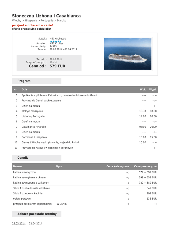 Słoneczna Lizbona i Casablanca Włochy > Hiszpania > Portugalia > Maroko przejazd autokarem w cenie! oferta promocyjna polski pilot Statek : Armator : Numer oferty : Termin : Termin : Długość pobytu : MSC Orchestra MSC Cruises 24523 29.03.2014 - 08.04.2014 29.03.2014 10 dni Cena od : 579 EUR Program Nr. Opis Wpł. Wypł. 1 Spotkanie z pilotem w Katowicach, przejazd autokarem do Genui --:-- --:-- 2 Przyjazd do Genui, zaokrętowanie --:-- --:-- 3 Dzień na morzu --:-- --:-- 4 Malaga / Hiszpania 10:30 18:30 5 Lizbona / Portugalia 14:00 00:50 6 Dzień na morzu --:-- --:-- 7 Casablanca / Maroko 08:00 20:00 8 Dzień na morzu --:-- --:-- 9 Barcelona / Hiszpania 10:00 15:00 10 Genua / Włochy wyokrętowanie, wyjazd do Polski 10:00 --:-- 11 Przyjazd do Katowic w godzinach porannych --:-- --:-- Cennik Nazwa Opis Cena katalogowa Cena promocyjna kabina wewnętrzna --; 579 ÷ 599 EUR kabina zewnętrzna z oknem --; 599 ÷ 659 EUR kabina zewnętrzna z balkonem --; 789 ÷ 889 EUR 3 lub 4 osoba dorosła w kabinie --; 349 EUR 3 lub 4 dziecko w kabinie --; 199 EUR opłaty portowe --; 135 EUR --; --; przejazd autokarem (opcjonalnie) Zobacz pozostałe terminy 29.03.2014 22.04.2014 W CENIE Informacje dodatkowe cena obejmuje: rejs statkiem MSC Orchestra ****+; zakwaterowanie w kabinie wybranej kategorii (8 noclegów); serwis bagażowy i kabinowy; wyżywienie – 3 główne posiłki, przekąski między posiłkami, bufet lub przekąski o północy; korzystanie z basenu i innych urządzeń sportowo-rekreacyjnych; udział we wszystkich imprezach organizowanych na statku, przejazd autokarem na trasie Katowice – Genua – Katowice, opiekę polskiego pilota. cena nie obejmuje: opłat portowych i podatków, ubezpieczenia KL, NW i bagażu (135€/os.); ewentualnych noclegów w hotelu przed/po rejsie i transferów (na zapytanie); wycieczek fakultatywnych; korzystania z punktów usługowych (pralnia, fotograf, salon piękności i odnowy biologicznej, internet); napojów do obiadów i kolacji, drinków oraz napiwków obowiązkowych dla obsługi statku (ok. 7€/dzień/osobę dorosłą; 3,5€/dzień/dziecko). uwagi: kabiny 3/4 osobowe nie są dostępne we wszystkich kategoriach, a ich liczba jest ograniczona – sprzedaż tylko po potwierdzeniu. Grupa realizowana przy min. 20 osobach. DOJAZD WŁASNY: w przypadku dojazdu własnego zniżka w wysokości 70€/os. ALL INCLUSIVE (opcja) istnieje możliwość wykupienia pakietu ALL INCLUSIVE obejmującego wybrane napoje alkoholowe i bezalkoholowe dostępne bez ograniczeń we wszystkich barach. Cena pakietu 23€/dzień/ osoba dorosła i 12€/dzień/dziecko. Warunkiem skorzystania z pakietu all inclusive jest wykupienie pakietu przez wszystkich pasażerów podróżujących w jednej kabinie na czas całego rejsu. WYCIECZKI FAKULTATYWNE Słoneczna Lizbona i Casablanca