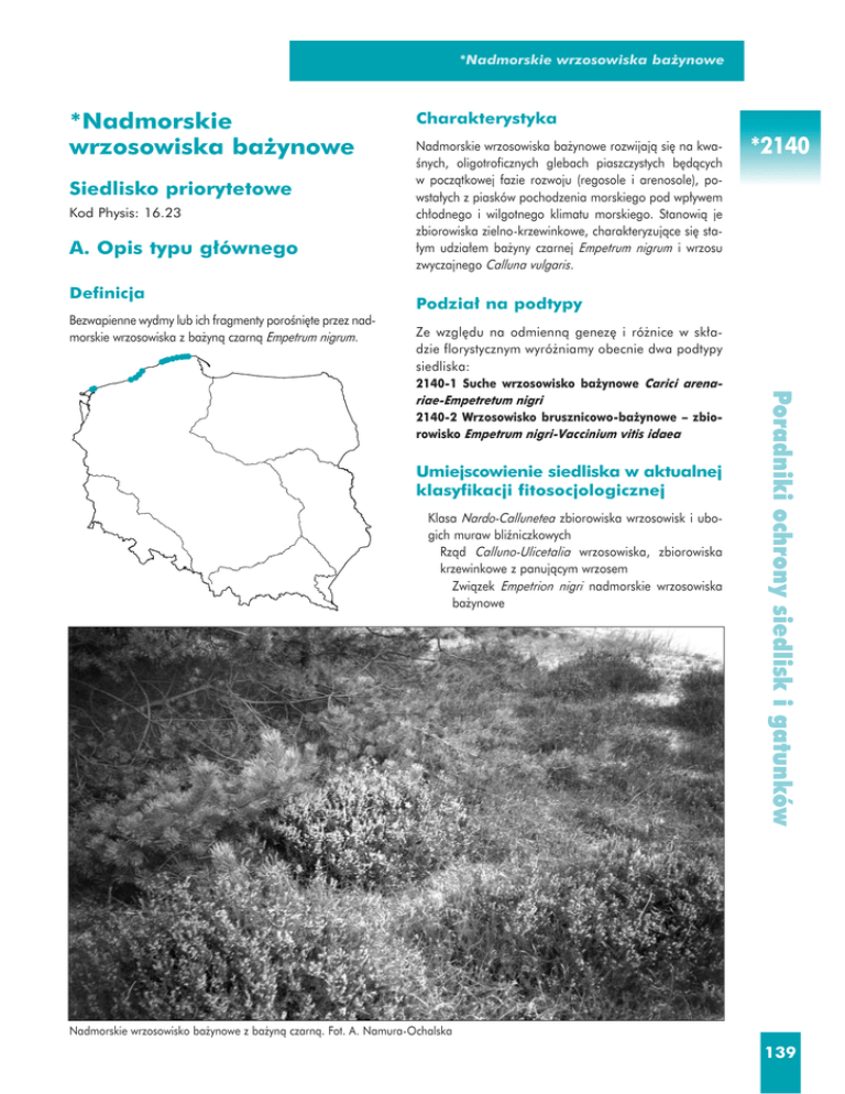 *Nadmorskie Piaszczyste wrzosowiska ∏awice podmorskie ba˝ynowe *Nadmorskie wrzosowiska ba˝ynowe Siedlisko priorytetowe Kod Physis: 16.23 A. Opis typu g∏ównego Definicja Bezwapienne wydmy lub ich fragmenty poroÊni´te przez nadmorskie wrzosowiska z ba˝ynà czarnà Empetrum nigrum. Charakterystyka Nadmorskie wrzosowiska ba˝ynowe rozwijajà si´ na kwaÊnych, oligotroficznych glebach piaszczystych b´dàcych w poczàtkowej fazie rozwoju (regosole i arenosole), powsta∏ych z piasków pochodzenia morskiego pod wp∏ywem ch∏odnego i wilgotnego klimatu morskiego. Stanowià je zbiorowiska zielno-krzewinkowe, charakteryzujàce si´ sta∏ym udzia∏em ba˝yny czarnej Empetrum nigrum i wrzosu zwyczajnego Calluna vulgaris. *2140 Podzia∏ na podtypy 2140-2 Wrzosowisko brusznicowo-ba˝ynowe – zbiorowisko Empetrum nigri-Vaccinium vitis idaea Umiejscowienie siedliska w aktualnej klasyfikacji fitosocjologicznej Klasa Nardo-Callunetea zbiorowiska wrzosowisk i ubogich muraw bliêniczkowych Rzàd Calluno-Ulicetalia wrzosowiska, zbiorowiska krzewinkowe z panujàcym wrzosem Zwiàzek Empetrion nigri nadmorskie wrzosowiska ba˝ynowe Poradniki ochrony siedlisk i gatunków Ze wzgl´du na odmiennà genez´ i ró˝nice w sk∏adzie florystycznym wyró˝niamy obecnie dwa podtypy siedliska: 2140-1 Suche wrzosowisko ba˝ynowe Carici arenariae-Empetretum nigri Nadmorskie wrzosowisko ba˝ynowe z ba˝ynà czarnà. Fot. A. Namura-Ochalska 139 Siedliska morskie i przybrze˝ne, nadmorskie i Êródlàdowe solniska i wydmy *2140 Zespó∏ Carici arenariae-Empetretum nigri suche wrzosowisko ba˝ynowe Zespó∏ Empetrum nigrum-Vaccinium vitis-idaea wrzosowisko brusznicowo-ba˝ynowe Poradniki ochrony siedlisk i gatunków Bibliografia 140 BLAB J., RIECKEN U., SSYMANK A. 1995. Proposal on a criteria system for a National Red Data Book of Biotopes. Landscape Ecology 10, 1: 41–50. BEDNORZ J., 1983. Awifauna S∏owiƒskiego Parku Narodowego z uwzgl´dnieniem stosunków iloÊciowych. Pr. Kom. Biol. PTPN, 65, PWN, Warszawa – Poznaƒ. DZI¢CIO¸OWSKI W., 1973, Gleby S∏owiƒskiego Parku Narodowego, Mscr., Poznaƒ. HELCOM. 1998. Red list of Marine and Coastal Biotopes and Biotope Complexes of the Baltic Sea, Belt and Kattegat. Balt. Sea Environ. Proc. No. 75. HERBICH J., HERBICHOWA M. (red.) 1998. Szata roÊlinna Pomorza. Zró˝nicowanie, dynamika, zagro˝enia, ochrona. Przewodnik sesji terenowych 51. Zjazdu Polskiego Towarzystwa Botanicznego 15-19 IX 1998. Wyd. Un. Gdaƒskiego, Gdaƒsk: 1–302. HERBICH J., WARZOCHA J. 1999. Czerwona lista biotopów morskich i nadmorskich w polskiej strefie Ba∏tyku. Ochr. Przyr. 56: 3–16. HUECK K., 1932. Erläuterung zur vegetationskundlichen Karte der Lebanehrung (Ostpommern). Beitr. Naturdenkmalpflege 15: 899–133. JASNOWSKA J., JASNOWSKI M. 1983. Pojezierze Zachodnio-pomorskie. Przyroda polska, Wiedza Powszechna, Warszawa. KORNA J., 1972. Zespo∏y wydm nadmorskich i Êródlàdowych. W: Szafer W., Zarzycki K. (red.) Szata roÊlinna Polski, 1: 297–309, PWN, Warszawa. LENARTOWICZ Z., MACHNIKOWSKI M., WOJTYNIAK J., 2001. Szata roÊlinna Mierzei WiÊlanej i terenów przyleg∏ych. Materia∏y do monografii przyrodniczej regionu Gdaƒskiego, t. VII: 53–104, Gdaƒsk. MARKOWSKI R., 1988. Zwiàzek Empetrion nigri Böcher 1943 em. Schubert 1960 – wrzosowiska ba˝ynowe pó∏nocnej Polski. Mscr, Uniwersytet Gdaƒski. MARKOWSKI R. 1997. Wrzosowiska ze zwiàzku Empetrion nigri Böcher 1943 em. Schubert 1960 na polskim Wybrze˝u Ba∏tyku. W: Fa∏tynowicz W., Lata∏owa M., Szmeja J. (red.) Dynamika i ochrona roÊlinnoÊci Pomorza. Bogucki Wyd. Nauk., Poznaƒ: 55–64. MATUSZKIEWICZ W. 2001. Przewodnik do oznaczania zbiorowisk roÊlinnych Polski. PWN, Warszawa. OSTROWSKI M., SYMONIDES E., 1994. S∏owiƒski Park Narodowy. SCI&ART., Warszawa. PIOTROWSKA H., 1988. The dynamics of the dune vegetation on the Polish Baltic coast. Vegetatio, 77: 169–175. PIOTROWSKA H., 1997. Przyroda S∏owiƒskiego Parku Narodowego. Bogucki Wyd. Nauk., Poznaƒ – Gdaƒsk. PRZEWOèNIK M. (red.) 1995. Ochrona przyrody w regionie gdaƒskim. Bogucki Wyd. Nauk., Poznaƒ. WANGERIN W., 1921. Beobachtungen über die Entwicklung der Vegetation in Dünentäler. Ber. Deutsch. Bot. Ges. 39: 365–377. WOJTERSKI T., PIASZYK M., ZIELI¡SKA M., 1979. Mapa zbiorowisk roÊlinnych S∏owiƒskiego Parku Narodowego. Bad. Fizjogr. Pol. Zach., B (Bot.) 31, Supplement. WOJTERSKI T., BEDNORZ J. 1982. Pobrze˝e S∏owiƒskie i Kaszubskie. Przyroda polska, Wiedza Powszechna, Warszawa. ˚Ó¸KO K., 1993. Ba˝yna czarna (Empetrum nigrum L.) w S∏owiƒskim Parku Narodowym. Praca dyplomowa, Uniwersytet Gdaƒski. Anna Namura-Ochalska *Nadmorskie Piaszczyste wrzosowiska ∏awice podmorskie ba˝ynowe B. Opis podtypów *Suche wrzosowisko ba˝ynowe Carici arenariae-Empetretum nigri Siedlisko priorytetowe Kod Physis: 16.23 Cechy diagnostyczne Fizjonomia i struktura zbiorowiska Niskie zbiorowisko zielno-krzewinkowe, z∏o˝one z roÊlin wrzosowiskowych oraz nadmorskich psammofitów charakterystycznych dla wydmy bia∏ej i wydmy szarej. Struktura roÊlinnoÊci zazwyczaj doÊç luêna, pokrywanie osiàga 60–70%, tylko wyjàtkowo jest wy˝sze. Liczba gatunków niewielka, dominuje w ró˝nych proporcjach ba˝yna czarna Empetrum nigrum, wrzos zwyczajny Calluna vulgaris i turzyca piaskowa Carex arenaria. W m∏odszych fitocenozach znaczàcy jest tak˝e udzia∏ niskich, p∏o˝àcych si´ krzewów wierzby p∏o˝àcej w podgatunku piaskowym Salix repens subsp. arenaria. Pojedynczo rosnà m∏odociane okazy sosny lub brzozy. Wg Markowskiego (1997) w p∏acie wyst´pujà Êrednio 23 gatunki, z czego kilkanaÊcie gatunków mchów i porostów. Cz´sto jednak roÊlinnoÊç jest cz´Êciowo przysypana i wówczas warstwa mszysto-porostowa rozwini´ta jest s∏abo lub brakuje jej w ogóle. Reprezentatywne gatunki Wrzos zwyczajny Calluna vulgaris, ba˝yna czarna Empetrum nigrum, wierzba p∏o˝àca w pod- *2140 1 Odmiany siedliska Zale˝nie od 