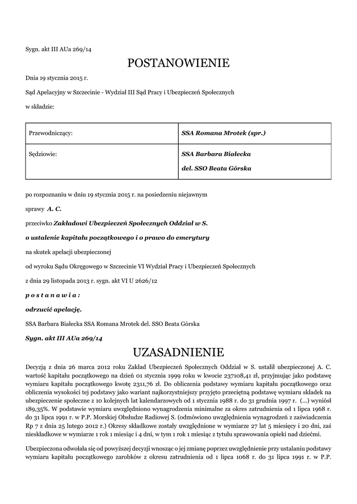 Sygn. akt III AUa 269/14 POSTANOWIENIE Dnia 19 stycznia 2015 r. Sąd Apelacyjny w Szczecinie - Wydział III Sąd Pracy i Ubezpieczeń Społecznych w składzie: Przewodniczący: SSA Romana Mrotek (spr.) Sędziowie: SSA Barbara Białecka del. SSO Beata Górska po rozpoznaniu w dniu 19 stycznia 2015 r. na posiedzeniu niejawnym sprawy A. C. przeciwko Zakładowi Ubezpieczeń Społecznych Oddział w S. o ustalenie kapitału początkowego i o prawo do emerytury na skutek apelacji ubezpieczonej od wyroku Sądu Okręgowego w Szczecinie VI Wydział Pracy i Ubezpieczeń Społecznych z dnia 29 listopada 2013 r. sygn. akt VI U 2626/12 postanawia: odrzucić apelację. SSA Barbara Białecka SSA Romana Mrotek del. SSO Beata Górska Sygn. akt III AUa 269/14 UZASADNIENIE Decyzją z dnia 26 marca 2012 roku Zakład Ubezpieczeń Społecznych Oddział w S. ustalił ubezpieczonej A. C. wartość kapitału początkowego na dzień 01 stycznia 1999 roku w kwocie 237108,41 zł, przyjmując jako podstawę wymiaru kapitału początkowego kwotę 2311,76 zł. Do obliczenia podstawy wymiaru kapitału początkowego oraz obliczenia wysokości tej podstawy jako wariant najkorzystniejszy przyjęto przeciętną podstawę wymiaru składek na ubezpieczenie społeczne z 10 kolejnych lat kalendarzowych od 1 stycznia 1988 r. do 31 grudnia 1997 r. (...) wyniósł 189,35%. W podstawie wymiaru uwzględniono wynagrodzenia minimalne za okres zatrudnienia od 1 lipca 1968 r. do 31 lipca 1991 r. w P.P. Morskiej Obsłudze Radiowej S. (odmówiono uwzględnienia wynagrodzeń z zaświadczenia Rp 7 z dnia 25 lutego 2012 r.) Okresy składkowe zostały uwzględnione w wymiarze 27 lat 5 miesięcy i 20 dni, zaś nieskładkowe w wymiarze 1 rok 1 miesiąc i 4 dni, w tym 1 rok 1 miesiąc z tytułu sprawowania opieki nad dziećmi. Ubezpieczona odwołała się od powyższej decyzji wnosząc o jej zmianę poprzez uwzględnienie przy ustalaniu podstawy wymiaru kapitału początkowego zarobków z okresu zatrudnienia od 1 lipca 1068 r. do 31 lipca 1991 r. w P.P. Morskiej Obsłudze Radiowej S., zarobków z okresu zatrudnienia od 1 sierpnia 1997 r. do 31 lipca 1998 r. w P (...) SA oraz zarobków z okresu zatrudnienia od 1 listopada 1997 r. do 31 grudnia 1998 r. w firmie (...) sp. z o.o. w wysokości wynikającej z przedłożonych zaświadczeń Rp7 podpisanych przez organ reprezentujący spółki. Dodatkowo wniosła o uwzględnienia w jej stażu ubezpieczeniowym jako okresu składkowego okresu bezpłatnego urlopu dla matek pracujących opiekujących się małymi dziećmi wykorzystanego przed dniem 1 stycznia 1999 r. oraz okresów zatrudnienia od 1 sierpnia 1997 r. do 31 lipca 1998 r. w P (...) SA oraz od 1 listopada 1997 r. do 31 grudnia 1998 r. w firmie (...) sp. z o.o. Decyzją z dnia 2 maja 2012 roku Zakład Ubezpieczeń Społecznych Oddział w S. ponownie ustalił A. C. wartość kapitału początkowego, na dzień 01 stycznia 1999 roku w kwocie 253813,78 zł, przyjmując jako podstawę wymiaru kapitału początkowego kwotę 2409,55 zł. Do obliczenia podstawy wymiaru kapitału początkowego oraz obliczenia wysokości tej podstawy jako wariant najkorzystniejszy przyjęto przeciętną podstawę wymiaru składek na ubezpieczenie społeczne z 10 kolejnych lat kalendarzowych od 1 stycznia 1989 r. do 31 grudnia 1998r. (...) wyniósł 197,36%. W podstawie wymiaru uwzględniono wynagrodzenia minimalne za okres zatrudnienia od 1 lipca 1968 r. do 31 lipca 1991 r. w P.P. Morskiej Obsłudze Radiowej S. (odmówiono uwzględnienia wynagrodzeń z zaświadczenia Rp 7 z dnia 25 lutego 2012 r.) Okresy składkowe zostały uwzględnione w wymiarze 28 lat 10 miesięcy i 20 dni, zaś nieskładkowe w wymiarze 1 rok 1 miesiąc i 4 dni, w tym 1 rok 1 miesiąc z tytułu sprawowania opieki nad dziećmi. Ubezpieczona odwołała się od powyższej decyzji wnosząc o jej zmianę poprzez uwzględnienie przy ustalaniu podstawy wymiaru kapitału początkowego zarobków z tytułu zatrudnienia w P.P. Morskiej Obsłudze Radiowej S. w wysokości wynikającej z przedłożonego zaświadczenia Rp7 z dnia 25 lutego 2012 r. podpisanego przez organ reprezentujący spółkę. Dodatkowo wniosła o uwzględnienia w jej stażu ubezpieczeniowym jako okresu składkowego okresu bezpłatnego urlopu dla matek pracujących opiekujących się małymi dziećmi wykorzystanego przed dniem 1 stycznia 1999 r. W odpowiedzi na odwołania organ rentowy wniósł o ich oddalenie w całości. Dodatkowo wyjaśnił, że okres bezpłatnego urlopu z tytułu sprawowania opieki nad dziećmi jest okresem nieskładkowym i jako taki został uwzględniony przy obliczaniu wysokości kapitału początkowego (1 rok i 1 miesiąc sprawowania opieki nad dzieckiem córką J. – okres od 7.09.1971 r. do 6.09.1972 r. i od 1.07.1973 r. do 31.07.1973 r.). W podstawie wymiaru nie uwzględniono wynagrodzenia za okres zatrudnienia od 1 lipca 1968 r. do 31 lipca 1991 r. w P.P. Morskiej Obsłudze Radiowej S. w wysokości wskazanej w zaświadczeniu Rp 7 z dnia 25 lutego 2012 r. z uwagi na toczące się postępowanie wyjaśniające. Decyzją z dnia 31 lipca 2012 r. Zakład Ubezpieczeń Społecznych Oddział w S. po rozpatrzeniu wniosku z dnia 2 marca 2012 r. przyznał A. C. emeryturę od dnia 1 marca 2012 r. (od miesiąca złożenia wniosku) w kwocie 3714,32 zł brutto. Wysokość emerytury określono zgodnie z art. 183 ust. 1 ustawy emerytalnej (80% emerytury obliczonej na podstawie art. 53 oraz 20% emerytury obliczonej na podstawie art. 26. Obliczając wysokość emerytury zgodnie z art. 53 organ rentowy do ustalenia podstawy jej wymiaru przyjął przeciętną podstawę wymiaru składek na ubezpieczenie społeczne z 10 kolejnych lat kalendarzowych od 1992 do 2001 r. (...) wyniósł 198,66 %. Podstawa wymiaru obliczona przez pomnożenie wwpw przez kwotę bazową 2974,69 zł wyniosła 5909,52 zł. Okresy składkowe zostały uwzględnione w wymiarze 39 lat 10 miesięcy i 9 dni, zaś nieskładkowe w wymiarze 1 rok 2 miesiące i 18 dni. Zakład n