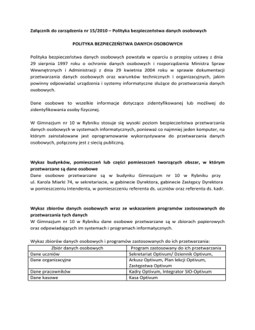 Załącznik do zarządzenia nr 15/2010 – Polityka bezpieczeństwa danych osobowych POLITYKA BEZPIECZEŃSTWA DANYCH OSOBOWYCH Polityka bezpieczeństwa danych osobowych powstała w oparciu o przepisy ustawy z dnia 29 sierpnia 1997 roku o ochronie danych osobowych i rozporządzenia Ministra Spraw Wewnętrznych i Administracji z dnia 29 kwietnia 2004 roku w sprawie dokumentacji przetwarzania danych osobowych oraz warunków technicznych i organizacyjnych, jakim powinny odpowiadać urządzenia i systemy informatyczne służące do przetwarzania danych osobowych. Dane osobowe to wszelkie informacje dotyczące zidentyfikowanej lub możliwej do zidentyfikowania osoby fizycznej. W Gimnazjum nr 10 w Rybniku stosuje się wysoki poziom bezpieczeństwa przetwarzania danych osobowych w systemach informatycznych, ponieważ co najmniej jeden komputer, na którym zainstalowane jest oprogramowanie wykorzystywane do przetwarzania danych osobowych, połączony jest z siecią publiczną. Wykaz budynków, pomieszczeń lub części pomieszczeń tworzących obszar, w którym przetwarzane są dane osobowe Dane osobowe przetwarzane są w budynku Gimnazjum nr 10 w Rybniku przy ul. Karola Miarki 74, w sekretariacie, w gabinecie Dyrektora, gabinecie Zastępcy Dyrektora w pomieszczeniu intendenta, w pomieszczeniu referenta ds. uczniów oraz referenta ds. kadr. Wykaz zbiorów danych osobowych wraz ze wskazaniem programów zastosowanych do przetwarzania tych danych W Gimnazjum nr 10 w Rybniku dane osobowe przetwarzane są w zbiorach papierowych oraz odpowiadających im systemach i programach informatycznych. Wykaz zbiorów danych osobowych i programów zastosowanych do ich przetwarzania: Zbiór danych osobowych Program zastosowany do ich przetwarzania Dane uczniów Sekretariat Optivum/ Dziennik Optivum, Dane organizacyjne Arkusz Optivum, Plan lekcji Optivum, Zastępstwa Optivum Dane pracowników Kadry Optivum, Integrator SIO-Optivum Dane kasowe Kasa Optivum Opis struktury zbiorów danych osobowych wskazujących zawartość poszczególnych pól informacyjnych i powiązania między nimi Zbiór danych „dane uczniów” zawiera następujące pola: − nazwisko i imiona, − numer PESEL, − adres zamieszkania, − data i miejsce urodzenia, − imiona i nazwisko rodziców (prawnych opiekunów). Zbiór danych „dane organizacyjne” zawiera następujące pola: − nazwisko i imiona, − numer PESEL, − płeć, − data urodzenia, − staż pracy, − pełniona funkcja, − stopień awansu zawodowego, − wynagrodzenie. Zbiór danych „dane pracowników” zawiera następujące pola: − nazwisko i imiona, − numer PESEL, − wykształcenie, − staż pracy, − ilość godzin, − wynagrodzenie. Zbiór danych „dane kasowe” zawiera następujące pola: − nazwisko i imiona lub nazwa firmy, − adres zamieszkania lub siedziby firmy, − numer NIP, − numer REGON lub PESEL, − dokument tożsamości, jego serię i numer. Sposób przepływu danych pomiędzy poszczególnymi systemami Program Sekretariat Optivum przejmuje plany nauczania oddziałów z Arkusza Optivum. Program Plan lekcji oraz Zastępstwa przejmuje plany nauczania z Arkusza Optimum. Sekretariat Optivum oraz Arkusz Optivum eksportuje dane do Integratora SIO-Optivum oraz Dziennika Optimum (od 15.01.2010 do odwołania) Dane z programu Kasa Optivum nie są importowane ani eksportowane do innych programów. Określenie środków technicznych i organizacyjnych niezbędnych do zapewnienia poufności, integralności i rozliczalności przetwarzanych danych Poufność: − upoważnienie do przetwarzania danych osobowych, − rejestr osób upoważnionych do przetwarzania danych osobowych, − identyfikator użytkownika i hasło dostępu, − użytkownik ma obowiązek zablokowania stacji roboczej lub wylogowania się z systemu informatycznego służącego do przetwarzania danych osobowych w przypadku czasowego opuszczenia stanowiska pracy, − zakończenie pracy w systemie służącym do przetwarzania danych osobowych poprzedzone jest zabezpieczeniem przed nieuprawnionym dostępem dodatkowych nośników danych, takich jak dyskietki, płyty CD i inne, zawierających dane osobowe, − nośniki informatyczne zawierające dane osobowe lub kopie systemów informatycznych służących do przetwarzania danych osobowych są przechowywane w sposób uniemożliwiający ich utratę, uszkodzenie lub dostęp osób nieuprawnionych, − przed likwidacją nośników informatycznych zawierających dane osobowe lub kopie zapasowe systemów informatycznych służących do przetwarzania danych osobowych dane osobowe zostają usunięte lub uszkodzone w sposób uniemożliwiający ich odczyt, − po upływie okresu użyteczności lub przechowywania, dane osobowe zostają skasowane lub zniszczone tak, aby nie było możliwe ich odczytanie, − zakaz wynoszenia poza pomieszczenia stanowiące obszar przetwarzania danych osobowych elektronicznych nośników informacji zawierających dane osobowe oraz kopie zapasowe, − elektroniczne nośniki informacji zawierających dane osobowe oraz kopie zapasowe, a także wydruki i inne dokumenty zawierające dane osobowe przechowywane są w zamykanych szafach w pomieszczeniach stanowiących obszar przetwarzania danych osobowych, w sposób zabezpieczający je przed nieuprawnionym przejęciem, modyfikacją, uszkodzeniem i zniszczeniem, − uszkodzony lub zużyty nośnik informacji zwierający dane osobowe zostaje fizycznie zniszczony tak, aby nie było możliwe odczytanie danych osobowych, − dane osobowe przesyłane poprzez sieć Internet zabezpieczone są poprzez środki kryptograficznej ochrony, − przeglądy i konserwacje sprzętu komputerowego oraz nośników informacji służących do przetwarzania danych osobowych, przeprowadzane są w pomieszczeniach stanowiących obszar przetwarzania danych osobowych, − w przypadku przekazywania do naprawy sprzętu komputerowego z zainstalowanym systemem informatycznym służącym do przetwarzania danych osob