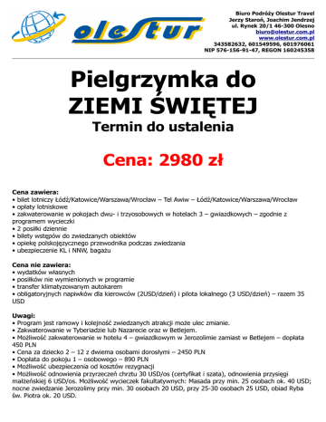 Biuro Podróży Olestur Travel Jerzy Staroń, Joachim Jendrzej ul. Rynek 20/1 46-300 Olesno [email protected] www.olestur.com.pl 343582632, 601549596, 601976061 NIP 576-156-91-47, REGON 160245358 Pielgrzymka do ZIEMI ŚWIĘTEJ Termin do ustalenia Cena: 2980 zł Cena zawiera: • bilet lotniczy Łódź/Katowice/Warszawa/Wrocław – Tel Awiw – Łódź/Katowice/Warszawa/Wrocław • opłaty lotniskowe • zakwaterowanie w pokojach dwu- i trzyosobowych w hotelach 3 – gwiazdkowych – zgodnie z programem wycieczki • 2 posiłki dziennie • bilety wstępów do zwiedzanych obiektów • opiekę polskojęzycznego przewodnika podczas zwiedzania • ubezpieczenie KL i NNW, bagażu Cena nie zawiera: • wydatków własnych • posiłków nie wymienionych w programie • transfer klimatyzowanym autokarem • obligatoryjnych napiwków dla kierowców (2USD/dzień) i pilota lokalnego (3 USD/dzień) – razem 35 USD Uwagi: • Program jest ramowy i kolejność zwiedzanych atrakcji może ulec zmianie. • Zakwaterowanie w Tyberiadzie lub Nazarecie oraz w Betlejem. • Możliwość zakwaterowanie w hotelu 4 – gwiazdkowym w Jerozolimie zamiast w Betlejem – dopłata 450 PLN • Cena za dziecko 2 – 12 z dwiema osobami dorosłymi – 2450 PLN • Dopłata do pokoju 1 – osobowego – 890 PLN • Możliwość ubezpieczenia od kosztów rezygnacji • Możliwość odnowienia przyrzeczeń chrztu 30 USD/os (certyfikat i szata), odnowienia przysięgi małżeńskiej 6 USD/os. Możliwość wycieczek fakultatywnych: Masada przy min. 25 osobach ok. 40 USD; nocne zwiedzanie Jerozolimy przy min. 30 osobach 20 USD, przy 25-30 osobach 25 USD, obiad Ryba św. Piotra ok. 20 USD.