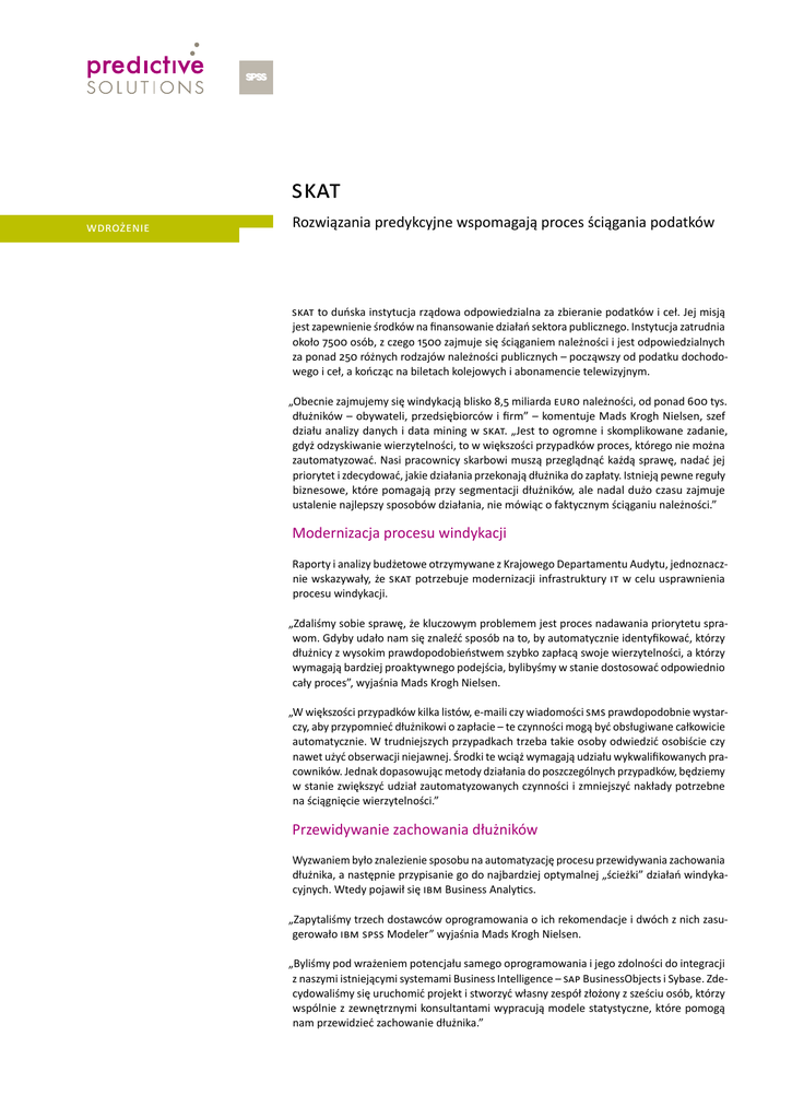 SKAT wdrożenie Rozwiązania predykcyjne wspomagają proces ściągania podatków SKAT to duńska instytucja rządowa odpowiedzialna za zbieranie podatków i ceł. Jej misją jest zapewnienie środków na finansowanie działań sektora publicznego. Instytucja zatrudnia około 7500 osób, z czego 1500 zajmuje się ściąganiem należności i jest odpowiedzialnych za ponad 250 różnych rodzajów należności publicznych – począwszy od podatku dochodowego i ceł, a kończąc na biletach kolejowych i abonamencie telewizyjnym. „Obecnie zajmujemy się windykacją blisko 8,5 miliarda EURO należności, od ponad 600 tys. dłużników – obywateli, przedsiębiorców i firm” – komentuje Mads Krogh Nielsen, szef działu analizy danych i data mining w SKAT. „Jest to ogromne i skomplikowane zadanie, gdyż odzyskiwanie wierzytelności, to w większości przypadków proces, którego nie można zautomatyzować. Nasi pracownicy skarbowi muszą przeglądnąć każdą sprawę, nadać jej priorytet i zdecydować, jakie działania przekonają dłużnika do zapłaty. Istnieją pewne reguły biznesowe, które pomagają przy segmentacji dłużników, ale nadal dużo czasu zajmuje ustalenie najlepszy sposobów działania, nie mówiąc o faktycznym ściąganiu należności.” Modernizacja procesu windykacji Raporty i analizy budżetowe otrzymywane z Krajowego Departamentu Audytu, jednoznacznie wskazywały, że SKAT potrzebuje modernizacji infrastruktury IT w celu usprawnienia procesu windykacji. „Zdaliśmy sobie sprawę, że kluczowym problemem jest proces nadawania priorytetu sprawom. Gdyby udało nam się znaleźć sposób na to, by automatycznie identyfikować, którzy dłużnicy z wysokim prawdopodobieństwem szybko zapłacą swoje wierzytelności, a którzy wymagają bardziej proaktywnego podejścia, bylibyśmy w stanie dostosować odpowiednio cały proces”, wyjaśnia Mads Krogh Nielsen. „W większości przypadków kilka listów, e-maili czy wiadomości SMS prawdopodobnie wystarczy, aby przypomnieć dłużnikowi o zapłacie – te czynności mogą być obsługiwane całkowicie automatycznie. W trudniejszych przypadkach trzeba takie osoby odwiedzić osobiście czy nawet użyć obserwacji niejawnej. Środki te wciąż wymagają udziału wykwalifikowanych pracowników. Jednak dopasowując metody działania do poszczególnych przypadków, będziemy w stanie zwiększyć udział zautomatyzowanych czynności i zmniejszyć nakłady potrzebne na ściągnięcie wierzytelności.” Przewidywanie zachowania dłużników Wyzwaniem było znalezienie sposobu na automatyzację procesu przewidywania zachowania dłużnika, a następnie przypisanie go do najbardziej optymalnej „ścieżki” działań windykacyjnych. Wtedy pojawił się IBM Business Analytics. „Zapytaliśmy trzech dostawców oprogramowania o ich rekomendacje i dwóch z nich zasugerowało IBM SPSS Modeler” wyjaśnia Mads Krogh Nielsen. „Byliśmy pod wrażeniem potencjału samego oprogramowania i jego zdolności do integracji z naszymi istniejącymi systemami Business Intelligence – SAP BusinessObjects i Sybase. Zdecydowaliśmy się uruchomić projekt i stworzyć własny zespół złożony z sześciu osób, którzy wspólnie z zewnętrznymi konsultantami wypracują modele statystyczne, które pomogą nam przewidzieć zachowanie dłużnika.” 2 SKAT Rozwiązania predykcyjne wspomagają proces ściągania podatków Budowa modelu predykcyjnego Zespół projektowy stworzył trzy sub-modele: jeden dla osób fizycznych, jeden dla przedsiębiorców indywidualnych i jeden dla przedsiębiorstw. Pierwszym etapem było zebranie wszystkich informacji, które mogą być istotne dla przewidywania zachowania dłużnika. W przypadku modelu dla osób fizycznych było to 2700 zmiennych informacje począwszy od wielkości rodziny do marki i modelu samochodu jaki posiada. Następnie, zespół próbował dowiedzieć się, które z tych zmiennych były najbardziej istotne. W kolejnym kroku użyto analizy jednoczynnikowej, by zmniejszyć liczbę zmiennych z 2700 do 400, a następnie zastosowano specjalne techniki dostępne w oprogramowaniu SPSS, aby uzyskać dalszą redukcję z 400 do 150 zmiennych. W końcowym etapie grupa analityków biznesowych i ekspertów statystycznych wybrała około 70 zmiennych, a zespół projektowy wykorzystał analizy wielowymiarowe do wyboru ostatecznych 15 zmiennych, które zostały użyte w pierwszej wersji modelu. Zdobywanie nowych informacji „Po raz pierwszy mogliśmy podejmować decyzję bazując na wiedzy, które zmienne mogą wpływać na wybór „ścieżki” windykacji” – mówi Mads Krogh Nielsen. „Wiele z tego, co udało nam się ustalić potwierdziło to, co już podejrzewaliśmy – na przykład, że ludzie, którzy posiadają duży majątek lub mają kredyty hipoteczne na duże kwoty, są zwykle dobrymi płatnikami, zaś osoby, którzy mają małe długi są gorszymi płatnikami. Niektóre z naszych ustaleń były jednak dość zaskakujące – na przykład okazało się, że posiadanie większej liczby samochodów znacznie zmniejsza ryzyko zostania złym dłużnikiem. Dzieje się tak prawdopodobnie dlatego, że dealerzy prowadzą własną kontrolę zdolności kredytowej klientów. Dlatego jeśli ktoś jest w stanie kupić kilka samochodów, to prawdopodobnie ma dobrą historię kredytową. Inna interesująca informacja, jaką uzyskaliśmy, pomogła nam zrozumieć zachowanie mniej zamożnych dłużników. Jeśli jesteś bogaty, to często oznacza, że masz ugruntowaną historię kredytową pochodzącą z kredytów hipotecznych, oszczędności i innych wierzytelności, które śledzi nasz system – to daje dużo danych, które możemy wykorzystać do przewidywania zachowania. Jeśli natomiast wynajmujesz mieszkanie i nie masz samochodu czy konta bankowego lub karty kredytowej, ilość danych, które możemy uzyskać jest znacznie mniejsza, a Twoje zachowanie jest dla nas trudniejsze do przewidzenia. Dzi