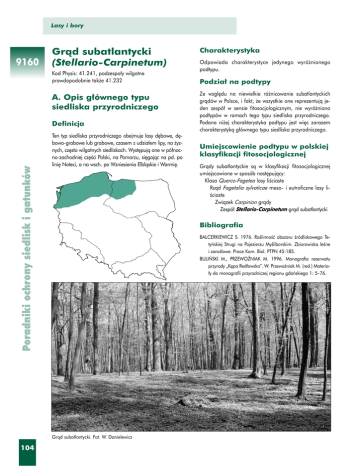 Lasy i bory 9160 Gràd subatlantycki (Stellario-Carpinetum) Kod Physis: 41.241, podzespo∏y wilgotne prawdopodobnie tak˝e 41.232 A. Opis g∏ównego typu siedliska przyrodniczego Poradniki ochrony siedlisk i gatunków Definicja Ten typ siedliska przyrodniczego obejmuje lasy d´bowe, d´bowo-grabowe lub grabowe, czasem z udzia∏em lipy, na ˝yznych, cz´sto wilgotnych siedliskach. Wyst´pujà one w pó∏nocno-zachodniej cz´Êci Polski, na Pomorzu, si´gajàc na pd. po lini´ Noteci, a na wsch. po Wzniesienia Elblàskie i Warmi´. Odpowiada charakterystyce jedynego wyró˝nionego podtypu. Podzia∏ na podtypy Ze wzgl´du na niewielkie ró˝nicowanie subatlantyckich gràdów w Polsce, i fakt, ˝e wszystkie one reprezentujà jeden zespó∏ w sensie fitosocjologicznym, nie wyró˝niono podtypów w ramach tego typu siedliska przyrodniczego. Podana ni˝ej charakterystyka podtypu jest wi´c zarazem charakterystykà g∏ównego typu siedliska przyrodniczego. Umiejscowienie podtypu w polskiej klasyfikacji fitosocjologicznej Gràdy subatlantyckie sà w klasyfikacji fitosocjologicznej umiejscowione w sposób nast´pujàcy: Klasa Querco-Fagetea lasy liÊciaste Rzàd Fagetalia sylvaticae mezo- i eutroficzne lasy liÊciaste Zwiàzek Carpinion gràdy Zespó∏ Stellario-Carpinetum gràd subatlantycki Bibliografia BALCERKIEWICZ S. 1976. RoÊlinnoÊç obszaru êródliskowego Tetyƒskiej Strugi na Pojezierzu MyÊliborskim. Zbiorowiska leÊne i zaroÊlowe. Prace Kom. Biol. PTPN 45:185. BULI¡SKI M., PRZEWOèNIAK M. 1996. Monografia rezerwatu przyrody „K´pa Red∏owska”. W: Przewoêniak M. (red.) Materia∏y do monografii przyrodniczej regionu gdaƒskiego 1: 5–76. Gràd subatlantycki. Fot. W. Danielewicz 104 Charakterystyka Gràd subatlantycki MATUSZKIEWICZ J. M. 1996. Opracowanie sk∏adów gatunkowych drzewostanów w poszczególnych fazach rozwojowych w zale˝noÊci od: typu siedliskowego lasu, zespo∏u roÊlinnego i regionu. Mscr. Departament Ochrony Przyrody Ministerstwa Ârodowiska. MATUSZKIEWICZ J. M. 2001. Zespo∏y leÊne Polski. Warszawa. Wyd. Nauk. PWN, Warszawa. MATUSZKIEWICZ J., 1976. Przeglàd fitosocjologiczny zbiorowisk leÊnych Polski. Cz. 3. Lasy i zaroÊla ∏´gowe. – Phytocoenosis, 5(1): 3–66. MATUSZKIEWICZ W. 2001. Przewodnik do oznaczania zbiorowisk roÊlinnych Polski. Wyd. Nauk. PWN, Warszawa. RALSKA-JASIEWICZ M. 1964. Correlation between the Holocene history of the Carpinus betulus and prehistoric settlement in North Poland. Acta Soc.Bot.Pol., 33.2:461–468. SIEDLISKOWE PODSTAWY HODOWLI LASU 2004. Za∏àcznik nr I do Zasad Hodowli i U˝ytkowania Lasu Wielofunkcyjnego. Dyrekcja Generalna Lasów Paƒstwowych, Warszawa. TOKARZ H. 1961. Zespo∏y leÊne Wysoczyzny Elblàskiej. Acta Biol. et Med. Soc. Sci. Gedan. 5,7: 121–244. TOKARZ H. 1971. Zbiorowiska leÊne z udzia∏em buka (Fagus sylvatica) w obszarze pó∏nocno-wschodniej granicy jego zasi´gu. Cz. I: Melico-Fagetum. Acta Biol. et Med. Soc. Sci. Gedan. 15: 227–274. W∏adys∏aw Danielewicz, Pawe∏ Pawlaczyk 9160 Poradniki ochrony siedlisk i gatunków JACKOWIAK B., BRZEG A., KASPROWICZ M. 2003. Operat ochrony zbiorowisk leÊnych i zaroÊlowych S∏owiƒskiego Parku Narodowego. Operat fitosocjologiczny. Mscr. SZADKOWSKA-IZYDOREK M., IZYDOREK I., SOBISZ Z. 2001. Szata roÊlinna. W: Gerstmannowa E. (red.) Park krajobrazowy „Dolina S∏upi” (przyroda – kultura – krajobraz). Materia∏y do monografii przyrodniczej regionu gdaƒskiego 5: 59–79. HERBICH J. 1982. Zró˝nicowanie i antropogeniczne przemiany roÊlinnoÊci Wysoczyzny Staniszewskiej na Pojezierzu Kaszubskim. Monogr. Bot. 63. HERBICH J. 1994. Przestrzenno-dynamiczne zró˝nicowanie roÊlinnoÊci dolin w krajobrazie m∏odoglacjalnym na przyk∏adzie Pojezierza Kaszubskiego. Monogr. Bot. 76. HERBICH J., HERBICHOWA M. 1982. Naturalne zbiorowiska leÊne rezerwatu Jar rzeki Raduni. W: Piotrowska H. (red.) Szata roÊlinna rezerwatu Jar rzeki Raduni na Pojezierzu Kaszubskim. Ochr. Przyr. 44: 52–63. HERBICH J., HERBICHOWA M. 2001. Zbiorowiska roÊlinne – specyfika, zagro˝enia, ochrona. W: Przewoêniak M. (red.) Trójmiejski Park Krajobrazowy. Przyroda – Kultura – Krajobraz. Materia∏y do monografii przyrodniczej regionu gdaƒskiego 6: 81–108. HERBICH J., MARKOWSKI R. 1997. Plan ochrony rezerwatu przyrody „Kacze ¸´gi”. Mscr. MARKOWSKI R., GRUS W., GROMADZKI A. 1996. Zasady post´powania hodowlanego i ochronnego w LeÊnym Kompleksie Promocyjnym „Lasy Oliwsko-Dar˝lubskie”. Mscr, RDLP Gdaƒsk. 105 Lasy i bory 9160 1 Cechy diagnostyczne natne, natomiast w miejscach najni˝ej po∏o˝onych – czarne ziemie, gleby gruntowoglejowe, mady brunatne i gleby deluwialne próchniczne. W klasyfikacji siedlisk leÊnych gràd subatlantycki wyst´puje na siedliskach LMÊw, LMw, LÊw, Lw. Nowe (2004 r.) „Siedliskowe Podstawy Hodowli Lasu” wyró˝niajà dla tego ekosystemu typy lasu: bukowo-grabowo-d´bowy las mieszany Êwie˝y, bukowo-grabowo-d´bowy las mieszany wilgotny, bukowo-grabowo d´bowy las Êwie˝y i bukowo-grabowo-d´bowy las wilgotny. Cechy obszaru Gràd subatlantycki reprezentuje grup´ mezo- i eutroficznych, wielogatunkowych lasów d´bowo-lipowo-grabowych na obszarach pó∏nocnej cz´Êci Europy Ârodkowej znajdujàcych si´ pod wp∏ywem klimatu morskiego. Jego zwarty zasi´g geograficzny w Polsce obejmuje m∏odoglacjalne obszary Pobrze˝y Po∏udniowoba∏tyckich oraz Pojezierzy: Zachodnio- i Wschodniopomorskiego. Na obszarach tych, gdzie najcz´Êciej z siedliskami ˝yznymi i Êrednio ˝yznymi na wypuk∏ych formach reliefu zwiàzane jest wyst´powanie lasów bukowych, gràdy zajmujà przede wszystkim wkl´s∏e formy rzeêby terenu z podsiàkowym lub przemywno-podsiàkowym typem stosunków wodnych, pozostajàcych pod wp∏ywem wód gruntowych. Sà to g∏ównie podnó˝a wyniesieƒ morenowych, ponadzalewowe terasy i m∏ode zbocza dolin rzecznych oraz p∏askie obni˝enia z gliniastymi utworami na powierzchni. Na relacje 