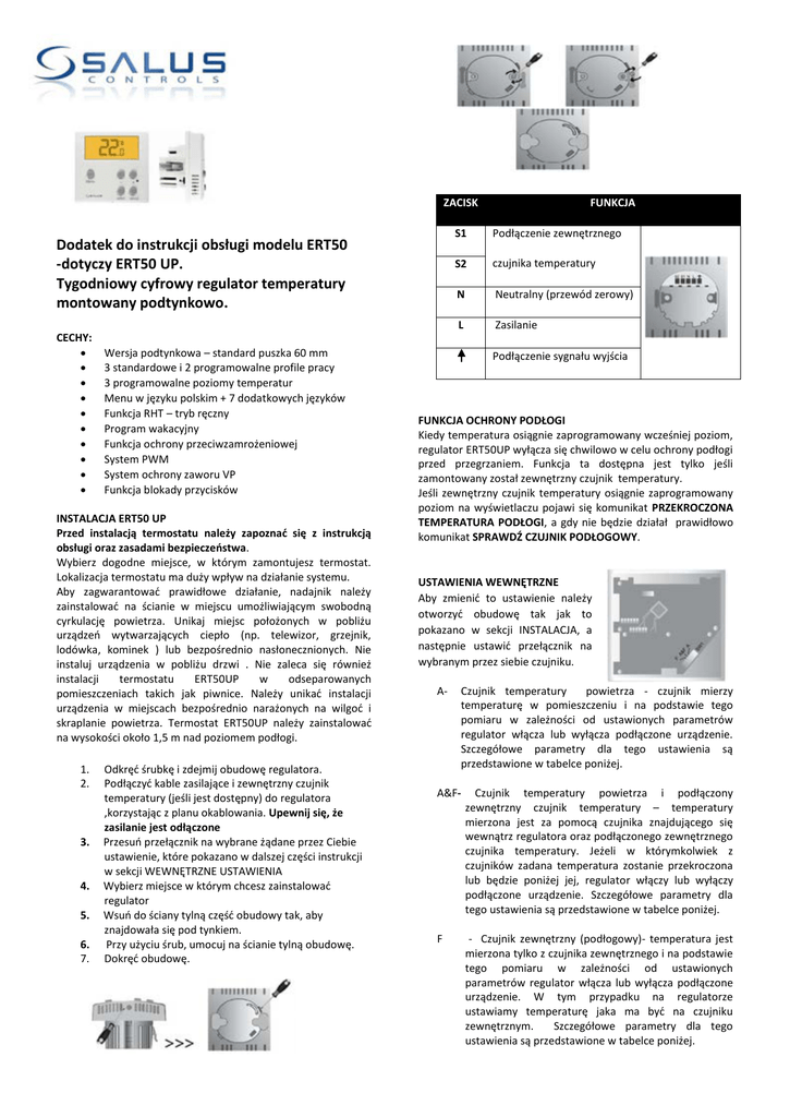 ZACISK Dodatek do instrukcji obsługi modelu ERT50 -dotyczy ERT50 UP. Tygodniowy cyfrowy regulator temperatury montowany podtynkowo. CECHY: Wersja podtynkowa – standard puszka 60 mm 3 standardowe i 2 programowalne profile pracy 3 programowalne poziomy temperatur Menu w języku polskim + 7 dodatkowych języków Funkcja RHT – tryb ręczny Program wakacyjny Funkcja ochrony przeciwzamrożeniowej System PWM System ochrony zaworu VP Funkcja blokady przycisków INSTALACJA ERT50 UP Przed instalacją termostatu należy zapoznad się z instrukcją obsługi oraz zasadami bezpieczeostwa. Wybierz dogodne miejsce, w którym zamontujesz termostat. Lokalizacja termostatu ma duży wpływ na działanie systemu. Aby zagwarantowad prawidłowe działanie, nadajnik należy zainstalowad na ścianie w miejscu umożliwiającym swobodną cyrkulację powietrza. Unikaj miejsc położonych w pobliżu urządzeo wytwarzających ciepło (np. telewizor, grzejnik, lodówka, kominek ) lub bezpośrednio nasłonecznionych. Nie instaluj urządzenia w pobliżu drzwi . Nie zaleca się również instalacji termostatu ERT50UP w odseparowanych pomieszczeniach takich jak piwnice. Należy unikad instalacji urządzenia w miejscach bezpośrednio narażonych na wilgod i skraplanie powietrza. Termostat ERT50UP należy zainstalowad na wysokości około 1,5 m nad poziomem podłogi. 1. 2. 3. 4. 5. 6. 7. Odkręd śrubkę i zdejmij obudowę regulatora. Podłączyd kable zasilające i zewnętrzny czujnik temperatury (jeśli jest dostępny) do regulatora ,korzystając z planu okablowania. Upewnij się, że zasilanie jest odłączone Przesuo przełącznik na wybrane żądane przez Ciebie ustawienie, które pokazano w dalszej części instrukcji w sekcji WEWNĘTRZNE USTAWIENIA Wybierz miejsce w którym chcesz zainstalowad regulator Wsuo do ściany tylną częśd obudowy tak, aby znajdowała się pod tynkiem. Przy użyciu śrub, umocuj na ścianie tylną obudowę. Dokręd obudowę. FUNKCJA S1 Podłączenie zewnętrznego S2 czujnika temperatury N Neutralny (przewód zerowy) L Zasilanie Podłączenie sygnału wyjścia FUNKCJA OCHRONY PODŁOGI Kiedy temperatura osiągnie zaprogramowany wcześniej poziom, regulator ERT50UP wyłącza się chwilowo w celu ochrony podłogi przed przegrzaniem. Funkcja ta dostępna jest tylko jeśli zamontowany został zewnętrzny czujnik temperatury. Jeśli zewnętrzny czujnik temperatury osiągnie zaprogramowany poziom na wyświetlaczu pojawi się komunikat PRZEKROCZONA TEMPERATURA PODŁOGI, a gdy nie będzie działał prawidłowo komunikat SPRAWDŹ CZUJNIK PODŁOGOWY. USTAWIENIA WEWNĘTRZNE Aby zmienid to ustawienie należy otworzyd obudowę tak jak to pokazano w sekcji INSTALACJA, a następnie ustawid przełącznik na wybranym przez siebie czujniku. A- Czujnik temperatury powietrza - czujnik mierzy temperaturę w pomieszczeniu i na podstawie tego pomiaru w zależności od ustawionych parametrów regulator włącza lub wyłącza podłączone urządzenie. Szczegółowe parametry dla tego ustawienia są przedstawione w tabelce poniżej. A&F- Czujnik temperatury powietrza i podłączony zewnętrzny czujnik temperatury – temperatury mierzona jest za pomocą czujnika znajdującego się wewnątrz regulatora oraz podłączonego zewnętrznego czujnika temperatury. Jeżeli w którymkolwiek z czujników zadana temperatura zostanie przekroczona lub będzie poniżej jej, regulator włączy lub wyłączy podłączone urządzenie. Szczegółowe parametry dla tego ustawienia są przedstawione w tabelce poniżej. F - Czujnik zewnętrzny (podłogowy)- temperatura jest mierzona tylko z czujnika zewnętrznego i na podstawie tego pomiaru w zależności od ustawionych parametrów regulator włącza lub wyłącza podłączone urządzenie. W tym przypadku na regulatorze ustawiamy temperaturę jaka ma byd na czujniku zewnętrznym. Szczegółowe parametry dla tego ustawienia są przedstawione w tabelce poniżej. KARTA GWARANCYJNA ZAKRES USTAWIEO A / A&F F Nazwa firmy ……………………………………………………………………………………………………… Zakres wyświetlania temperatury 5˚C-45˚C (A) 5˚C-65˚C (F) 5˚C-45˚C Ustawienie zakresu temperatury 10˚C-35˚C (A) 5˚C-45˚C Ustawienie limitu temperatury czujnika podłogowego 20˚C-45˚C w trybie grzania 10˚C-25˚C w trybie chłodzenia 20˚C-45˚C w trybie grzania CZUJNIK PODŁOGOWY (F) Czujnik podłogowy wyłącza regulator, kiedy zostanie osiągnięta ustawiona temperatura oraz chroni podłogę przed przegrzaniem. Regulator ERT50UP jest kompatybilny z czujnikiem podłogowym Salus FS300. Adres ……………………………………………………………………………………………………… Tel./Fax ……………………………………………………………………………………………………… …………………………………. …………………………………………. Miejscowość I data pieczęć I podpis sprzedawcy WARUNKI GWARANCJI 1. Producent udziela gwarancji na sprawne działanie produktu w okresie 24 miesięcy od daty zakupu, potwierdzonej pieczęcią I podpisem sprzedawcy. 2. W okresie gwarancyjnym zapewnia się użytkownikowi bezpłatną wymianę urządzenia na nowe (ten sam typ/model) lub usunięcie uszkodzeo powstałych z powodu wad fabrycznych. 3. Gwarancja nie obejmuje uszkodzeo powstałych w wyniku: a) Uszkodzeo chemicznych, mechanicznych z winy użytkownika, b) Nieprawidłowego montażu, wykonanego niezgodnie z instrukcją montażu, c) Nie przestrzegania instrukcji obsługi oraz warunków bezpieczeostwa, d) Użytkowania urządzenia niezgodnie z przeznaczeniem. 4. Nabywca traci uprawnienia z tytułu gwarancji w przypadku: SCHEMATY PODŁĄCZEO a) Schemat 1. Uszkodzeo powstałych z winy użytkownika powodujących trwałe pogorszenie jakości urządzenia, b) Niewłaściwe użytkowanie – niezgodnie z instrukcją obsługi i montażu, c) Ingerencji serwisowej osób nieupoważniony