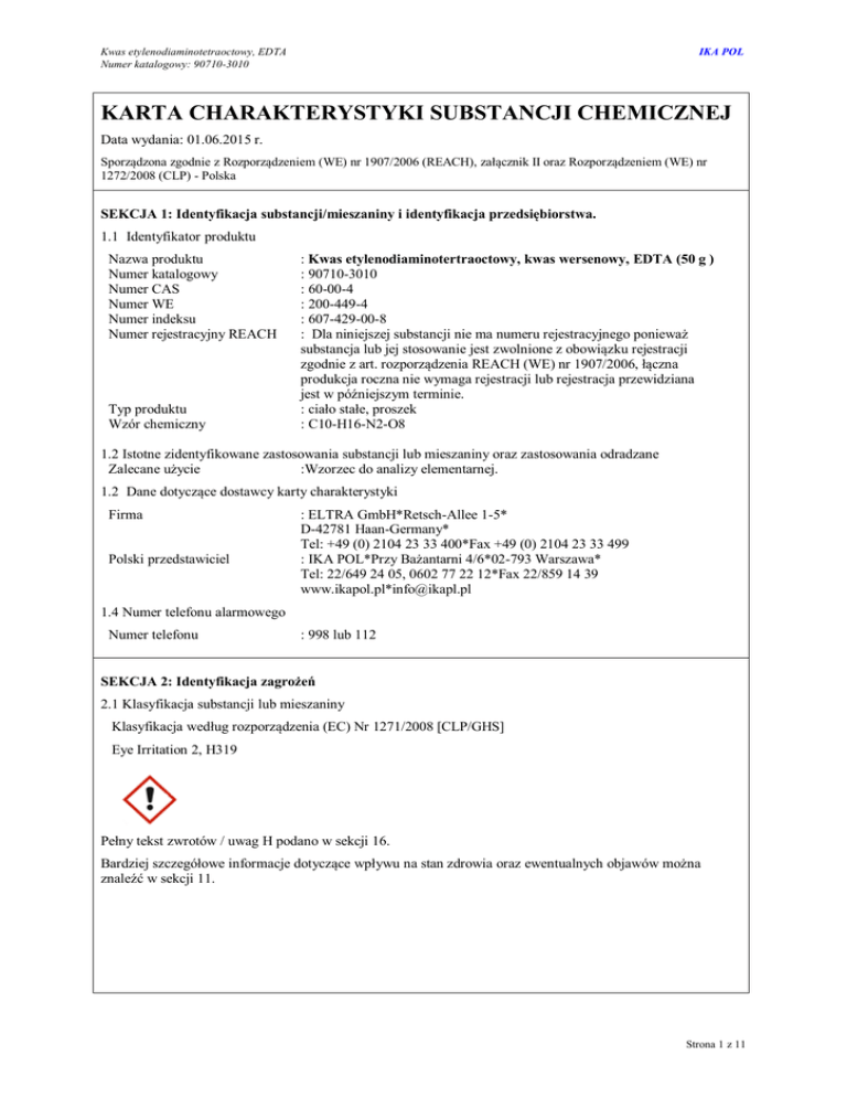 Kwas etylenodiaminotetraoctowy, EDTA Numer katalogowy: 90710-3010 IKA POL KARTA CHARAKTERYSTYKI SUBSTANCJI CHEMICZNEJ Data wydania: 01.06.2015 r. Sporządzona zgodnie z Rozporządzeniem (WE) nr 1907/2006 (REACH), załącznik II oraz Rozporządzeniem (WE) nr 1272/2008 (CLP) - Polska SEKCJA 1: Identyfikacja substancji/mieszaniny i identyfikacja przedsiębiorstwa. 1.1 Identyfikator produktu Nazwa produktu Numer katalogowy Numer CAS Numer WE Numer indeksu Numer rejestracyjny REACH Typ produktu Wzór chemiczny : Kwas etylenodiaminotertraoctowy, kwas wersenowy, EDTA (50 g ) : 90710-3010 : 60-00-4 : 200-449-4 : 607-429-00-8 : Dla niniejszej substancji nie ma numeru rejestracyjnego ponieważ substancja lub jej stosowanie jest zwolnione z obowiązku rejestracji zgodnie z art. rozporządzenia REACH (WE) nr 1907/2006, łączna produkcja roczna nie wymaga rejestracji lub rejestracja przewidziana jest w późniejszym terminie. : ciało stałe, proszek : C10-H16-N2-O8 1.2 Istotne zidentyfikowane zastosowania substancji lub mieszaniny oraz zastosowania odradzane Zalecane użycie :Wzorzec do analizy elementarnej. 1.2 Dane dotyczące dostawcy karty charakterystyki Firma Polski przedstawiciel : ELTRA GmbH*Retsch-Allee 1-5* D-42781 Haan-Germany* Tel: +49 (0) 2104 23 33 400*Fax +49 (0) 2104 23 33 499 : IKA POL*Przy Bażantarni 4/6*02-793 Warszawa* Tel: 22/649 24 05, 0602 77 22 12*Fax 22/859 14 39 www.ikapol.pl*[email protected] 1.4 Numer telefonu alarmowego Numer telefonu : 998 lub 112 SEKCJA 2: Identyfikacja zagrożeń 2.1 Klasyfikacja substancji lub mieszaniny Klasyfikacja według rozporządzenia (EC) Nr 1271/2008 [CLP/GHS] Eye Irritation 2, H319 Pełny tekst zwrotów / uwag H podano w sekcji 16. Bardziej szczegółowe informacje dotyczące wpływu na stan zdrowia oraz ewentualnych objawów można znaleźć w sekcji 11. Strona 1 z 11 Kwas etylenodiaminotetraoctowy, EDTA Numer katalogowy: 90710-3010 IKA POL 2.2 Elementy oznakowania Piktogramy zagrożeń Hasło ostrzegawcze : Uwaga Zwroty wskazujące rodzaj zagrożenia Zwroty wskazujące środki ostrożności : Działa drażniąco na oczy. : P101 W razie konieczności zasięgnięcia porady lekarskiej pokazać pojemnik lub etykietę. P102 Chronić przed dziećmi. P103 Przed użyciem przeczytać etykietę. P264 Dokładnie umyć … po użyciu. P280 Stosować rękawice ochronne. Nosić okulary ochronne lub ochronę twarzy. P305+P351+P338 W PRZYPADKU DOSTANIA SIĘ DO OCZU: Ostrożnie płukać wodą przez kilka minut. Wyjąć soczewki kontaktowe, jeżeli są i można je łatwo usunąć. Nadal płukać. P333+P313W przypadku wystąpienia podrażnienia skóry lub wysypki: Zasięgnąć porady/ zgłosić się pod opiekę lekarza. P304+P340 W PRZYPADKU DOSTANIA SIĘ DO DRÓG ODDECHOWYCH: wyprowadzić lub wynieść poszkodowanego na świeże powietrze i zapewnić warunki do odpoczynku w pozycji umożliwiającej swobodne oddychanie. P302+P352+P363 W PRZYPADKU KONTAKTU ZE SKÓRĄ: umyć dużą ilością wody z mydłem. Wyprać zanieczyszczoną odzież przed ponownym użyciem. 2.3 Inne zagrożenia Substancja spełnia kryteria dla jej zaklasyfikowania jako PBT zgodnie z Rozporządzeniem (WE) Nr 1907/2006, Aneks XIII Substancja spełnia kryteria dla jej zaklasyfikowania jako vPvB zgodnie z Rozporządzeniem (WE) Nr 1907/2006, Aneks XIII Inne zagrożenia nie odzwierciedlone w klasyfikacji : Nie. P: Niedostępne. B: Niedostępne. T: Nie. : Niedostępne. : Drobny pył może tworzyć wybuchowe mieszaniny z powietrzem. Wytworzony pył może powodować mechaniczne podrażnienie oczu, skóry, nosa i gardła. SEKCJA 3: Skład/Informacja o składnikach Nazwa produktu/składnika Identyfikatory % Klasyfikacja Typ Rozporządzenie (WE) Nr 1272/2008 [CLP] Kwas etylenodiaminotertaoctowy WE: 200-449-4 CAS: 60-00-4 Indeks: 607-429-00-8 100 Eye Irritation 2, H319 [A] Patrz Sekcja 16 – pełny tekst powyższych uwag H. Nie ma dodatkowych składników, które według obecnej wiedzy dostawcy są sklasyfikowane i przyczyniają się do klasyfikacji substancji, i w związku z tym wymagają ich podania w tej sekcji. Typ. Strona 2 z 11 Kwas etylenodiaminotetraoctowy, EDTA Numer katalogowy: 90710-3010 IKA POL [A] Skład [B] Zanieczyszczenie [C] Dodatek stabilizujący Najwyższe dopuszczalne stężenia, jeśli są dostępne, są wymienione w części 8. SEKCJA 4: Środki pierwszej pomocy 4.1 Opis środków pierwszej pomocy Kontakt z okiem : Natychmiast przepłukać oczy dużą ilością wody, od czasu do czasu podnosząc górną i dolną powiekę. Usunąć szkła kontaktowe jeżeli są. Należy kontynuować płukanie przez co najmniej 10 minut. Zasięgnąć porady lekarskiej, jeśli pojawi się podrażnienie. Wdychanie : Wynieść narażoną osobę na świeże powietrze. Zapewnić osobie ciepło i spokój. Jeżeli osoba nie oddycha, oddycha nieregularnie lub gdy oddychanie ustało, wykwalifikowany personel powinien wykonać sztuczne oddychanie lub podać tlen. Sztuczne oddychanie usta usta może być niebezpieczne dla osoby udzielającej takiej pomocy. Należy wezwać pomoc medyczną w przypadku dalszego występowania objawów lub w przypadku ich nasilenia się. W przypadku utraty przytomności, należy osobę poszkodowaną ułożyć w pozycji bocznej ustalonej i natychmiast wezwać pomoc medyczną. Zapewnić otwartą wentylację. Rozluźnić ciasną odzież, na przykład kołnierz, krawat lub pasek. W razie wdychania produktów rozkładu powstających podczas pożaru, wystąpienie objawów może być opóźnione. Narażona osoba może wymagać nadzoru lekarskiego przez 48 godzin. Kontakt ze skórą: : Spłukać skażoną skórę dużą ilością wody. Zdjąć skażoną odzież i buty. Należy założyć rękawice przed zdjęciem zanieczyszczonego ubrania. Jeśli pojawią się objawy, zasięgnąć porady lekarskiej. W przypadku uskarżania się na zdrowie lub występowanie objawów należy unikać ponownego narażenia. Spożycie : Przemyć usta wodą. Jeżeli preparat został połknięty, a narażona 