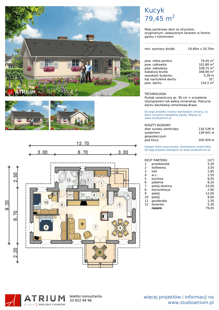 Kucyk 79,45 m2 Mały parterowy dom ze strychem, oryginalnym, zadaszonym tarasem w formie ganku z kolumnami min. wymiary działki pow. netto parteru pow. całkowita pow. zabudowy kubatura brutto wysokość budynku kąt nachylenia dachu pow. dachu 19,40m x 20,70m 79.45 m2 101,80 m2 109,75 m2 348,90 m3 5.28 m 31° 154.5 m2 TECHNOLOGIA Pustak ceramiczny gr. 30 cm + ocieplenie (styropianem lub wełną mineralną). Pokrycie dachu dachówką cementową Braas. Do tego projektu możesz wprowadzić zmiany, na które wyrazimy bezpłatną zgodę. Więcej na www.studioatrium.pl KOSZTY BUDOWY stan surowy zamknięty systemem gospodarczym pod klucz 116 539 zł 138 641 zł 200 929 zł Uwaga! Dane szacunkowe. Zestawienie materiałów do tego projektu dostępne na www.studioatrium.pl RZUT PARTERU 1 przedsionek 2 kotłownia 3 hall 4 w.c. 5 kuchnia 6 jadalnia 7 pokój dzienny 8 komunikacja 9 pokój 10 pokój 11 garderoba 12 łazienka razem telefon konsultanta 33 822 94 96 Powered by TCPDF (www.tcpdf.org) [m2] 3,30 3,50 1,85 1,55 8,55 8,10 23,00 2,90 12,05 8,00 1,35 5,30 79,45 więcej projektów i informacji na www.studioatrium.pl