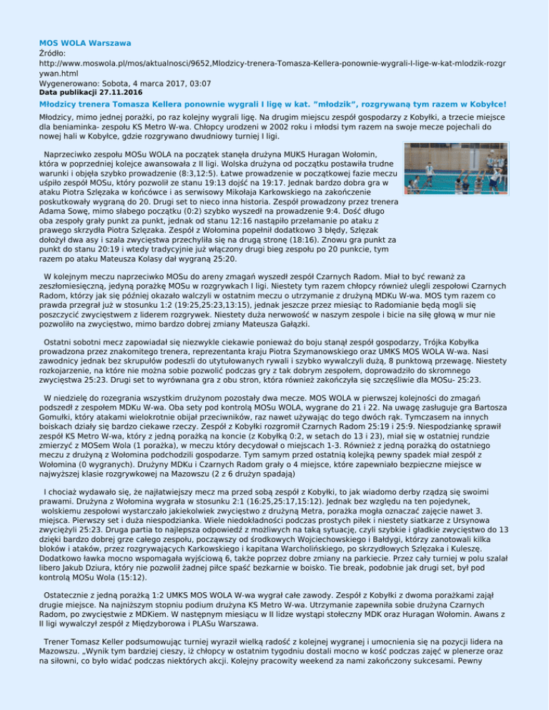 MOS WOLA Warszawa Źródło: http://www.moswola.pl/mos/aktualnosci/9652,Mlodzicy-trenera-Tomasza-Kellera-ponownie-wygrali-I-lige-w-kat-mlodzik-rozgr ywan.html Wygenerowano: Sobota, 4 marca 2017, 03:07 Data publikacji 27.11.2016 Młodzicy trenera Tomasza Kellera ponownie wygrali I ligę w kat. ”młodzik”, rozgrywaną tym razem w Kobyłce! Młodzicy, mimo jednej porażki, po raz kolejny wygrali ligę. Na drugim miejscu zespół gospodarzy z Kobyłki, a trzecie miejsce dla beniaminka- zespołu KS Metro W-wa. Chłopcy urodzeni w 2002 roku i młodsi tym razem na swoje mecze pojechali do nowej hali w Kobyłce, gdzie rozgrywano dwudniowy turniej I ligi. Naprzeciwko zespołu MOSu WOLA na początek stanęła drużyna MUKS Huragan Wołomin, która w poprzedniej kolejce awansowała z II ligi. Wolska drużyna od początku postawiła trudne warunki i objęła szybko prowadzenie (8:3,12:5). Łatwe prowadzenie w początkowej fazie meczu uśpiło zespół MOSu, który pozwolił ze stanu 19:13 dojść na 19:17. Jednak bardzo dobra gra w ataku Piotra Szlęzaka w końcówce i as serwisowy Mikołaja Karkowskiego na zakończenie poskutkowały wygraną do 20. Drugi set to nieco inna historia. Zespół prowadzony przez trenera Adama Sowę, mimo słabego początku (0:2) szybko wyszedł na prowadzenie 9:4. Dość długo oba zespoły grały punkt za punkt, jednak od stanu 12:16 nastąpiło przełamanie po ataku z prawego skrzydła Piotra Szlęzaka. Zespół z Wołomina popełnił dodatkowo 3 błędy, Szlęzak dołożył dwa asy i szala zwycięstwa przechyliła się na drugą stronę (18:16). Znowu gra punkt za punkt do stanu 20:19 i wtedy tradycyjnie już włączony drugi bieg zespołu po 20 punkcie, tym razem po ataku Mateusza Kolasy dał wygraną 25:20. W kolejnym meczu naprzeciwko MOSu do areny zmagań wyszedł zespół Czarnych Radom. Miał to być rewanż za zeszłomiesięczną, jedyną porażkę MOSu w rozgrywkach I ligi. Niestety tym razem chłopcy również ulegli zespołowi Czarnych Radom, którzy jak się później okazało walczyli w ostatnim meczu o utrzymanie z drużyną MDKu W-wa. MOS tym razem co prawda przegrał już w stosunku 1:2 (19:25,25:23,13:15), jednak jeszcze przez miesiąc to Radomianie będą mogli się poszczycić zwycięstwem z liderem rozgrywek. Niestety duża nerwowość w naszym zespole i bicie na siłę głową w mur nie pozwoliło na zwycięstwo, mimo bardzo dobrej zmiany Mateusza Gałązki. Ostatni sobotni mecz zapowiadał się niezwykle ciekawie ponieważ do boju stanął zespół gospodarzy, Trójka Kobyłka prowadzona przez znakomitego trenera, reprezentanta kraju Piotra Szymanowskiego oraz UMKS MOS WOLA W-wa. Nasi zawodnicy jednak bez skrupułów podeszli do utytułowanych rywali i szybko wywalczyli dużą, 8 punktową przewagę. Niestety rozkojarzenie, na które nie można sobie pozwolić podczas gry z tak dobrym zespołem, doprowadziło do skromnego zwycięstwa 25:23. Drugi set to wyrównana gra z obu stron, która również zakończyła się szczęśliwie dla MOSu- 25:23. W niedzielę do rozegrania wszystkim drużynom pozostały dwa mecze. MOS WOLA w pierwszej kolejności do zmagań podszedł z zespołem MDKu W-wa. Oba sety pod kontrolą MOSu WOLA, wygrane do 21 i 22. Na uwagę zasługuje gra Bartosza Gomułki, który atakami wielokrotnie obijał przeciwników, raz nawet używając do tego dwóch rąk. Tymczasem na innych boiskach działy się bardzo ciekawe rzeczy. Zespół z Kobyłki rozgromił Czarnych Radom 25:19 i 25:9. Niespodziankę sprawił zespół KS Metro W-wa, który z jedną porażką na koncie (z Kobyłką 0:2, w setach do 13 i 23), miał się w ostatniej rundzie zmierzyć z MOSem Wola (1 porażka), w meczu który decydował o miejscach 1-3. Również z jedną porażką do ostatniego meczu z drużyną z Wołomina podchodzili gospodarze. Tym samym przed ostatnią kolejką pewny spadek miał zespół z Wołomina (0 wygranych). Drużyny MDKu i Czarnych Radom grały o 4 miejsce, które zapewniało bezpieczne miejsce w najwyższej klasie rozgrywkowej na Mazowszu (2 z 6 drużyn spadają) I chociaż wydawało się, że najłatwiejszy mecz ma przed sobą zespół z Kobyłki, to jak wiadomo derby rządzą się swoimi prawami. Drużyna z Wołomina wygrała w stosunku 2:1 (16:25,25:17,15:12). Jednak bez względu na ten pojedynek, wolskiemu zespołowi wystarczało jakiekolwiek zwycięstwo z drużyną Metra, porażka mogła oznaczać zajęcie nawet 3. miejsca. Pierwszy set i duża niespodzianka. Wiele niedokładności podczas prostych piłek i niestety siatkarze z Ursynowa zwyciężyli 25:23. Druga partia to najlepsza odpowiedź z możliwych na taką sytuację, czyli szybkie i gładkie zwycięstwo do 13 dzięki bardzo dobrej grze całego zespołu, począwszy od środkowych Wojciechowskiego i Bałdygi, którzy zanotowali kilka bloków i ataków, przez rozgrywających Karkowskiego i kapitana Warcholińskiego, po skrzydłowych Szlęzaka i Kuleszę. Dodatkowo ławka mocno wspomagała wyjściową 6, także poprzez dobre zmiany na parkiecie. Przez cały turniej w polu szalał libero Jakub Dziura, który nie pozwolił żadnej piłce spaść bezkarnie w boisko. Tie break, podobnie jak drugi set, był pod kontrolą MOSu Wola (15:12). Ostatecznie z jedną porażką 1:2 UMKS MOS WOLA W-wa wygrał całe zawody. Zespół z Kobyłki z dwoma porażkami zajął drugie miejsce. Na najniższym stopniu podium drużyna KS Metro W-wa. Utrzymanie zapewniła sobie drużyna Czarnych Radom, po zwycięstwie z MDKiem. W następnym miesiącu w II lidze wystąpi stołeczny MDK oraz Huragan Wołomin. Awans z II ligi wywalczył zespół z Międzyborowa i PLASu Warszawa. Trener Tomasz Keller podsumowując turniej wyraził wielką radość z kolejnej wygranej i umocnienia się na pozycji lidera na Mazowszu. „Wynik tym bardziej cieszy, iż chłopcy w ostatnim tygodniu dostali mocno w kość podczas zajęć w plenerze oraz na siłowni, co było widać podczas niektórych akcji. Kolejny pracowity week